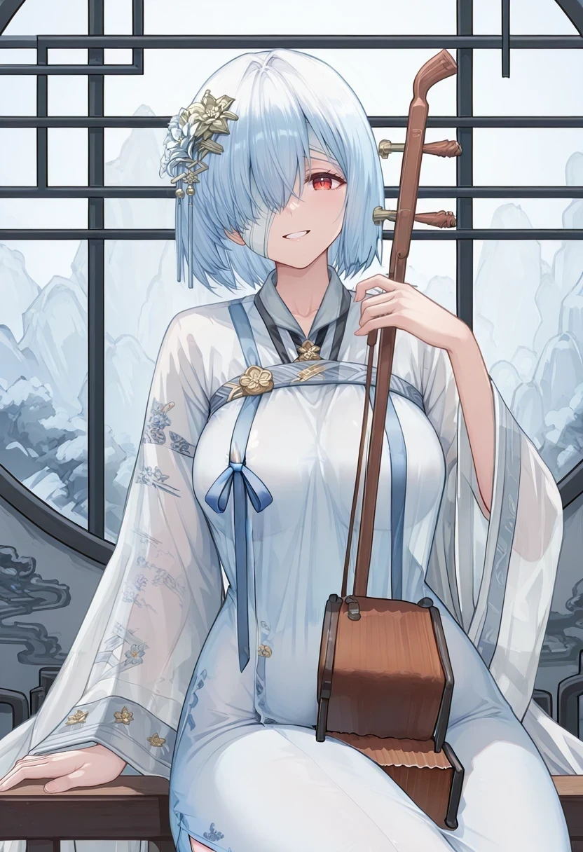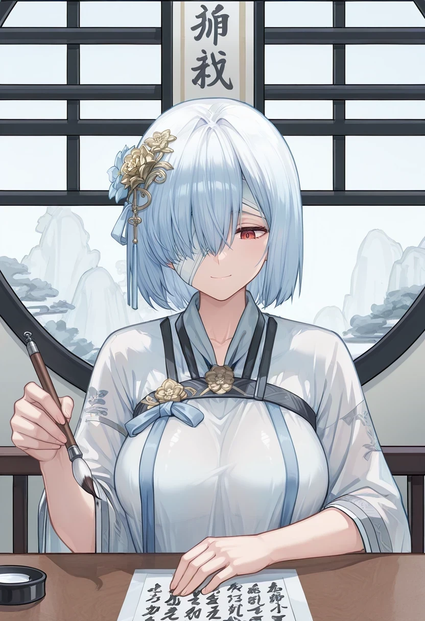 chinese clothes,hair flower,blue ribbon,shirt ribbon,Description