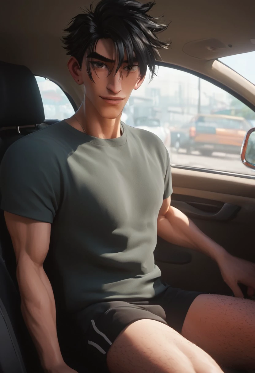 1boy, solo, male focus, toned male, black hair, spiky hair, messy hair,