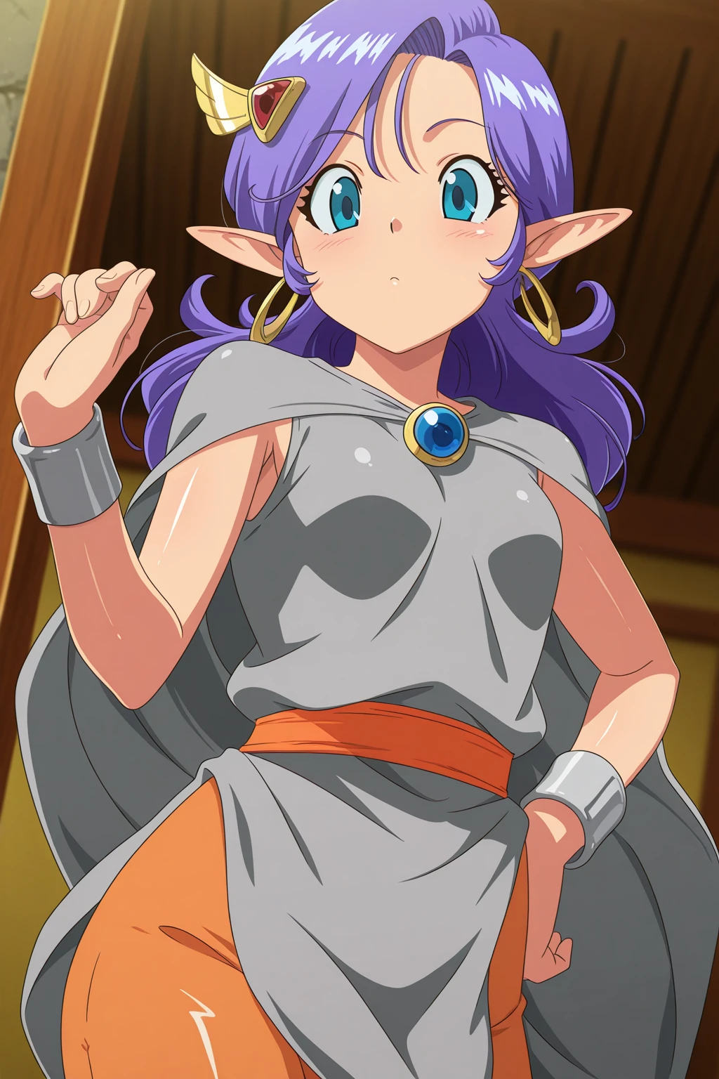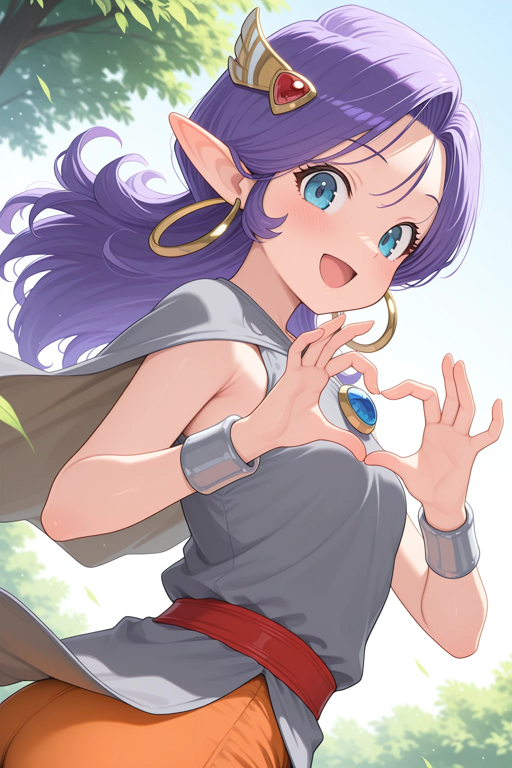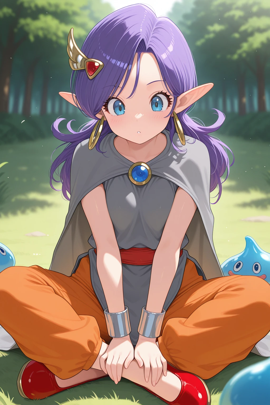 BLDragonQuest, purple hair, parted bangs, blue eyes, eyelashes, pointy ears, hair ornament, red gemstone, hoop earrings, grey cape, blue gemstone, grey shirt, sleeveless, bracelet, red sash, orange pants, red shoes