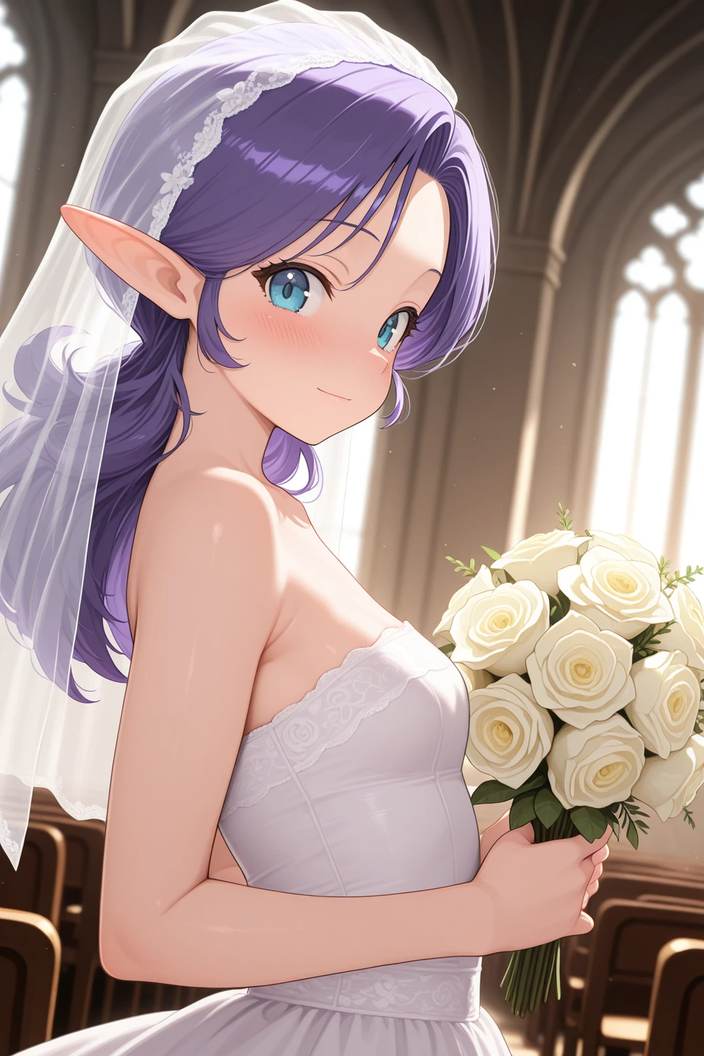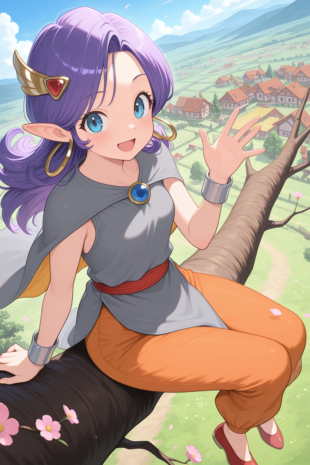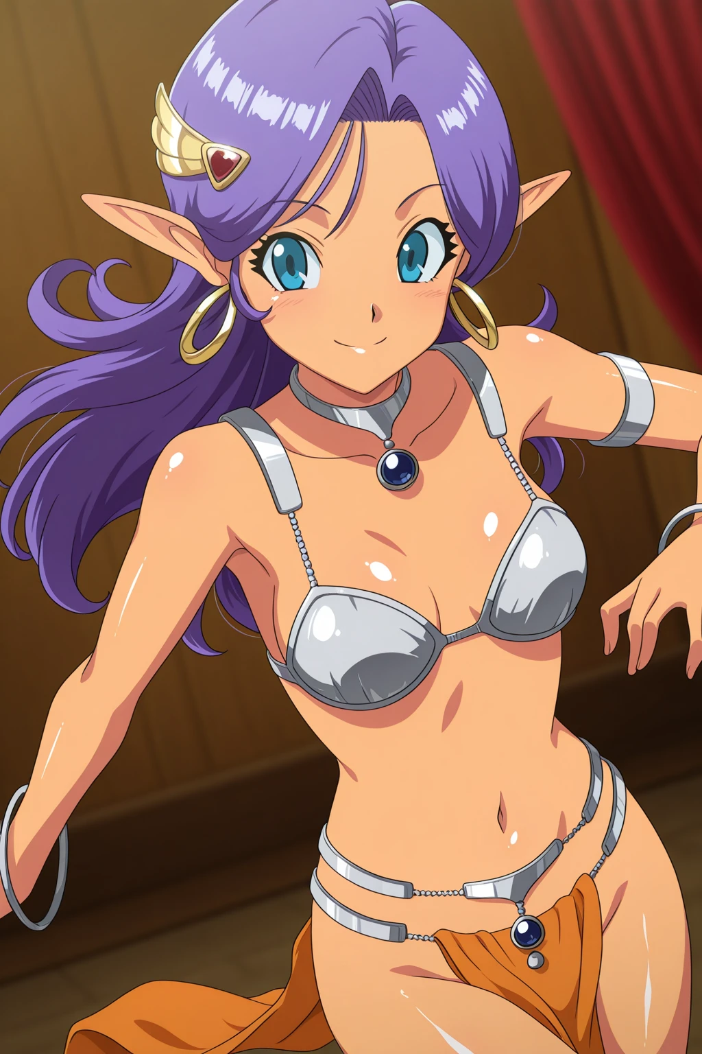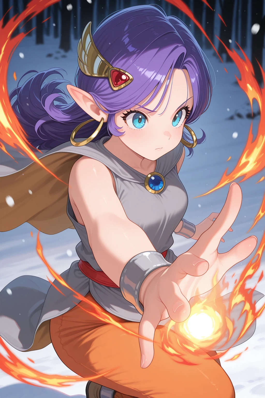 BLDragonQuest, purple hair, parted bangs, blue eyes, eyelashes, pointy ears, hair ornament, red gemstone, hoop earrings, grey cape, blue gemstone, grey shirt, sleeveless, bracelet, red sash, orange pants, red shoes