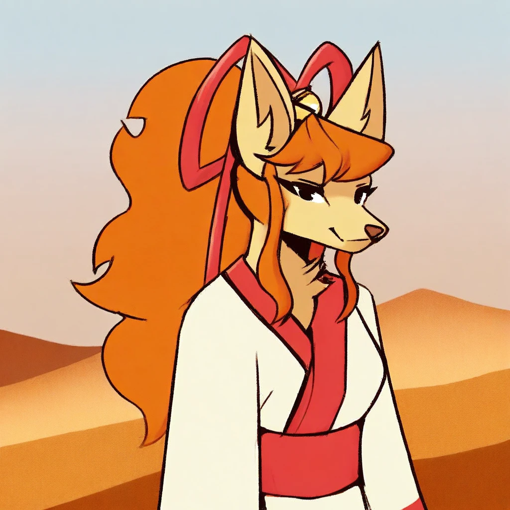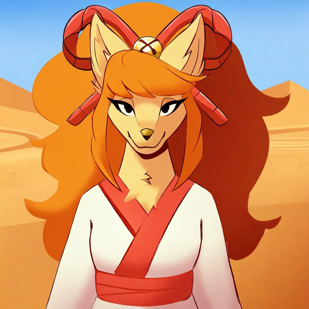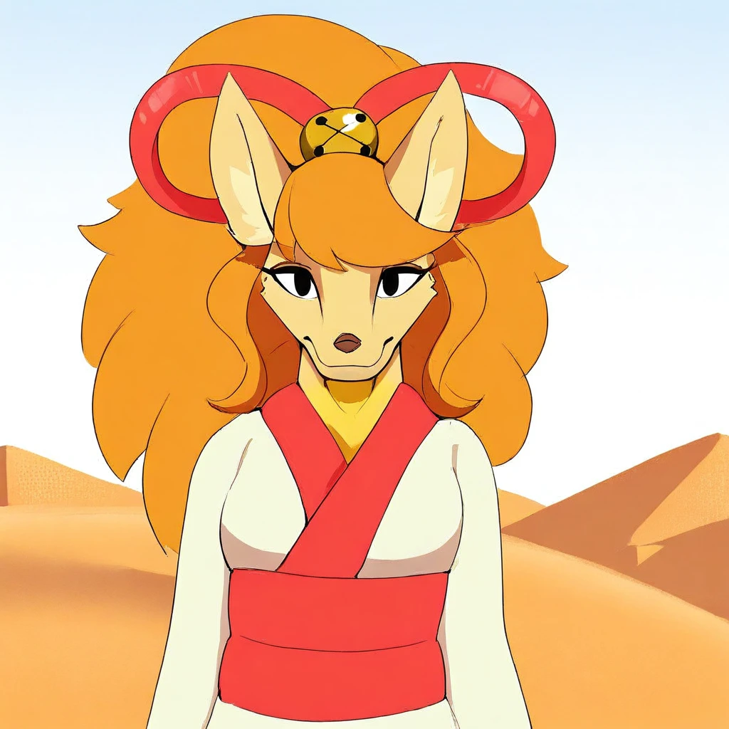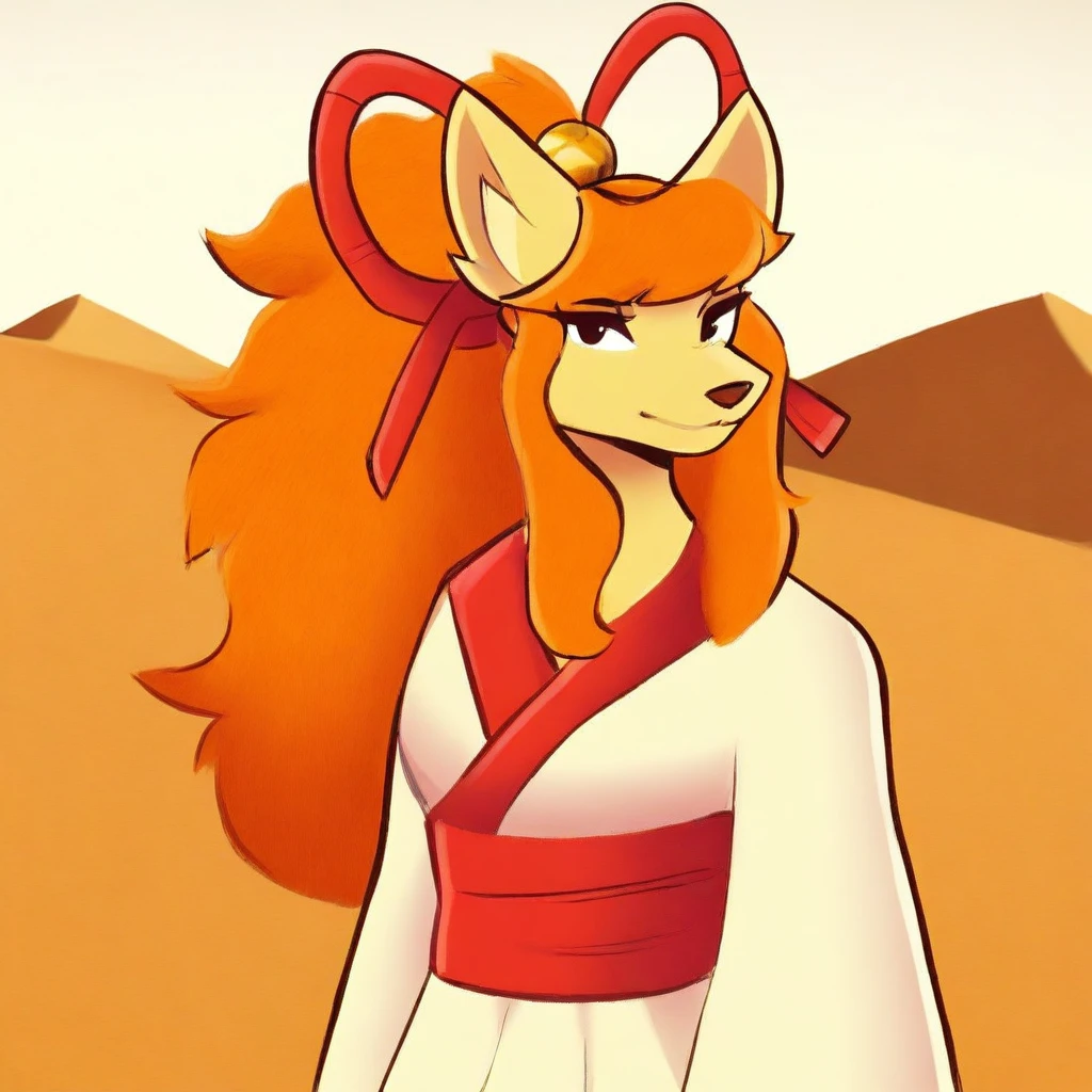 Ceroba-uty, 1girl, solo, furry female, fox, black eyes, beige fur, orange hair, ponytail, long hair, ornament hair, sidelocks, animal nose, red ribbon, hair ribbon, yellow bell, white kimono with red trimmings, red sash, white boots,
