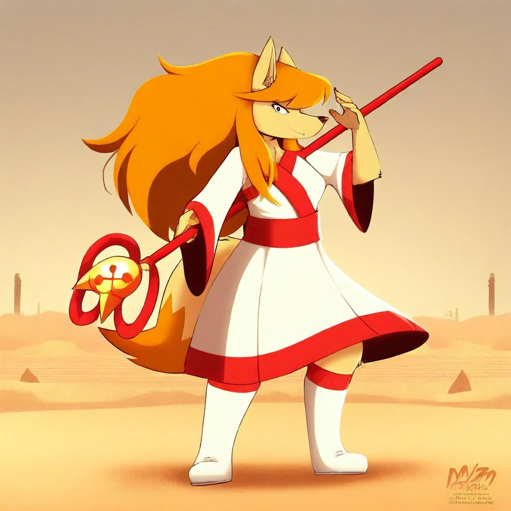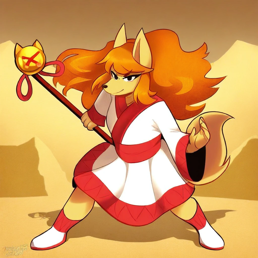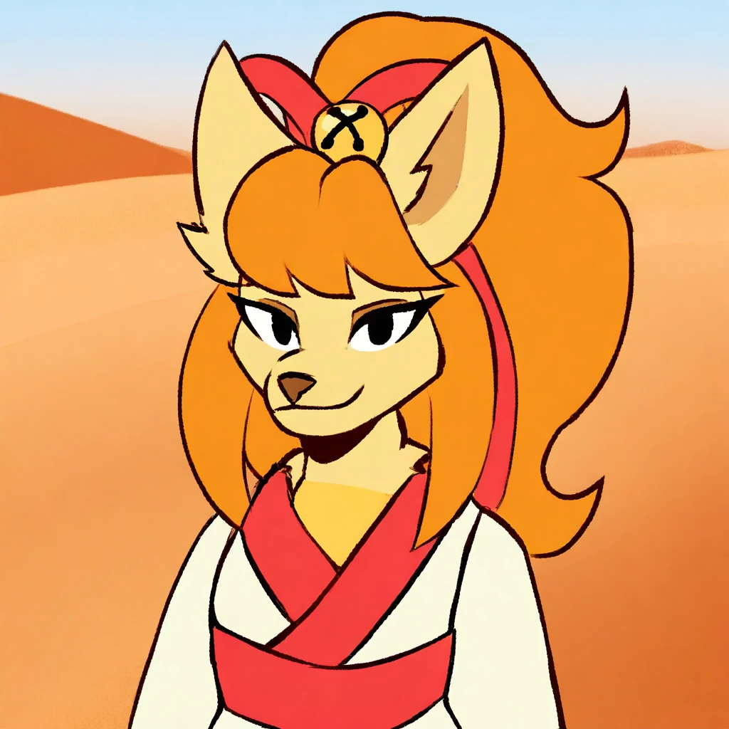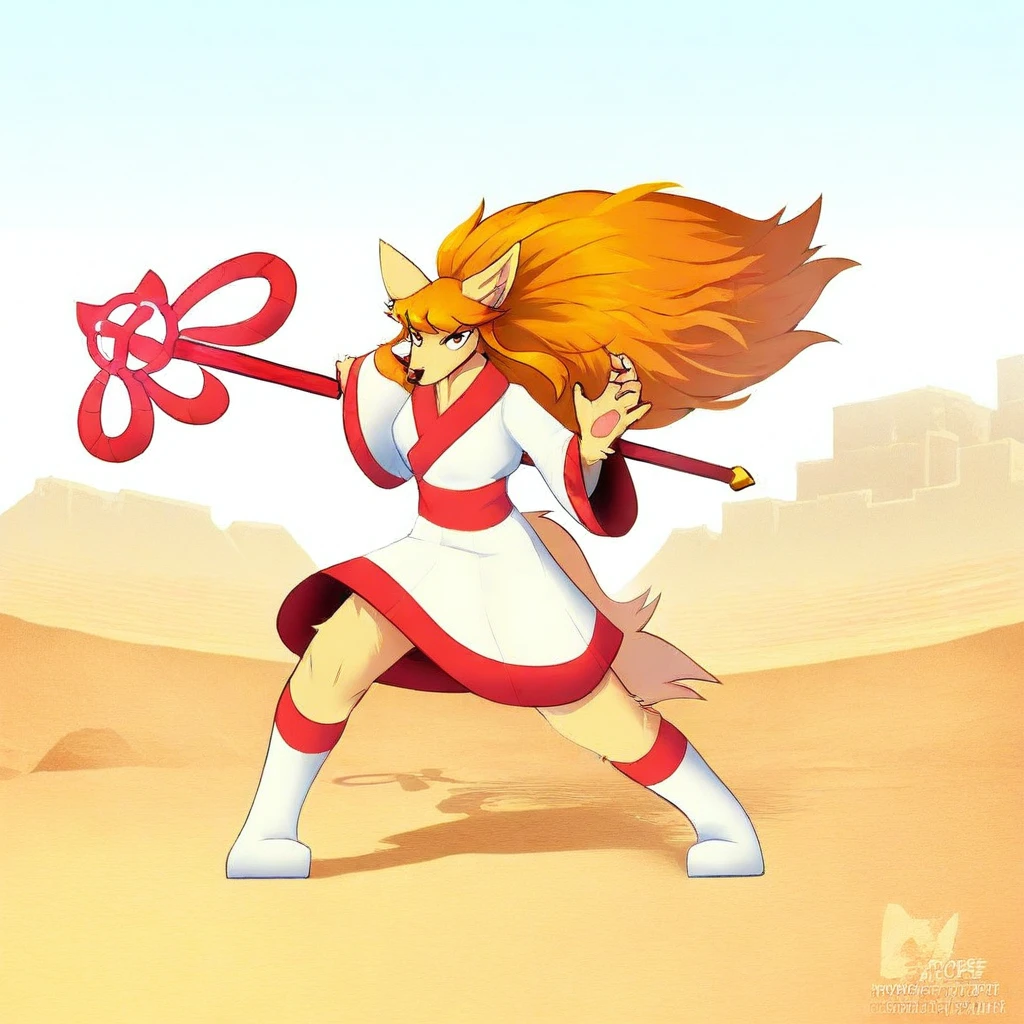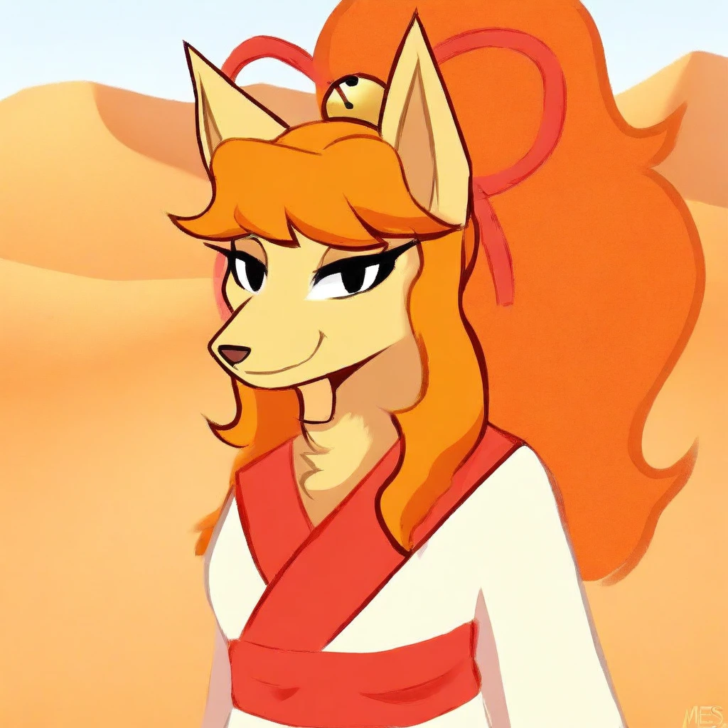 Ceroba-uty, 1girl, solo, furry female, fox, black eyes, beige fur, orange hair, ponytail, long hair, ornament hair, sidelocks, animal nose, red ribbon, hair ribbon, yellow bell, white kimono with red trimmings, red sash, white boots,