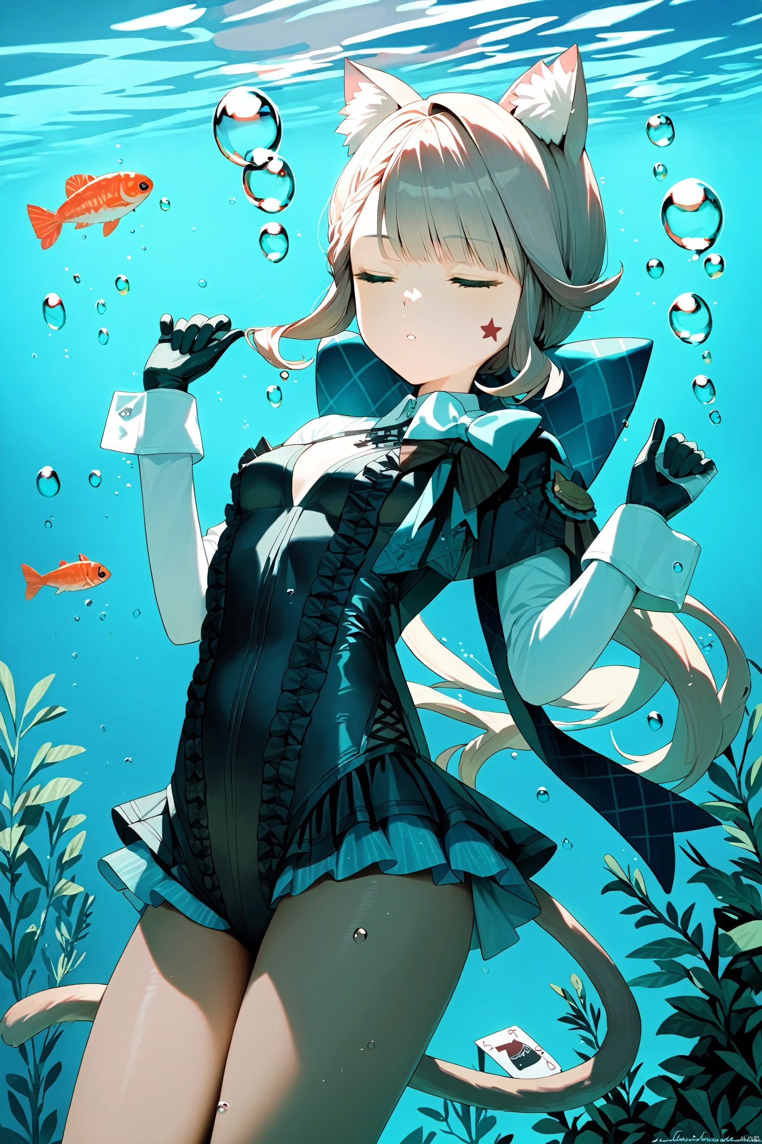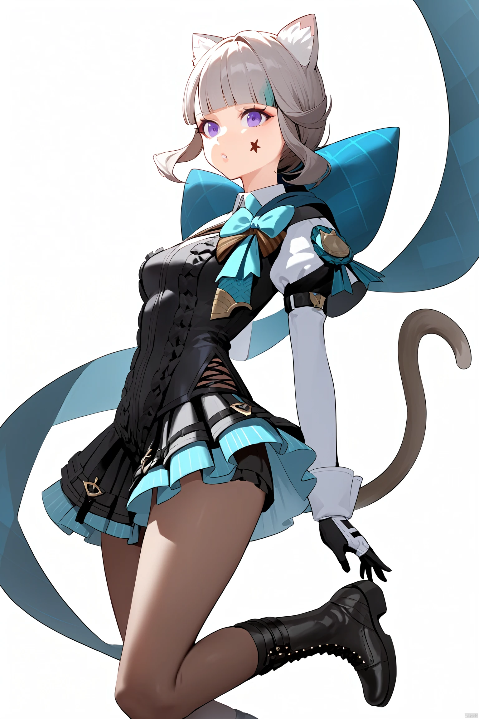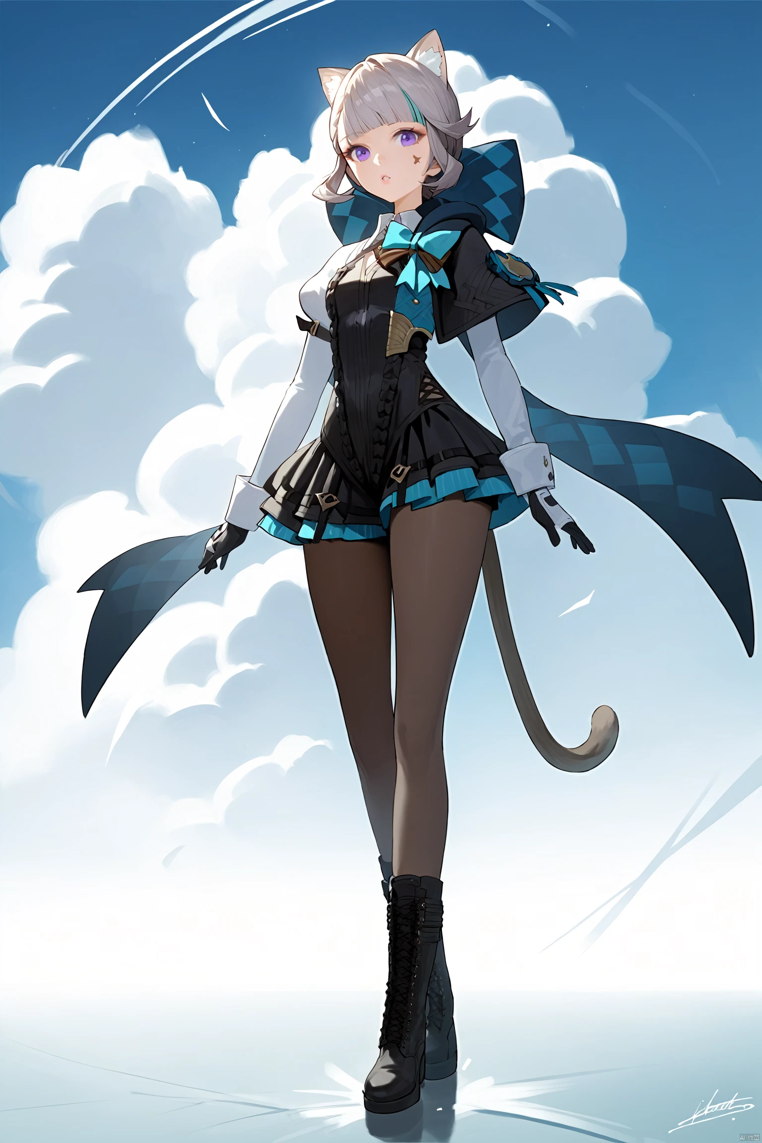 lnt, def clothe, car ears, 1girl,cat tail,pantyhose, boots, purple eyes, black footwear, black gloves, cross-laced footwear, grey hair, hood, multicolored hair, puffy sleeves,