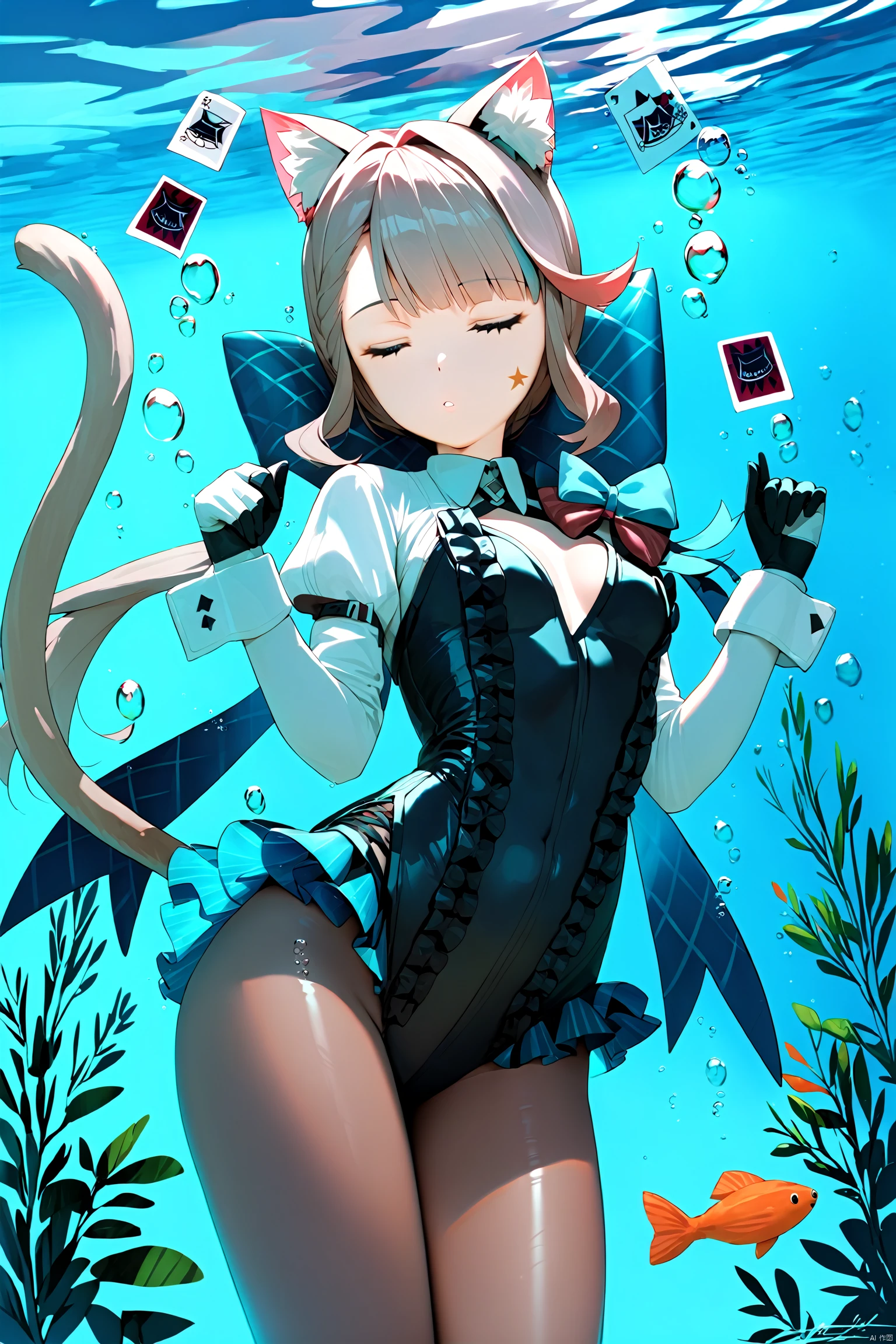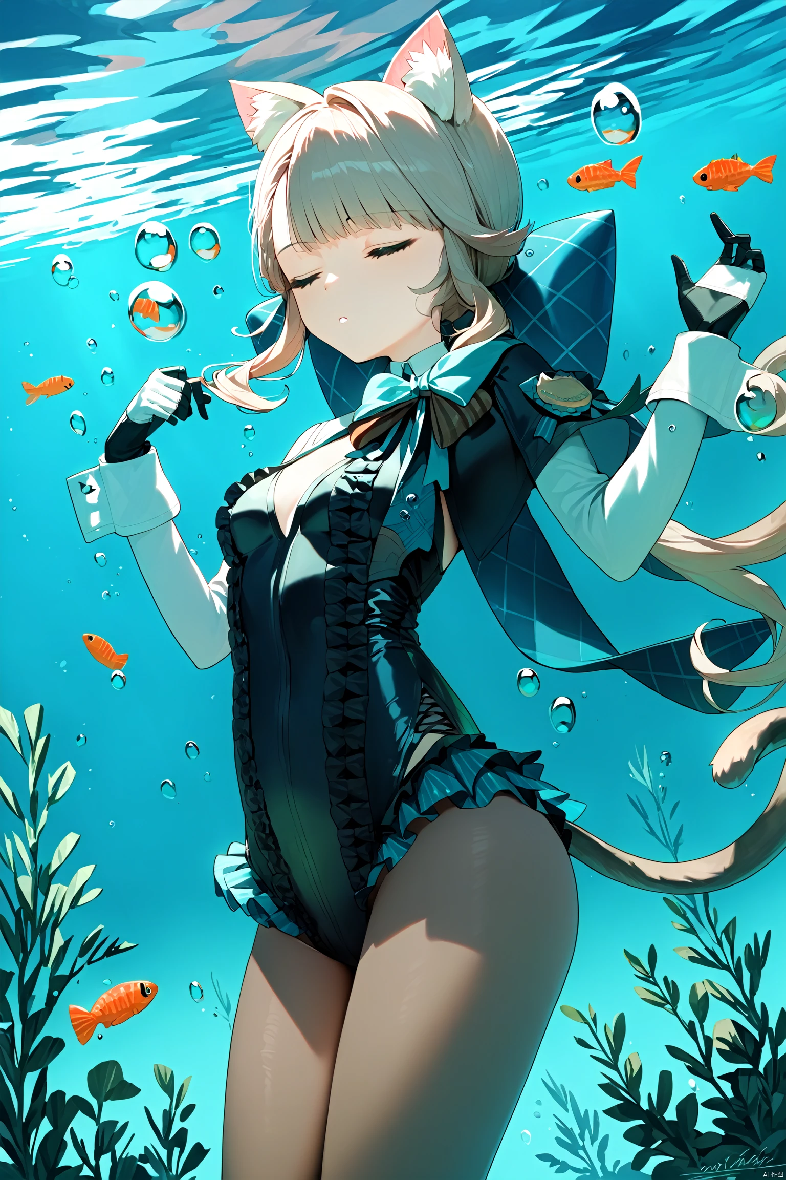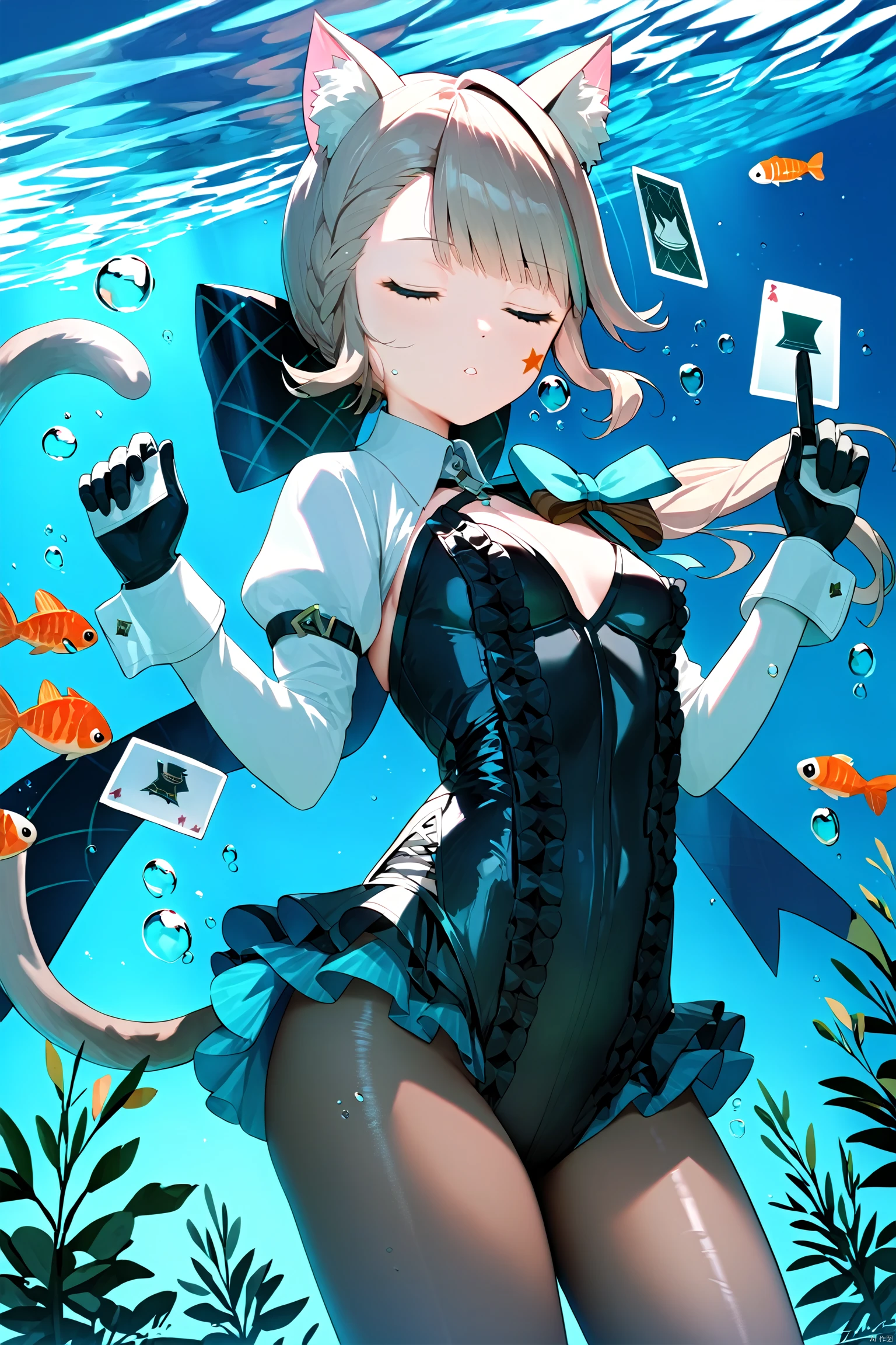 lnt, def clothe, car ears, 1girl,cat tail,pantyhose, boots, purple eyes, black footwear, black gloves, cross-laced footwear, grey hair, hood, multicolored hair, puffy sleeves,
