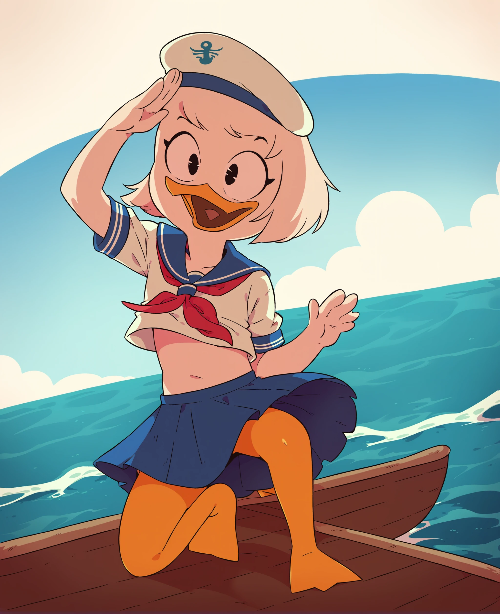 webby vanderquack, ducktales, duck, beak, scut tail, white skin, white hair, short hair, eyeliner, orange legs, webbed feet, black eyes,