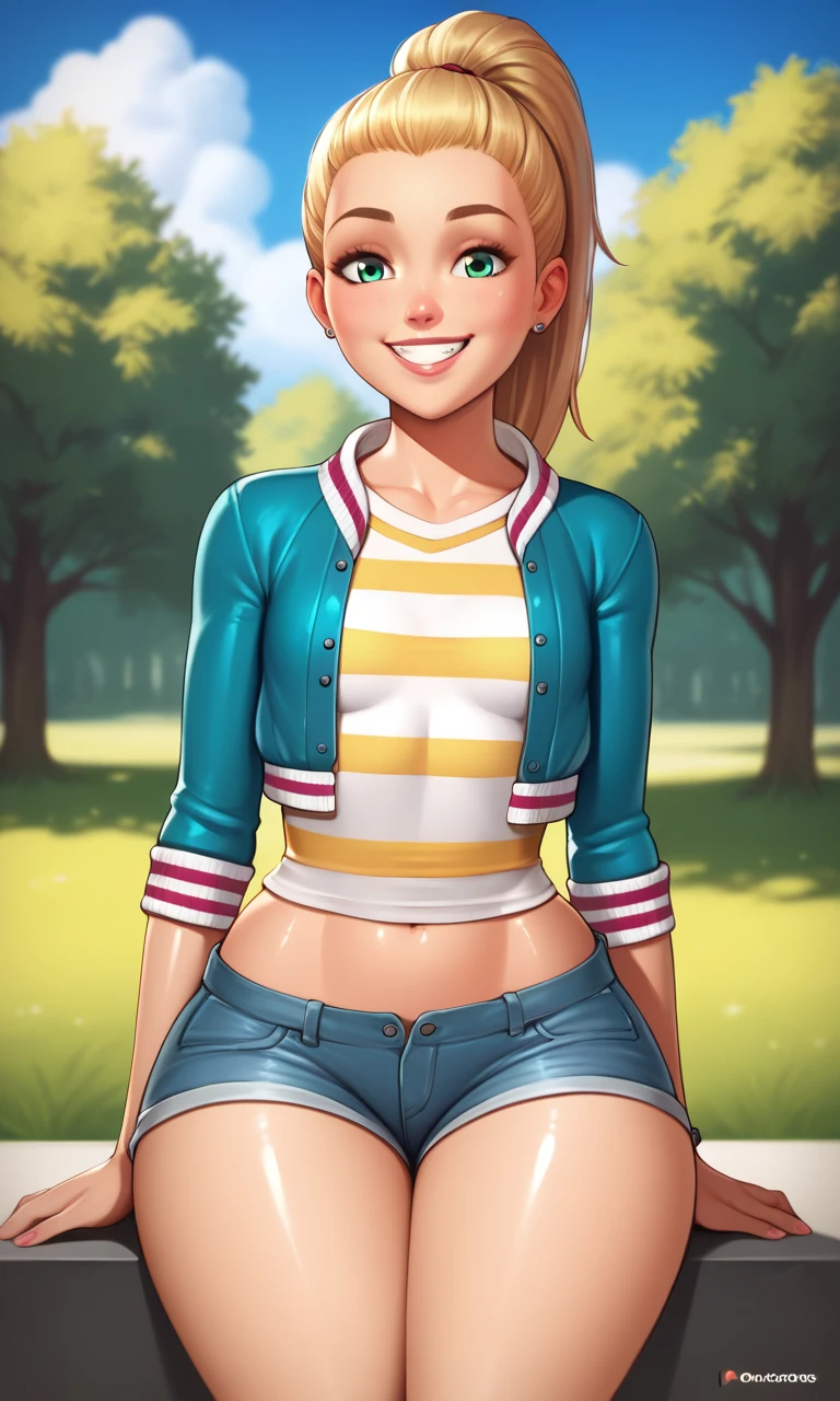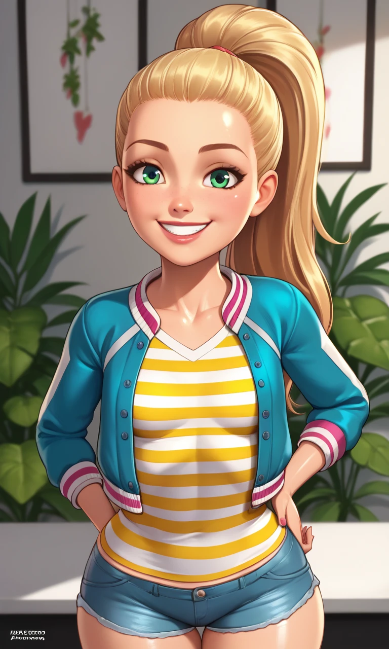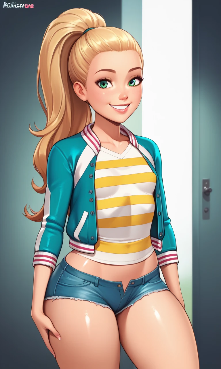 StacieRoberts, 1girl, green eyes, blonde hair, long hair, hair slicked back, high ponytail,