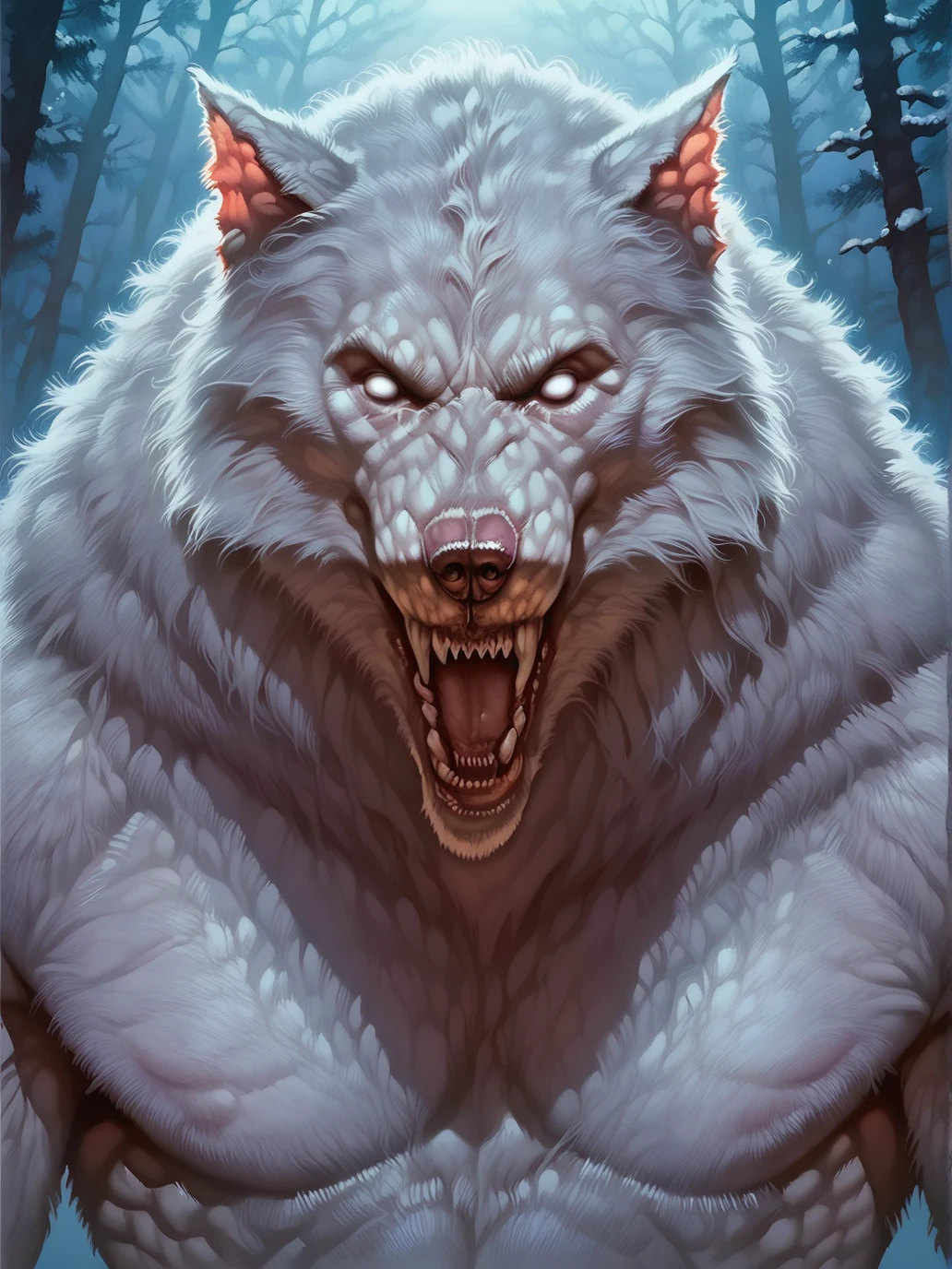 willcorv_v2, 1boy, werewolf, no pupils, shaggy white long fur, sharp teeth, white fur, white eyes
