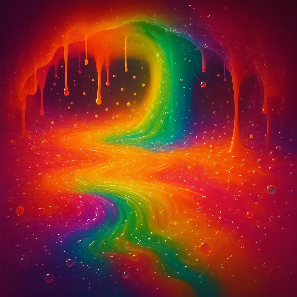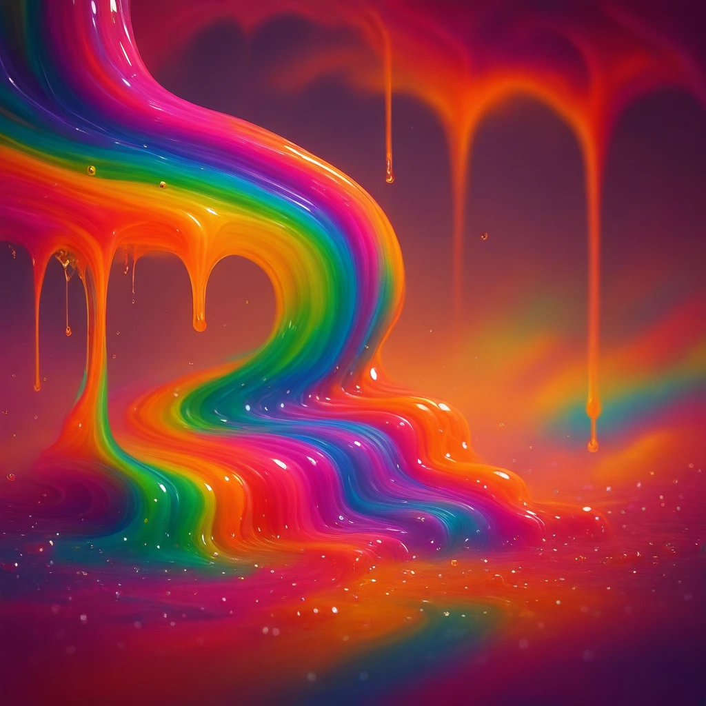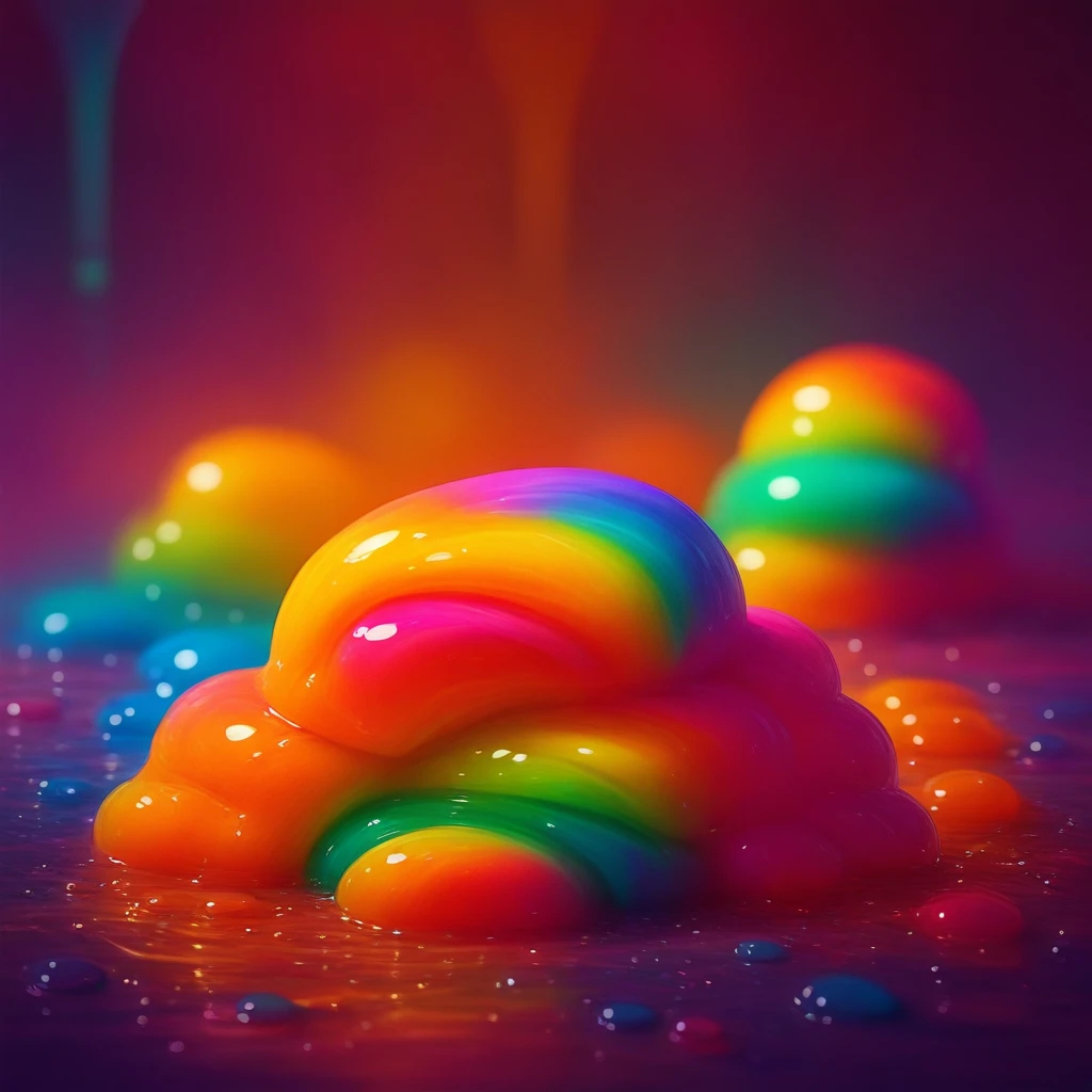 rainbow slime, multicolor liquid, iridescent colors, hyper-saturated colors, glossy surface, liquid blobs, dripping fluid, viscous material, surreal 3d style, smooth organic shapes, melting forms, fluid simulation look, vibrant neon colors, candy-like texture, soft reflections, high gloss finish, colorful gradients, abstract liquid art, dreamlike atmosphere, playful surrealism, fantasy material, liquid sculpture, volumetric lighting, macro detail look, cinematic lighting, soft depth of field, ultra smooth shading, digital art render, stylized realism, high detail 3d
