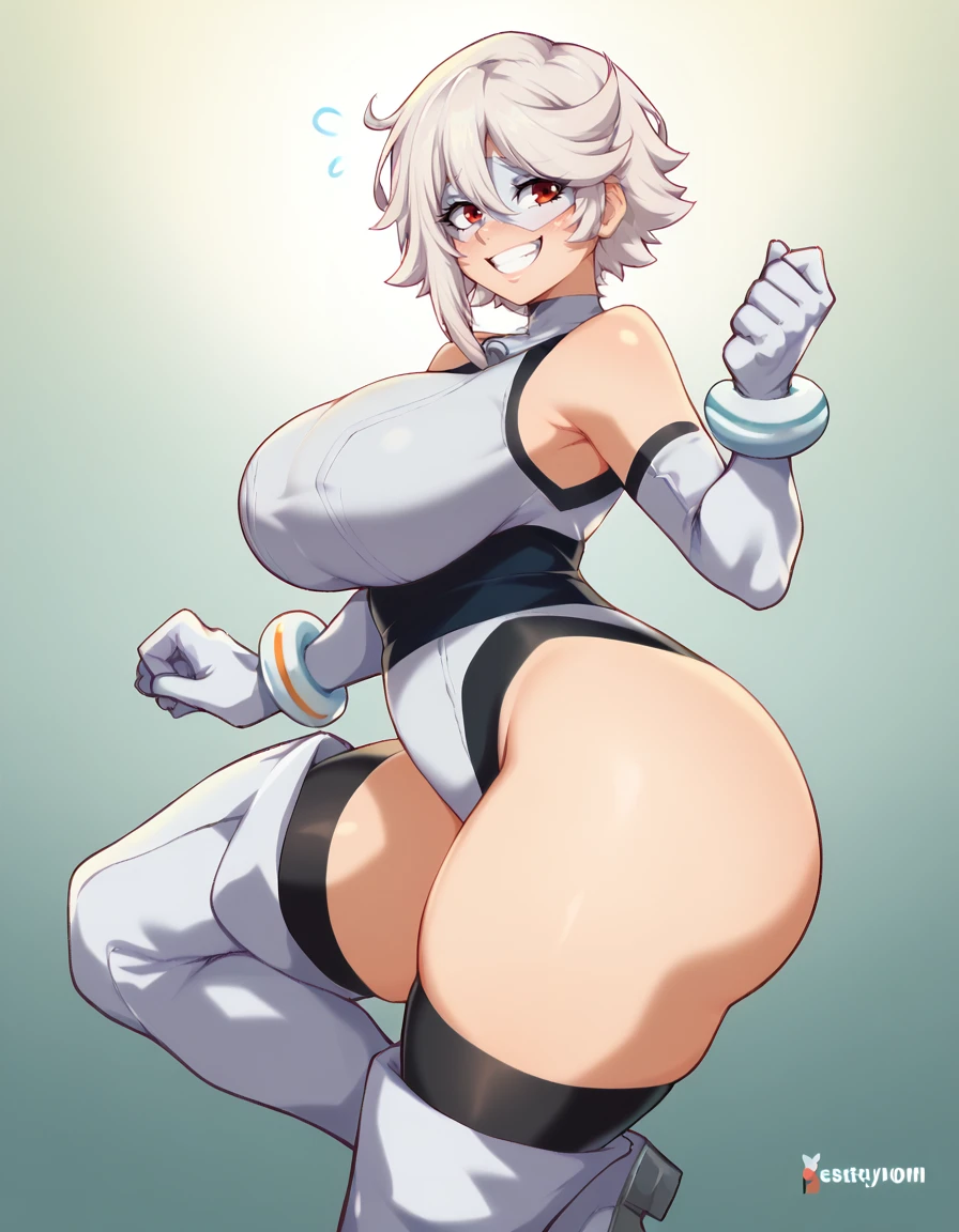 shyhero, gloves,, looking at viewer, elbow gloves, mask, white gloves, white hair,red eyes,white leotard,thigh boots
