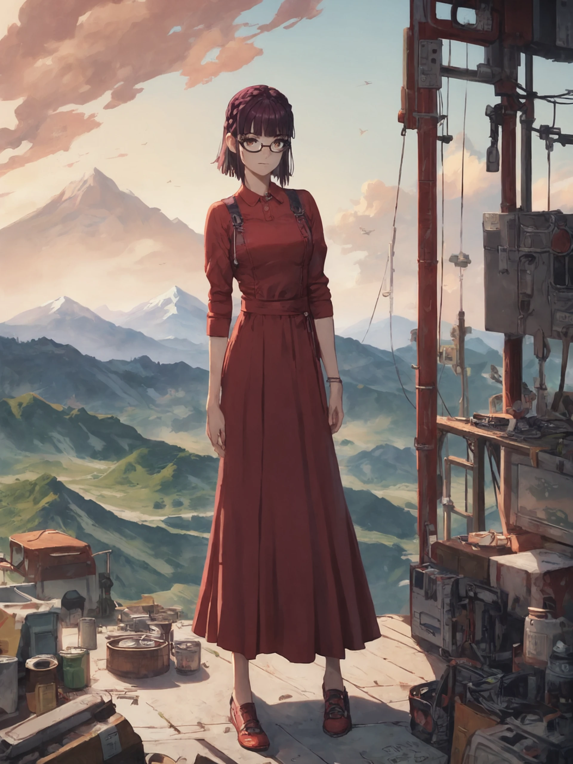 sum1kafuj1m1ya,glasses, solo, purple hair, brown eyes, braid, semi-rimless eyewear, short hair, blunt bangs,
