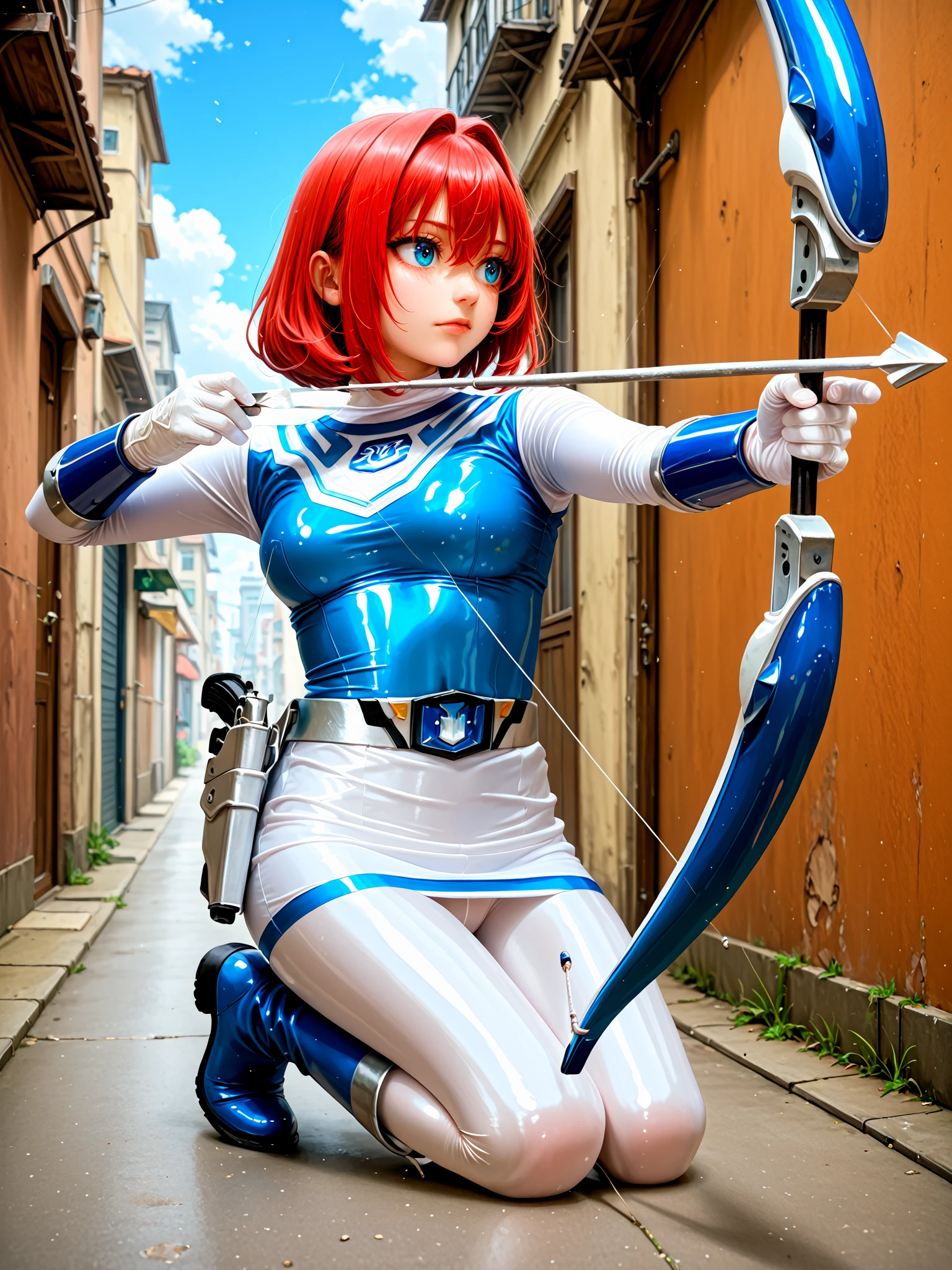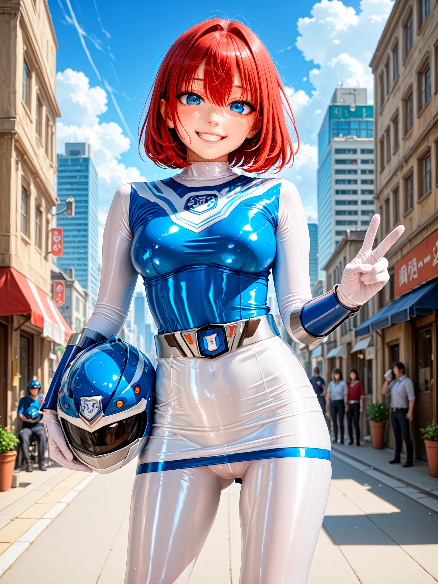 white neck, blue shirt, sleeveless shirt, white bodysuit, bodysuit under clothes, blue arm guards, white gloves, silver belt, white skirt, white pantyhoseblue boots, colored shoe solesHelmet prompts: