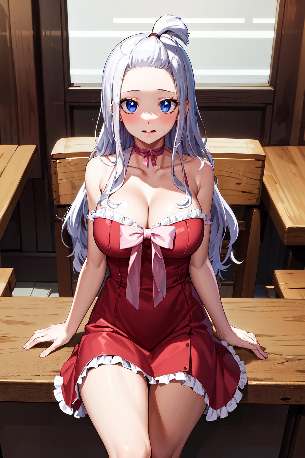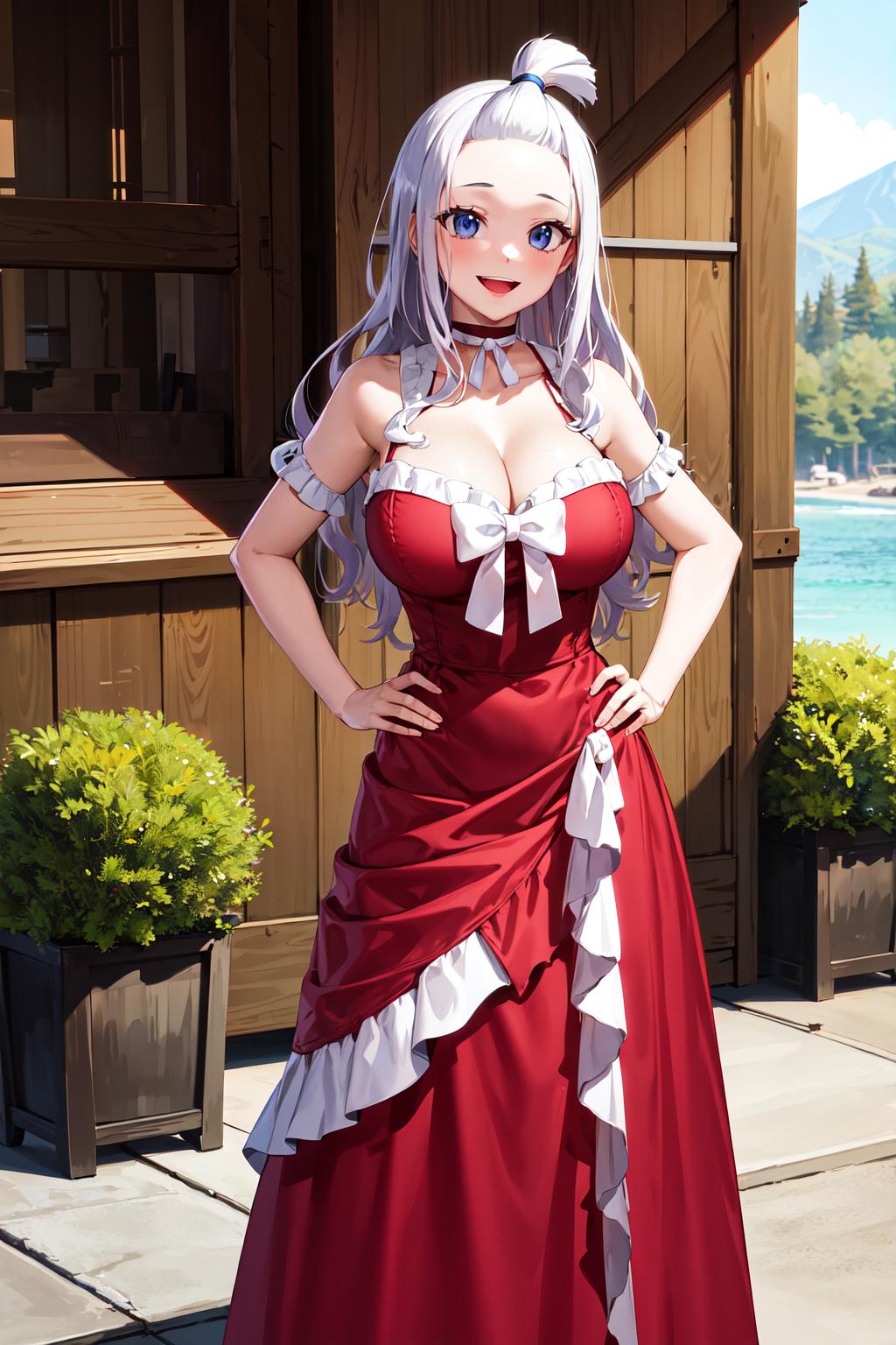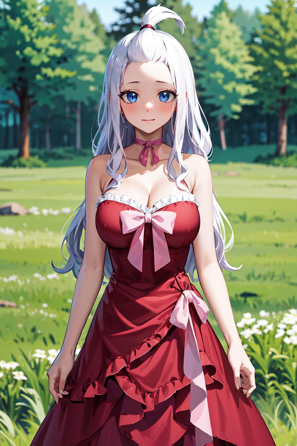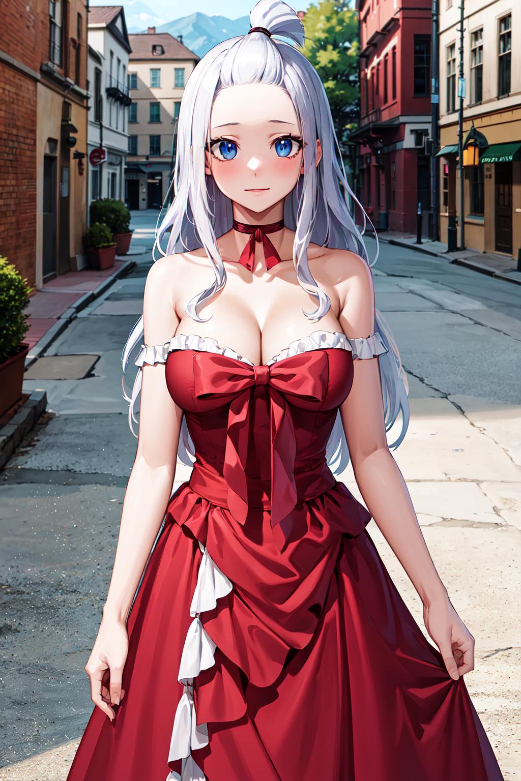 outfit1aamira, long hair, bangs pinned back, topknot, forehead, choker, bare shoulders, cleavage, red dress, frilled dress, bow, sleeveless