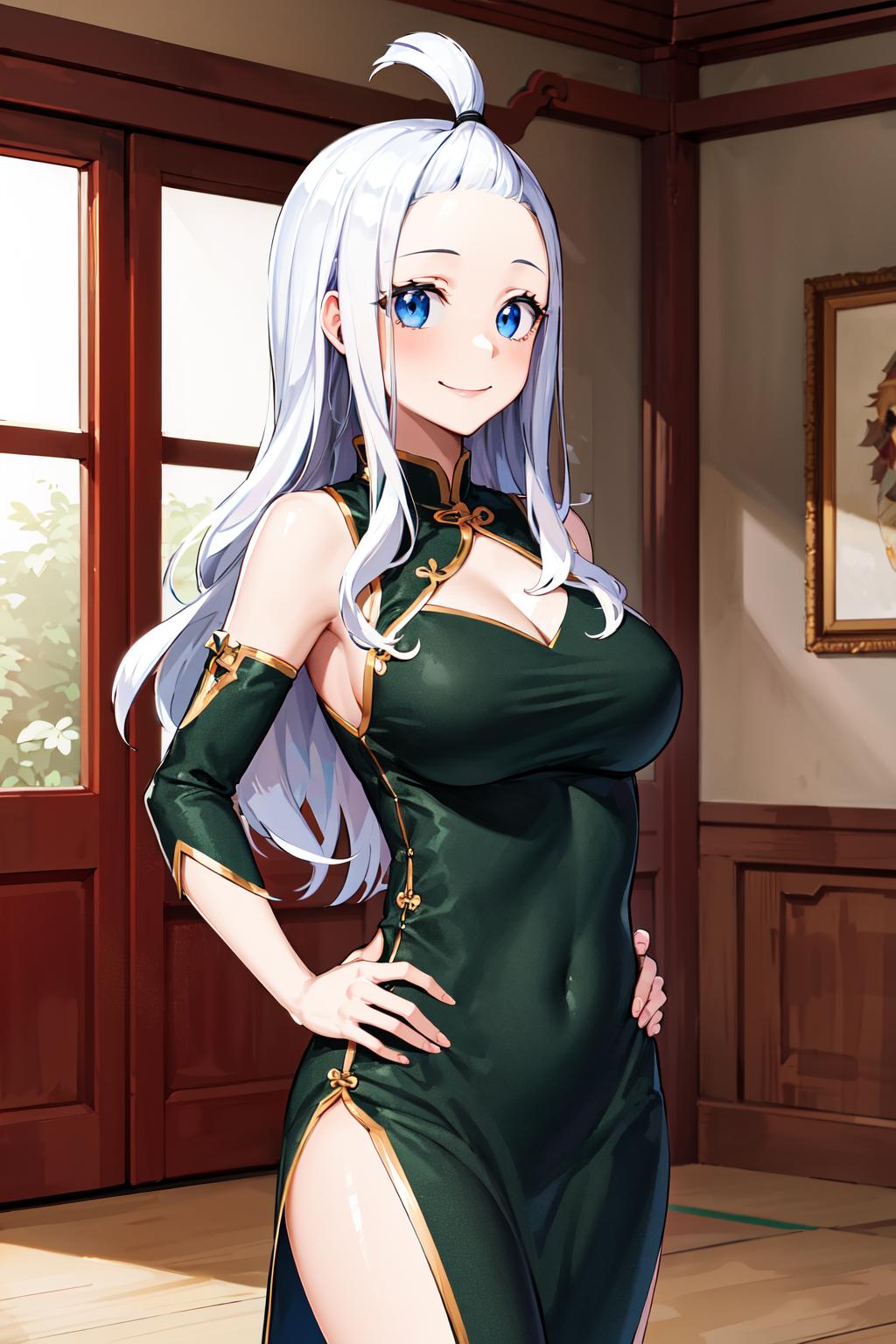 aamira, long hair, bangs pinned back, topknot, forehead, choker, bare shoulders, cleavage, red dress, frilled dress, bow,
