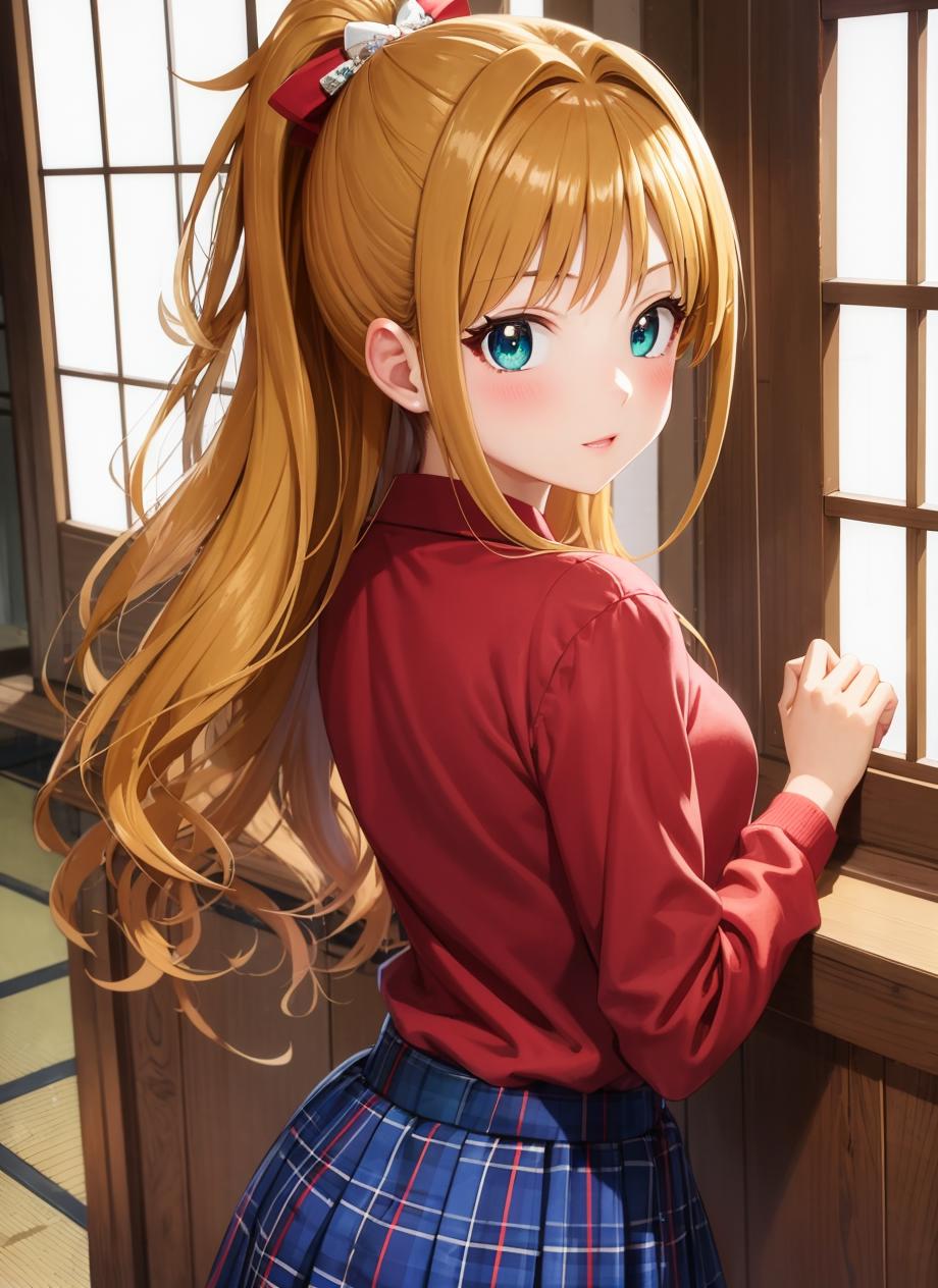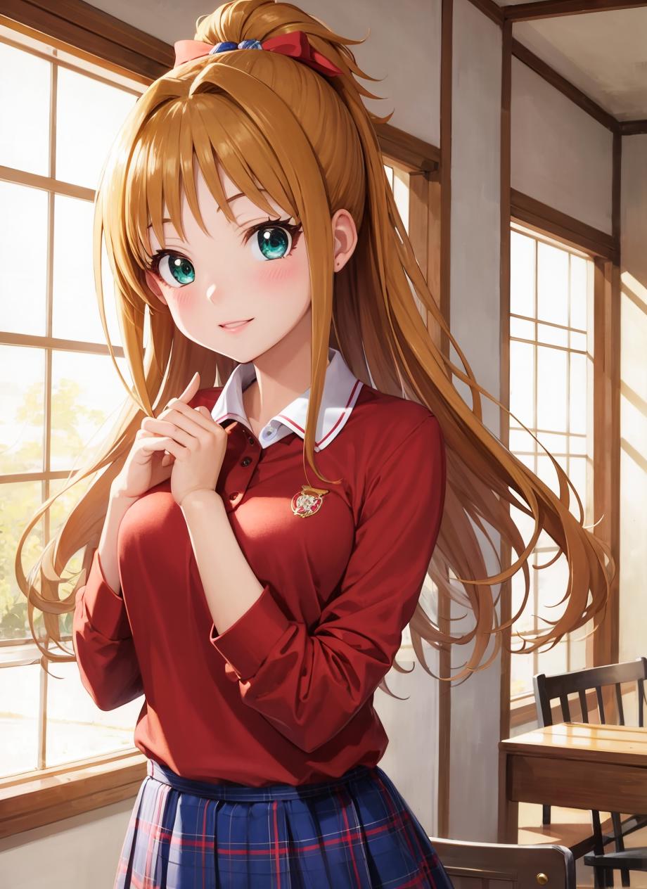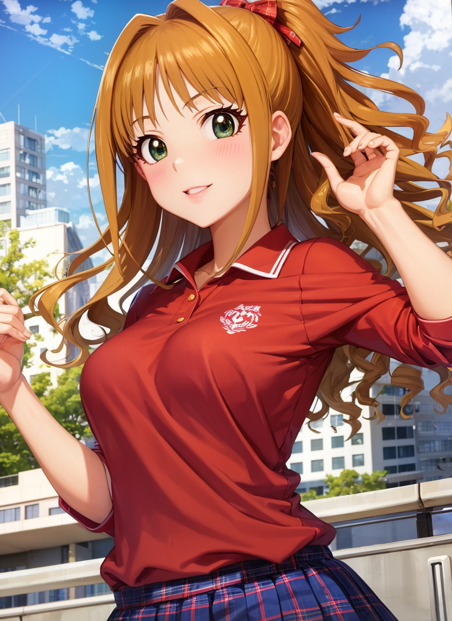 hino akane /(idolmaster/), long hair, high ponytail, orange hair, green eyes