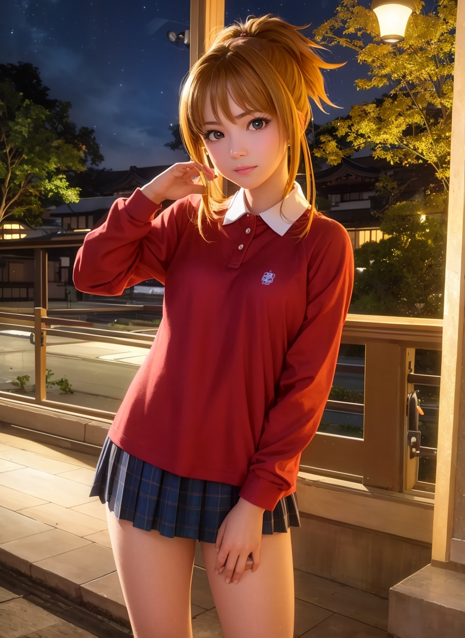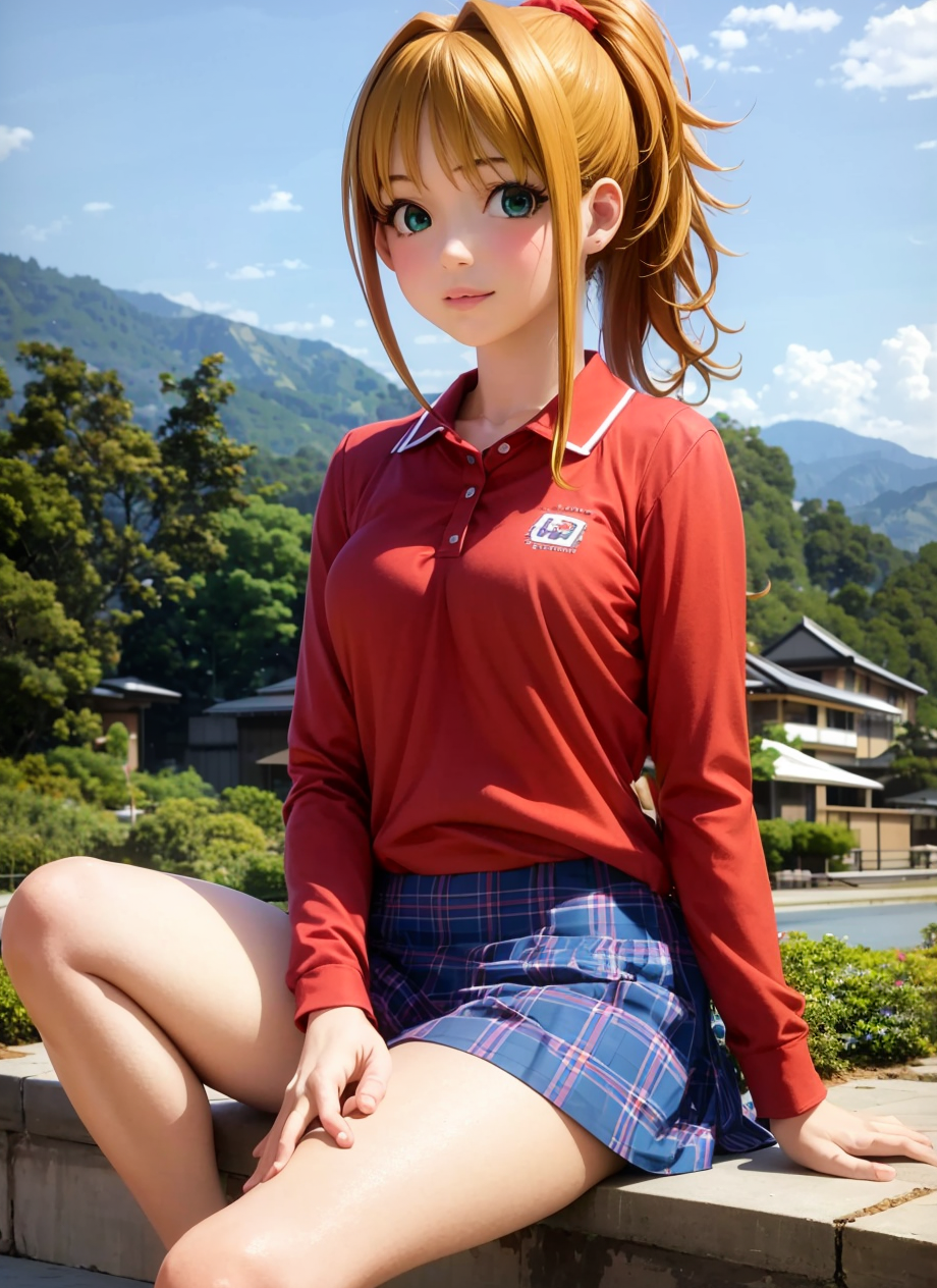 , red shirt, polo shirt, long sleeves, sleeves rolled up