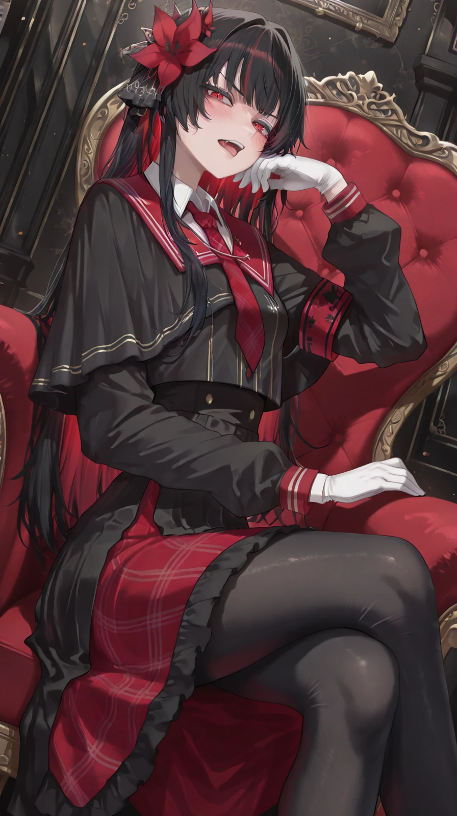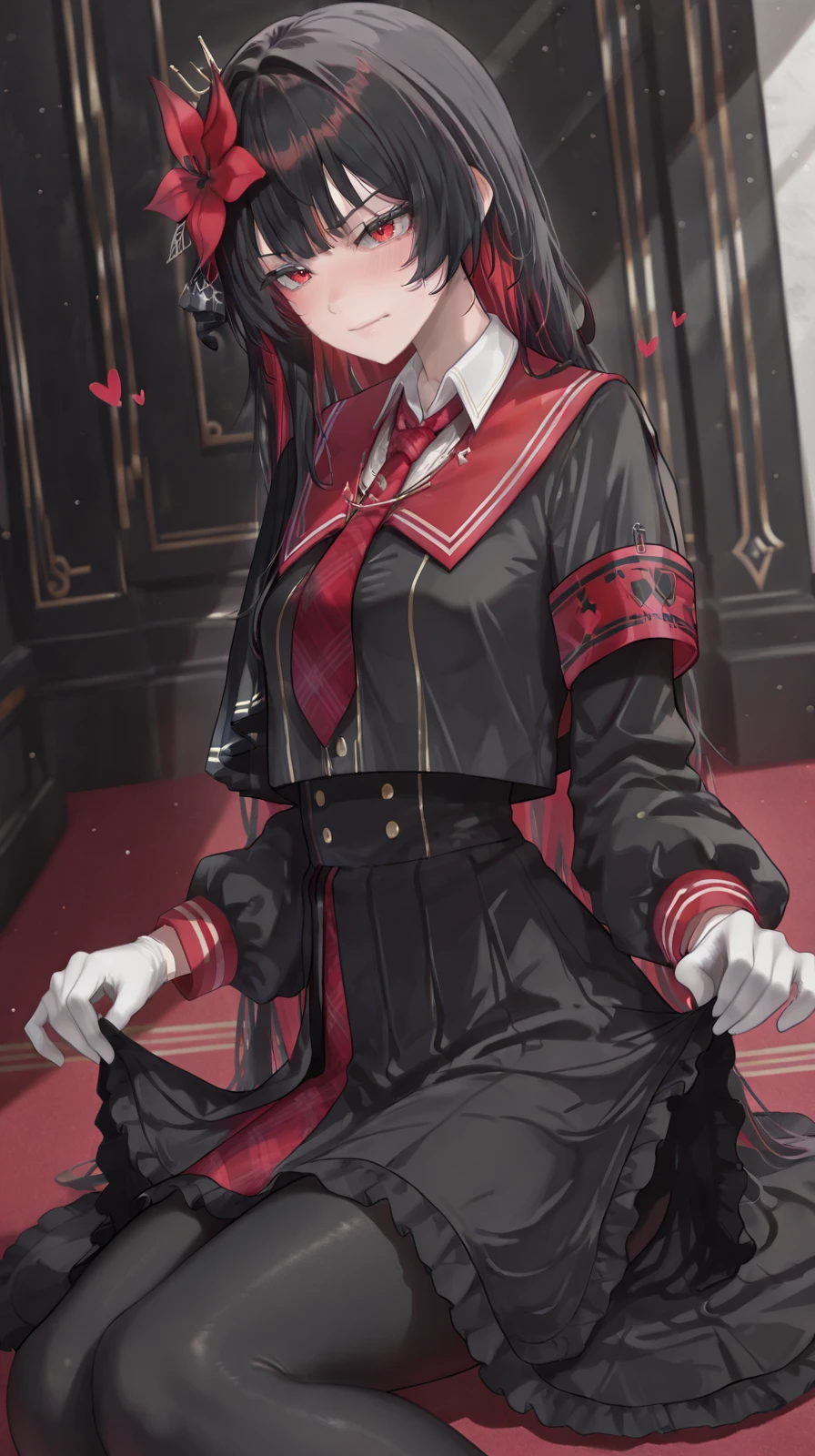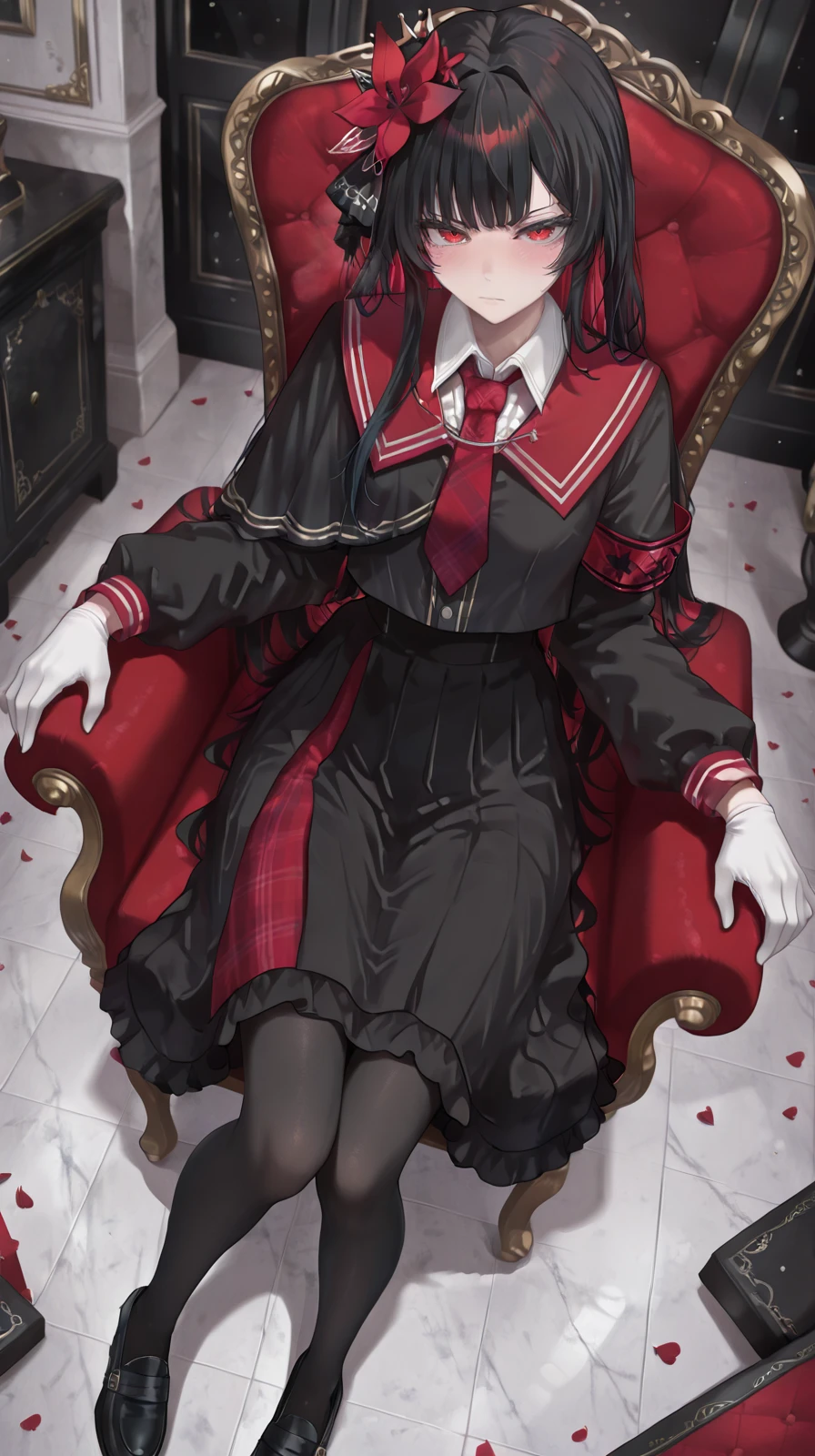 NikaidoHiro, black hair, long hair, colored inner hair, hair ornament, red eyes, white gloves, white inner shirt, collared shirt, red sailor collar, plaid necktie, red necktie, single sided capelet, black coat, long sleeves, red armband, red dress, plaid dress, frilled dress, skirt over dress, black skirt, slit skirt, black leggings, black shoes