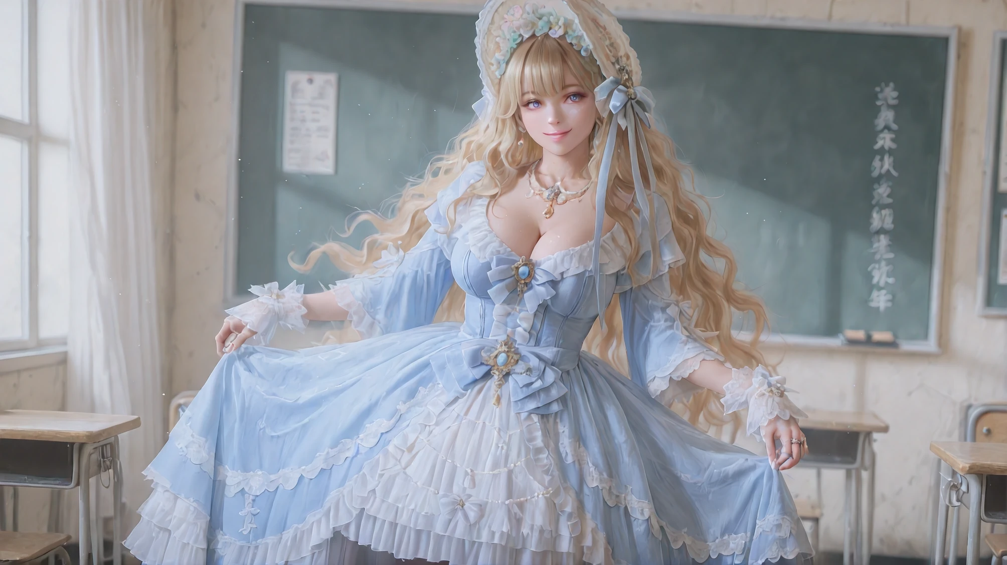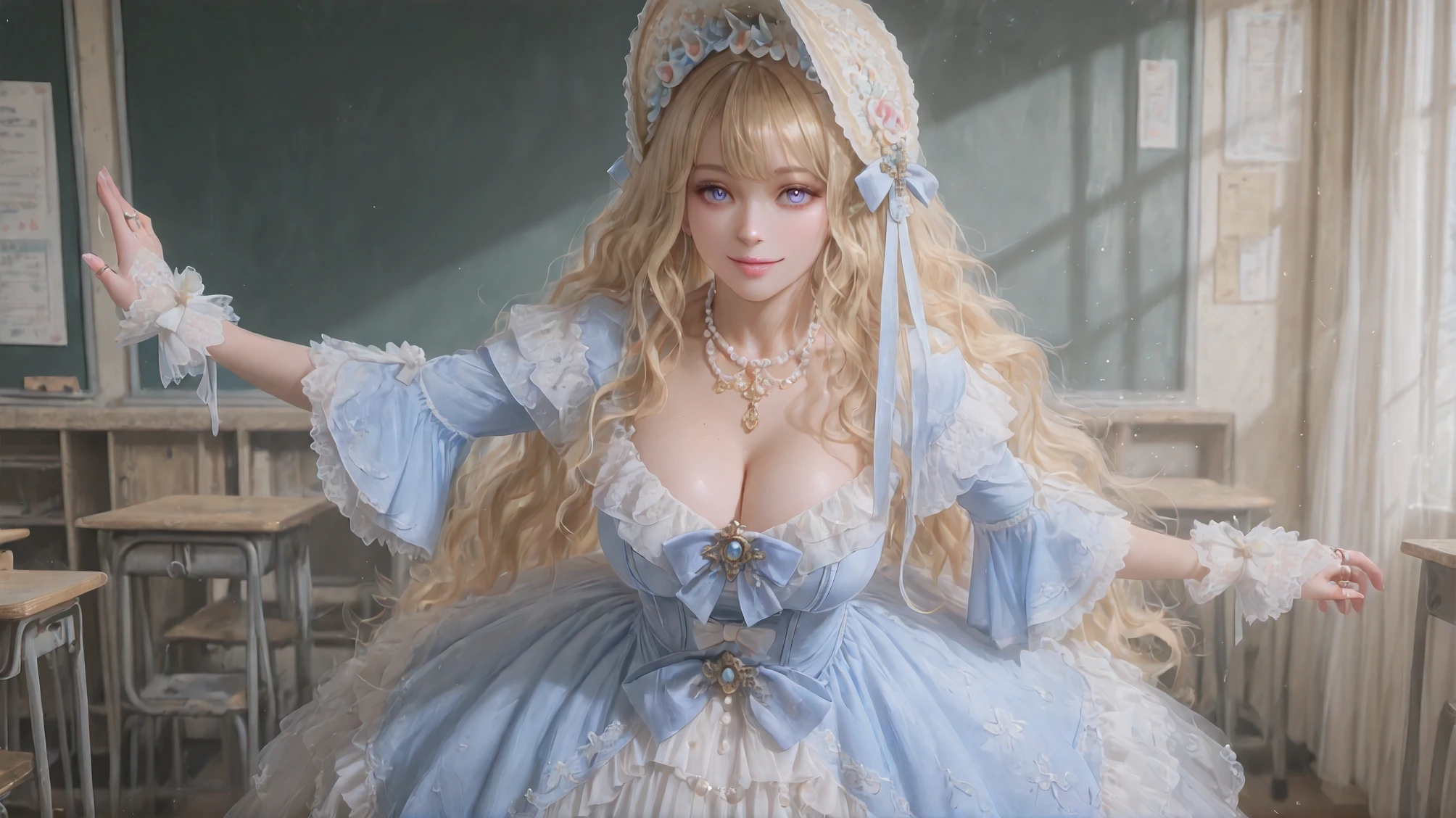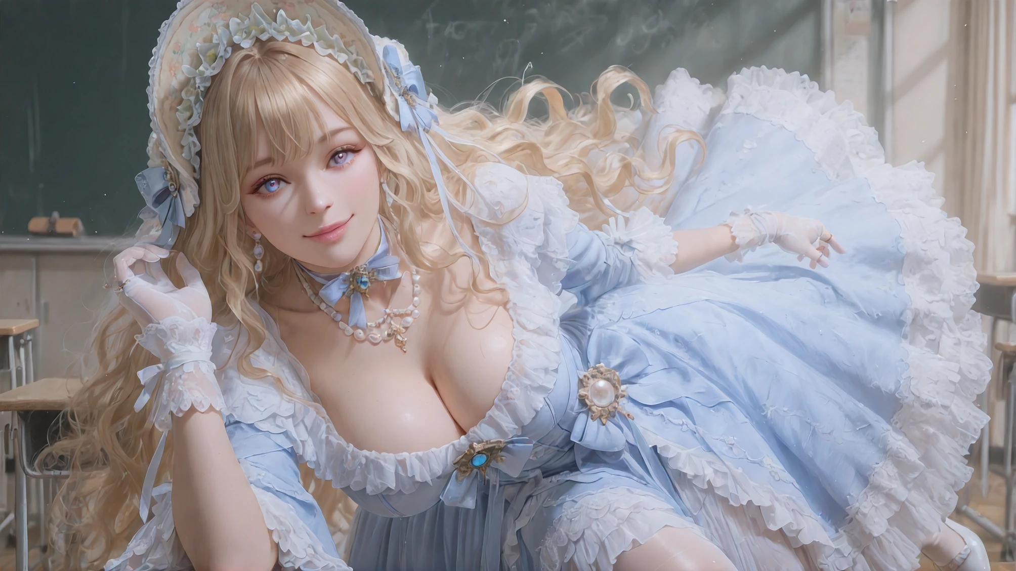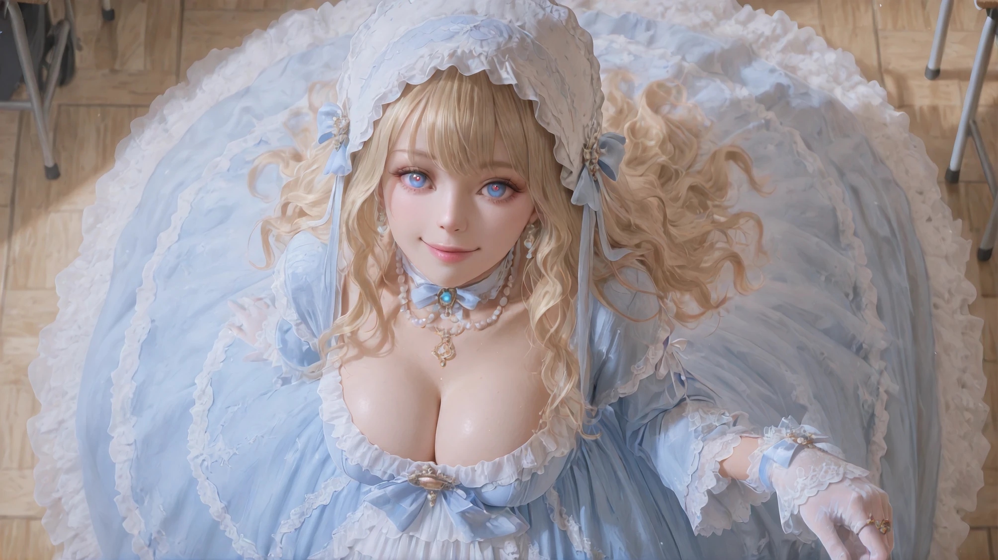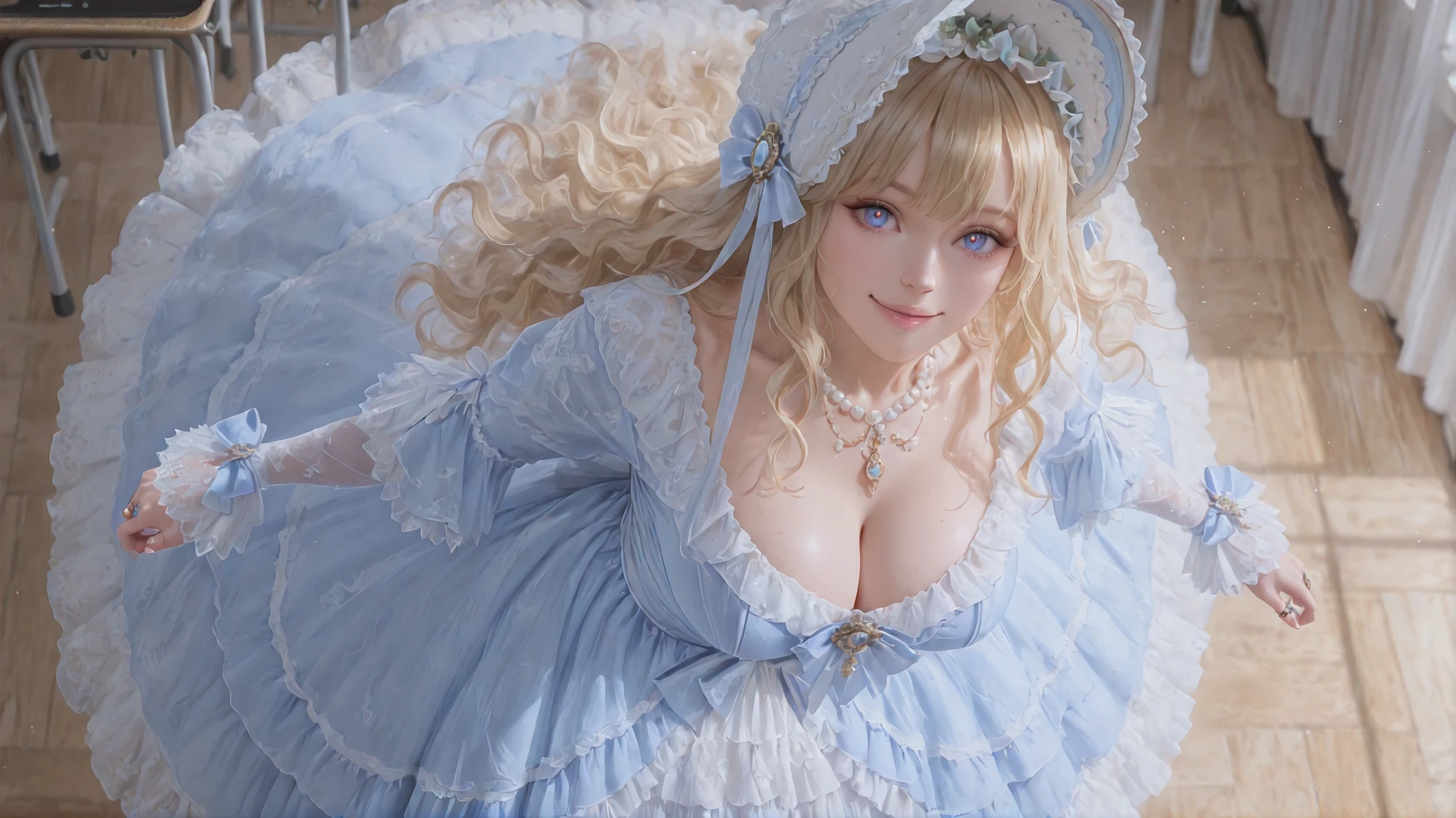 Aureate Bestowal: When Sunlight Weaves Itself into Taffeta,blue dress,jewelry,frilled dress,lace-trimmed dress,long sleeves,white bow,layered dress,blue bow,gloves,brooch,gem,bonnet,makeup,ribbon,pearl necklace,ring