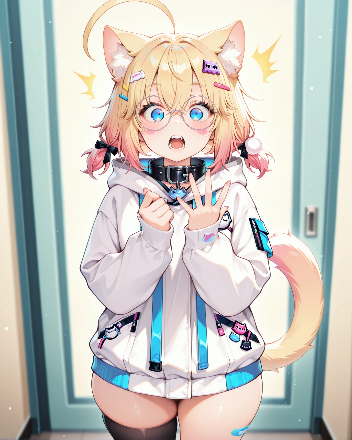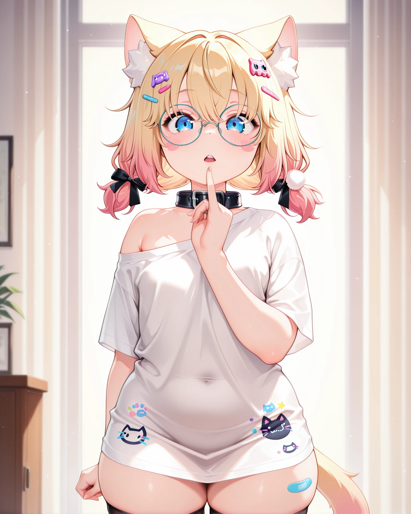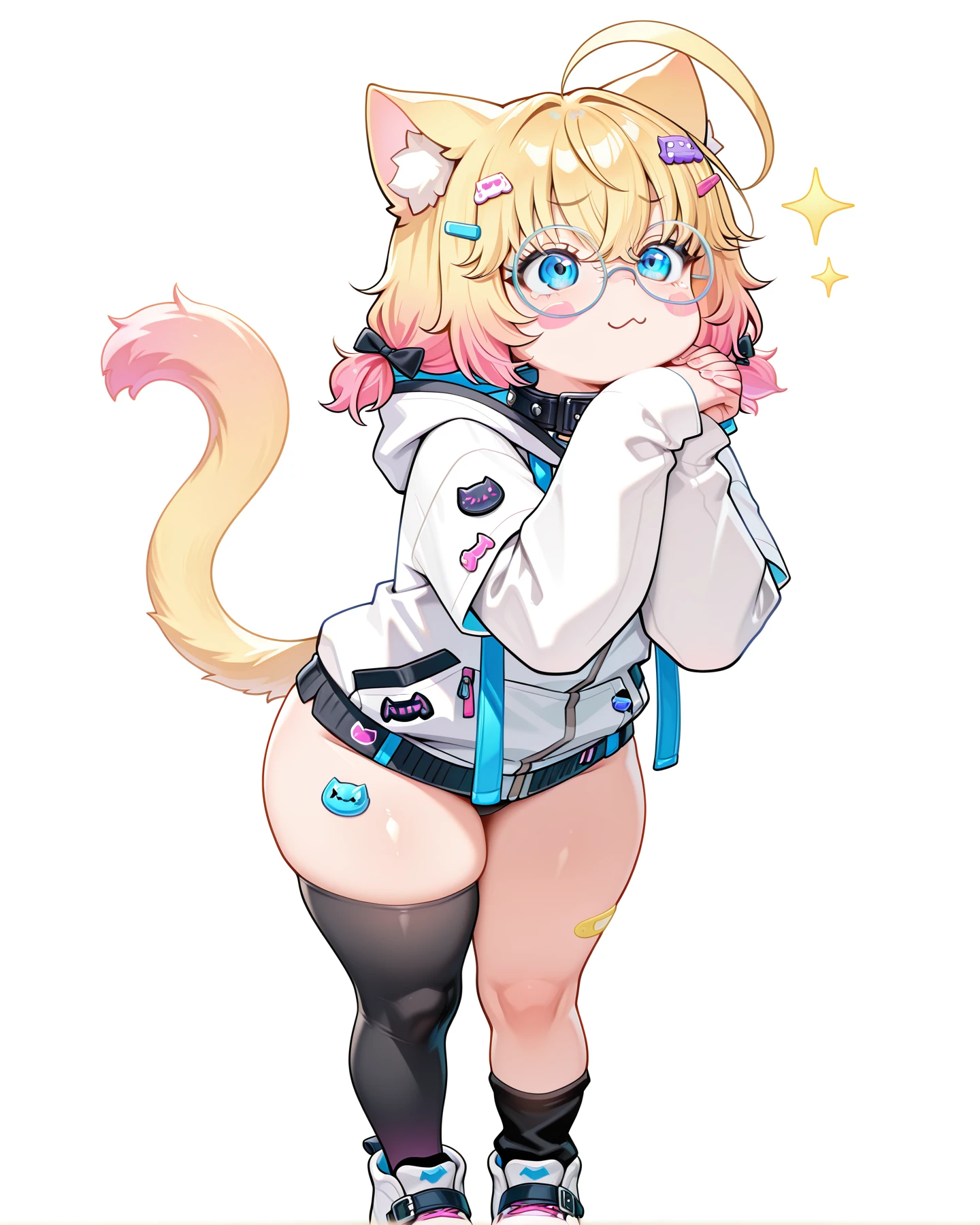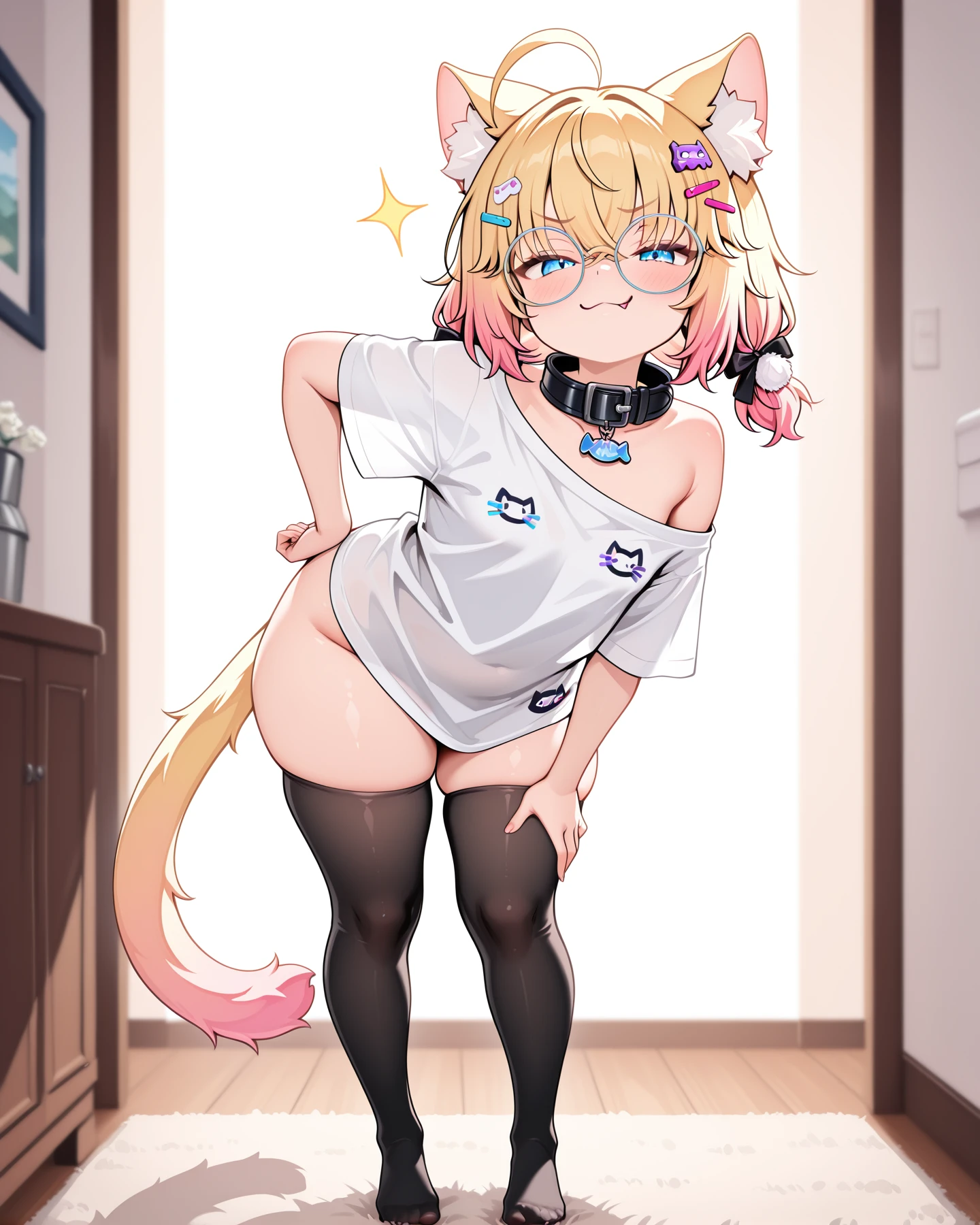 minikomew, blonde hair, gradient hair, hair between eyes, medium hair, hairclips, catgirl, cat ears, cat tail, blue eyes, round glasses,