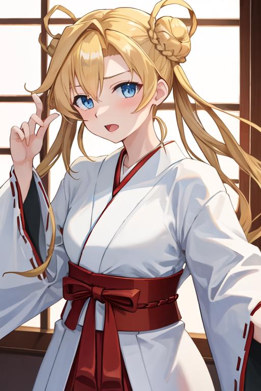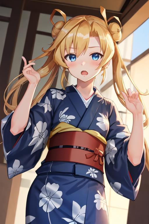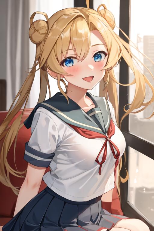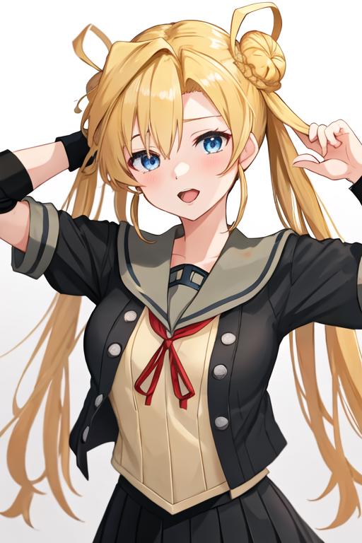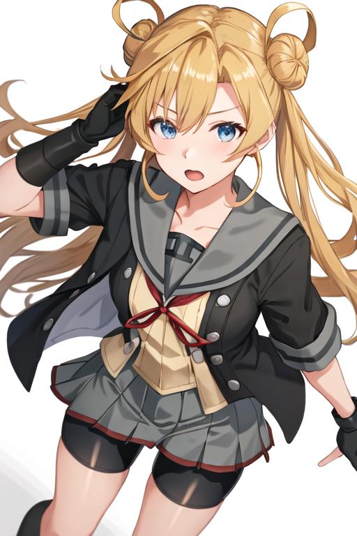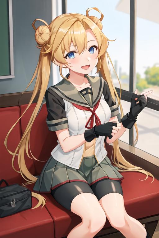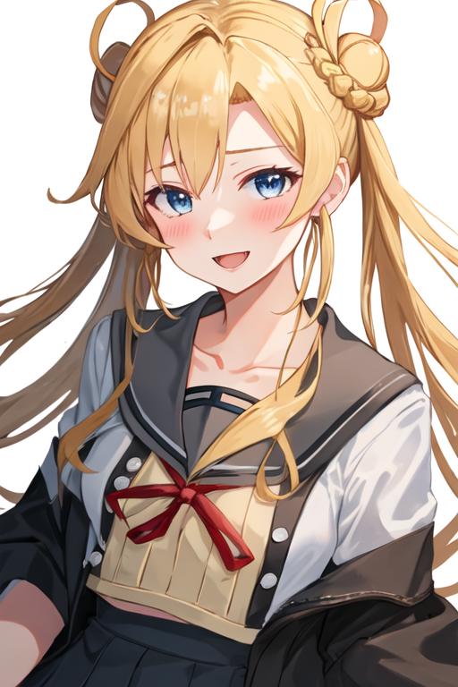 The trigger word is abukuma_kantaicollection, and the recommended tags are best quality, masterpiece, highres, solo, {abukuma_kantaicollection:1.15}, blonde_hair, long_hair, blue_eyes, hair_bun, double_bun, hair_rings, twintails, serafuku, hair_between_eyes, open_mouth.