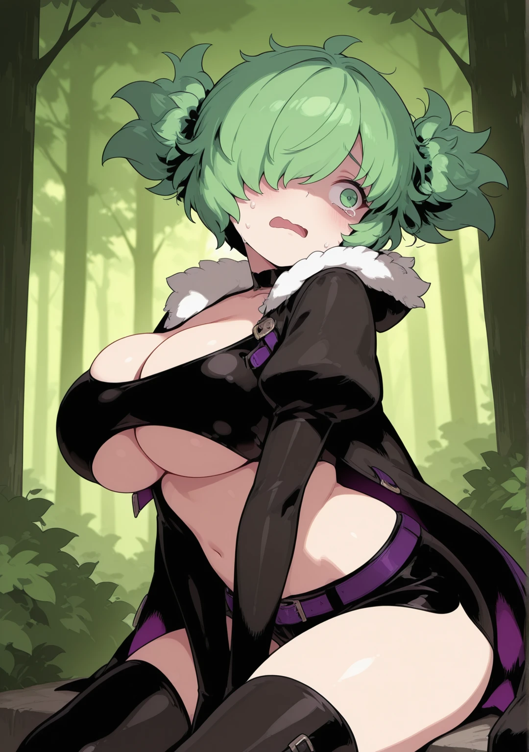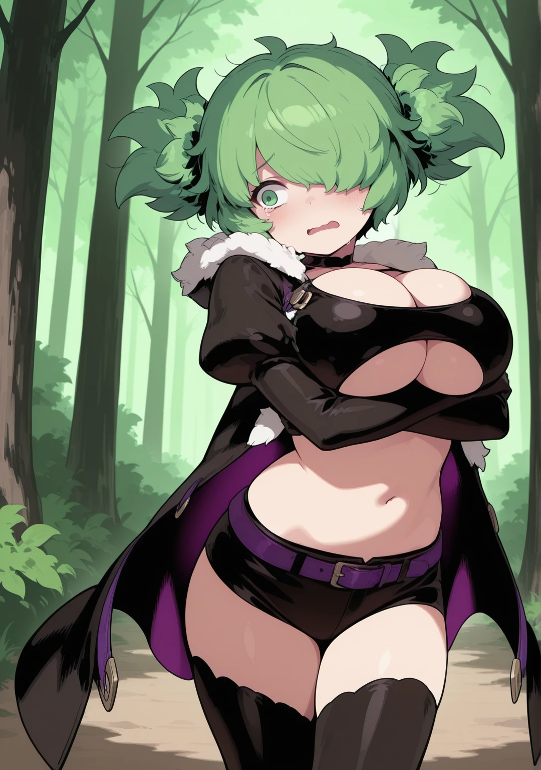 recommend:green hair,green eyes,hair over one eye,messy hair,short twintails,black footwear,black shorts,black choker,black thighhighs,black gloves,elbow gloves,black jacket,cleavage cutout,juliet sleeves,fur-trimmed jacket,large breasts,navel,purple belt,short shorts,thigh boots,underboob,black coat,open clothes,