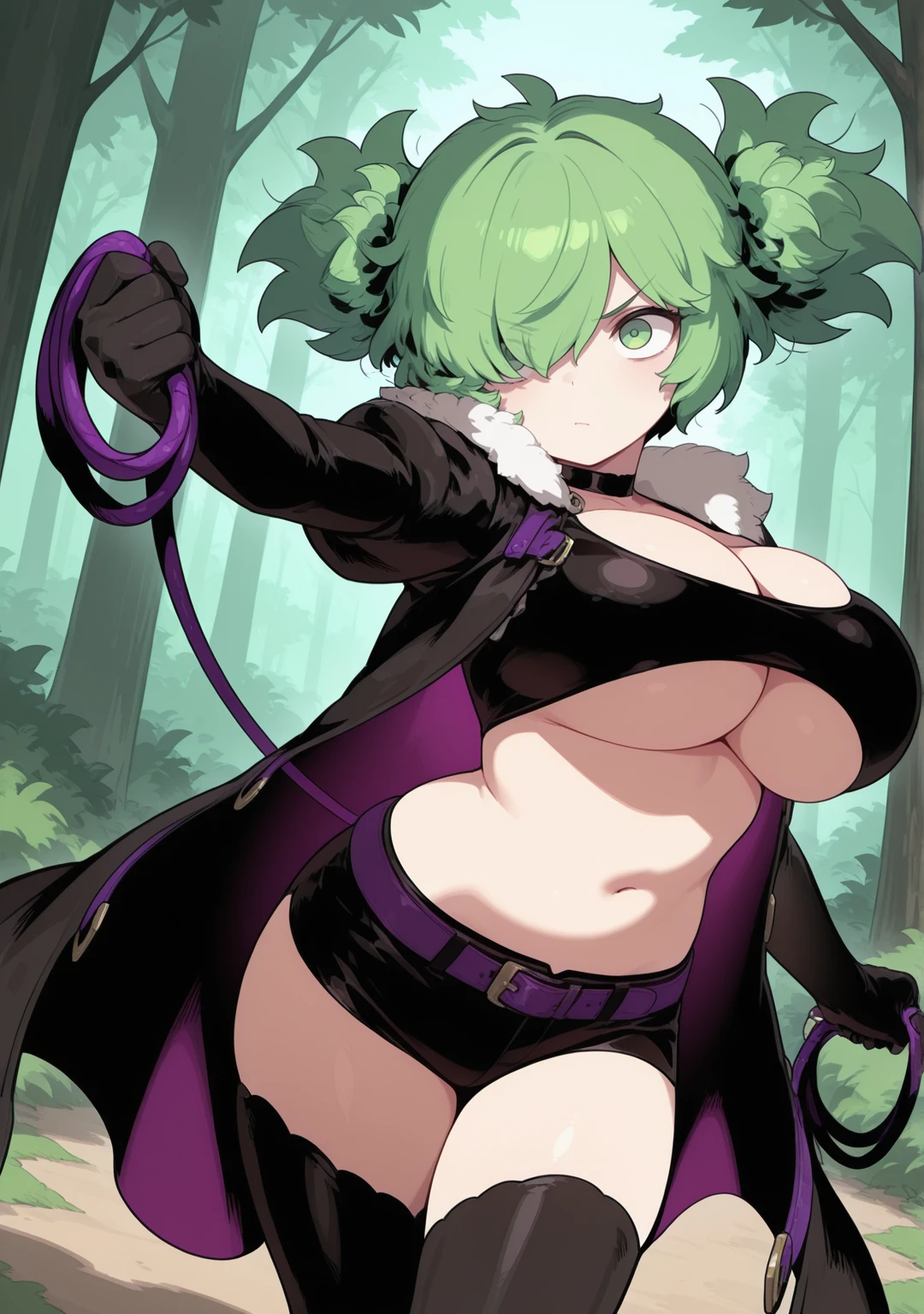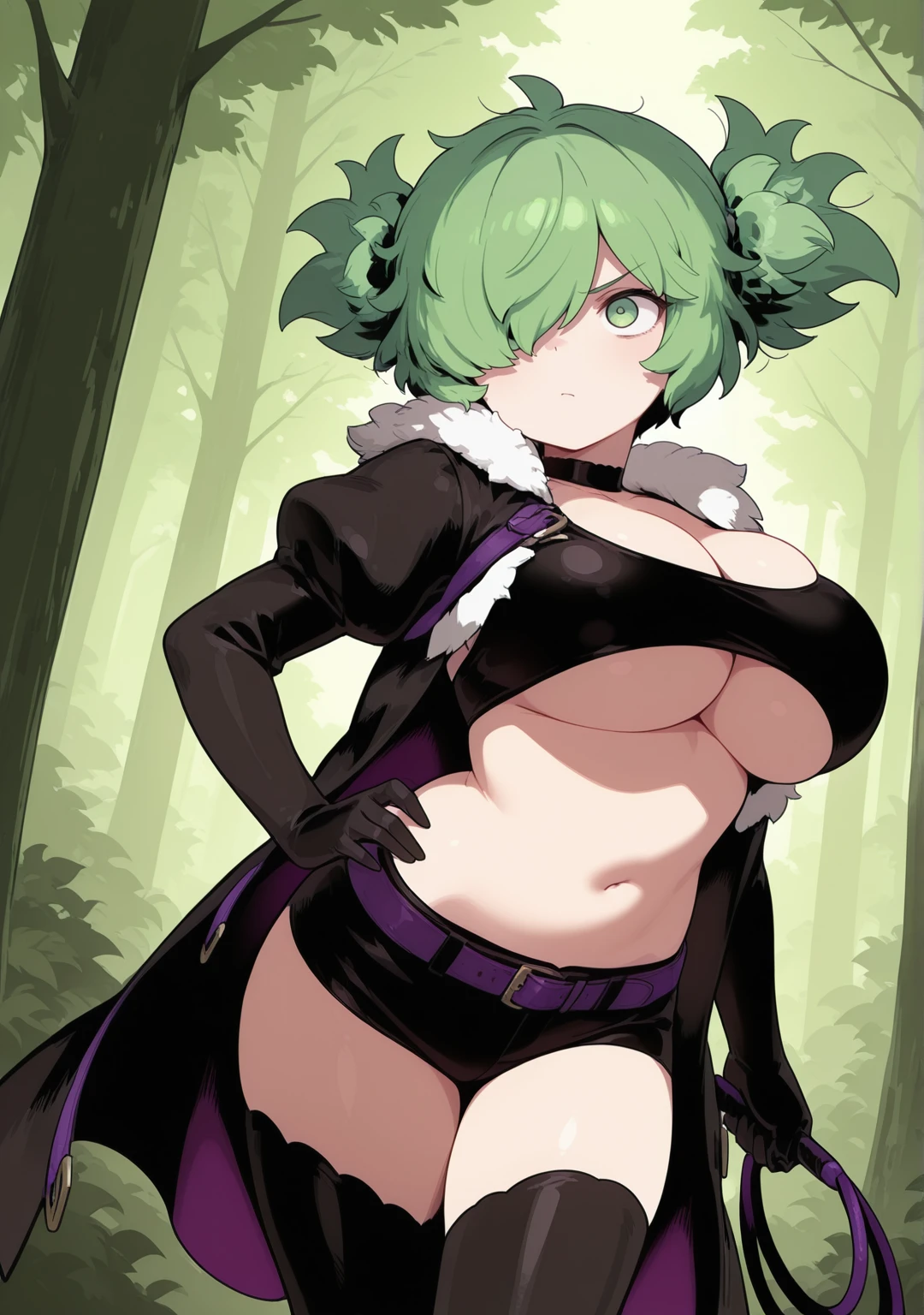 green hair,green eyes,hair over one eye,messy hair,short twintails,black footwear,black shorts,black choker,black thighhighs,black gloves,elbow gloves,black jacket,cleavage cutout,juliet sleeves,fur-trimmed jacket,large breasts,navel,purple belt,short shorts,thigh boots,underboob,black coat,,