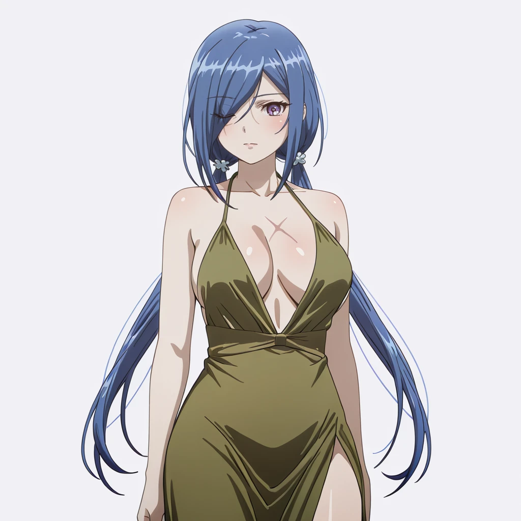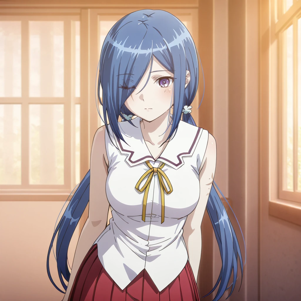 Trigger with sailor school outfit: YukiSailorSchool, 1girl, blue hair, red skirt, school uniform, purple eyes, hair over one eye, eyes visible through hair, long hair, pleated skirt, medium breasts, twintails, neck ribbon, sleeveless shirt, hair ornament, hair over one eye, scar,