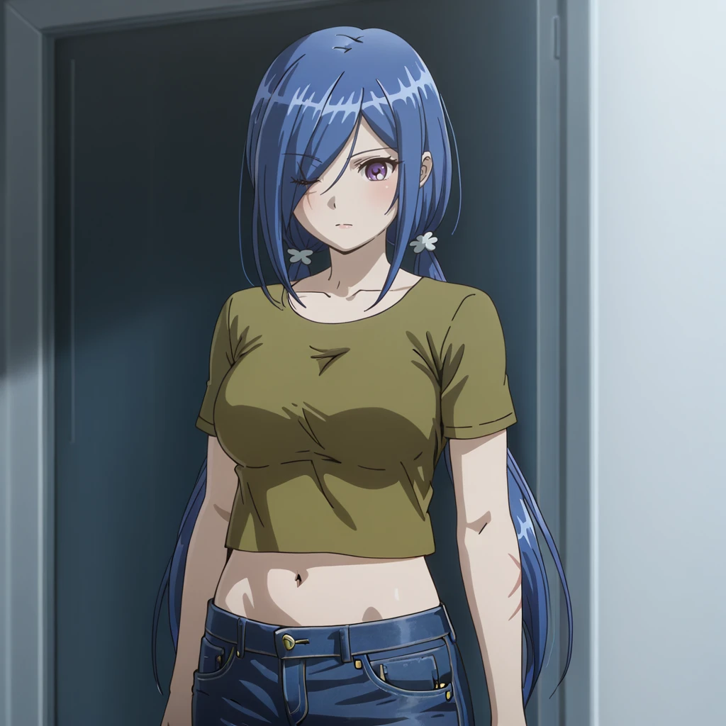 Trigger with green shirt: YukiGreenShirt, 1girl, long hair, navel, hair over one eye, scar, shirt, midriff, pants, twintails, blue hair, hair ornament, purple eyes, jeans, short sleeves, denim, breasts