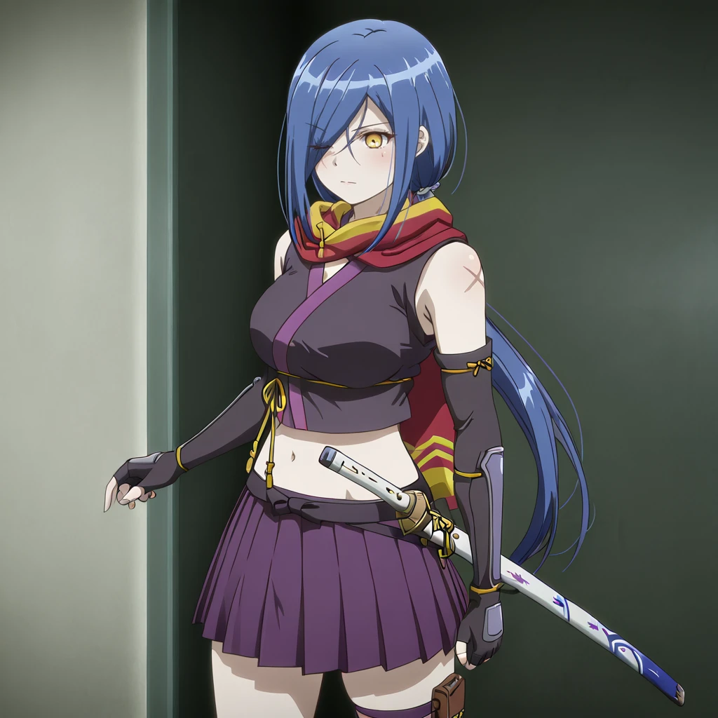 Trigger with yellow eyes: YukiSpyYellow, 1girl, blue hair, purple skirt, yellow eyes, fingerless gloves, long hair, sheath, pleated skirt, elbow gloves, sheathed, ponytail, black gloves, scarf, miniskirt, midriff, breasts, bangs, hair over one eye, scar,