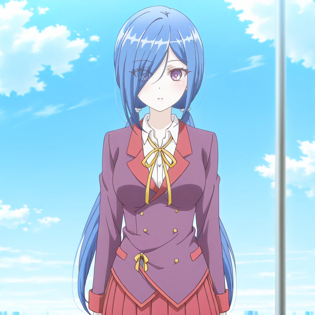 Trigger with school outfit: YukiSchool, 1girl, school uniform, blue hair, purple eyes, skirt, hair over one eye, eyes visible through hair, breasts, twintails, jacket, yellow ribbon, shirt, long sleeves, red skirt, pleated skirt, hair over one eye,