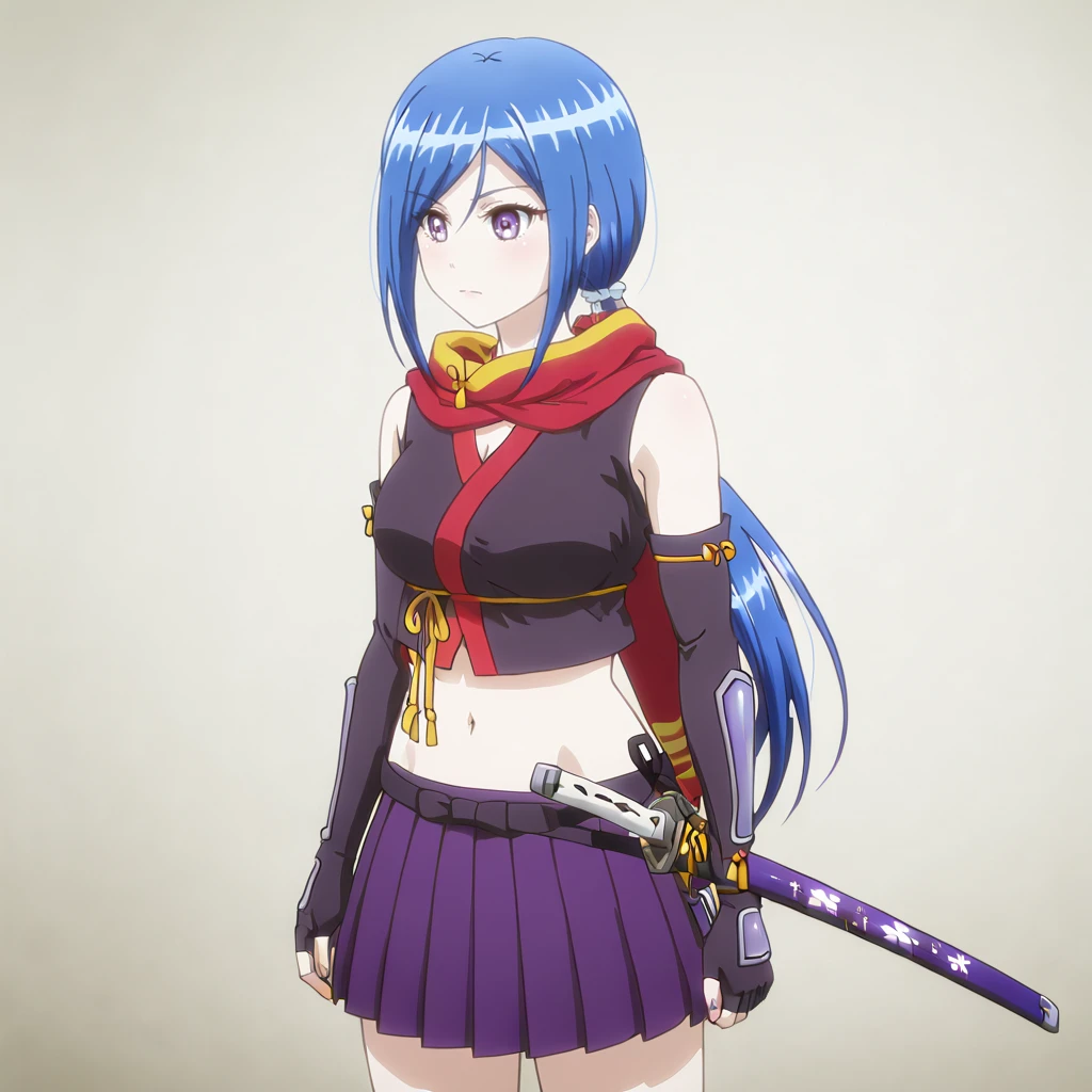Trigger with spy with both eyes: YukiSpyBothEyes, 1girl, blue hair, pleated skirt, fingerless gloves, purple eyes, japanese clothes, navel, midriff, black gloves, elbow gloves, sheathed, ninja, sheath, purple skirt, medium breasts, red scarf, miniskirt, crop top, bangs, ponytail