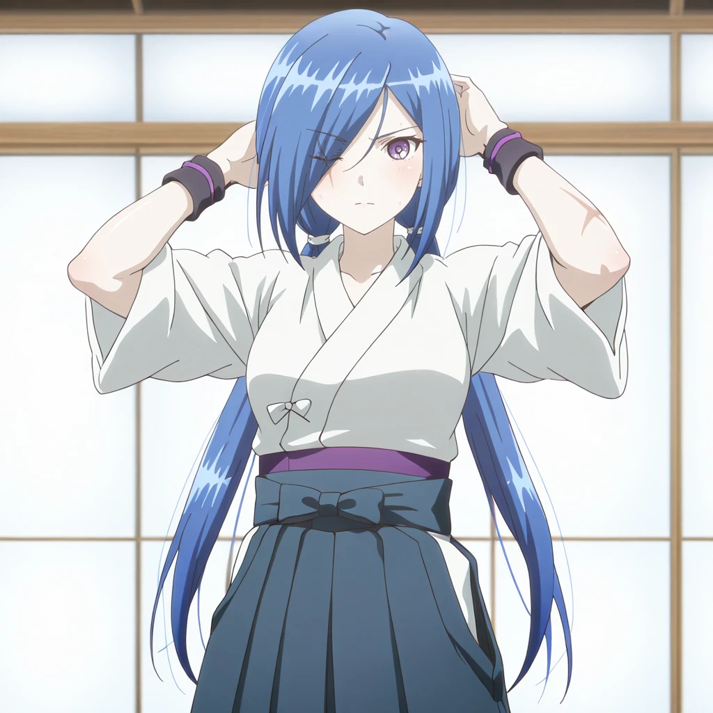 Trigger with training: YukiTraining, 1girl, japanese clothes, purple eyes, blue hair, low twintails, hakama skirt, wristband, hair over one eye, scar,