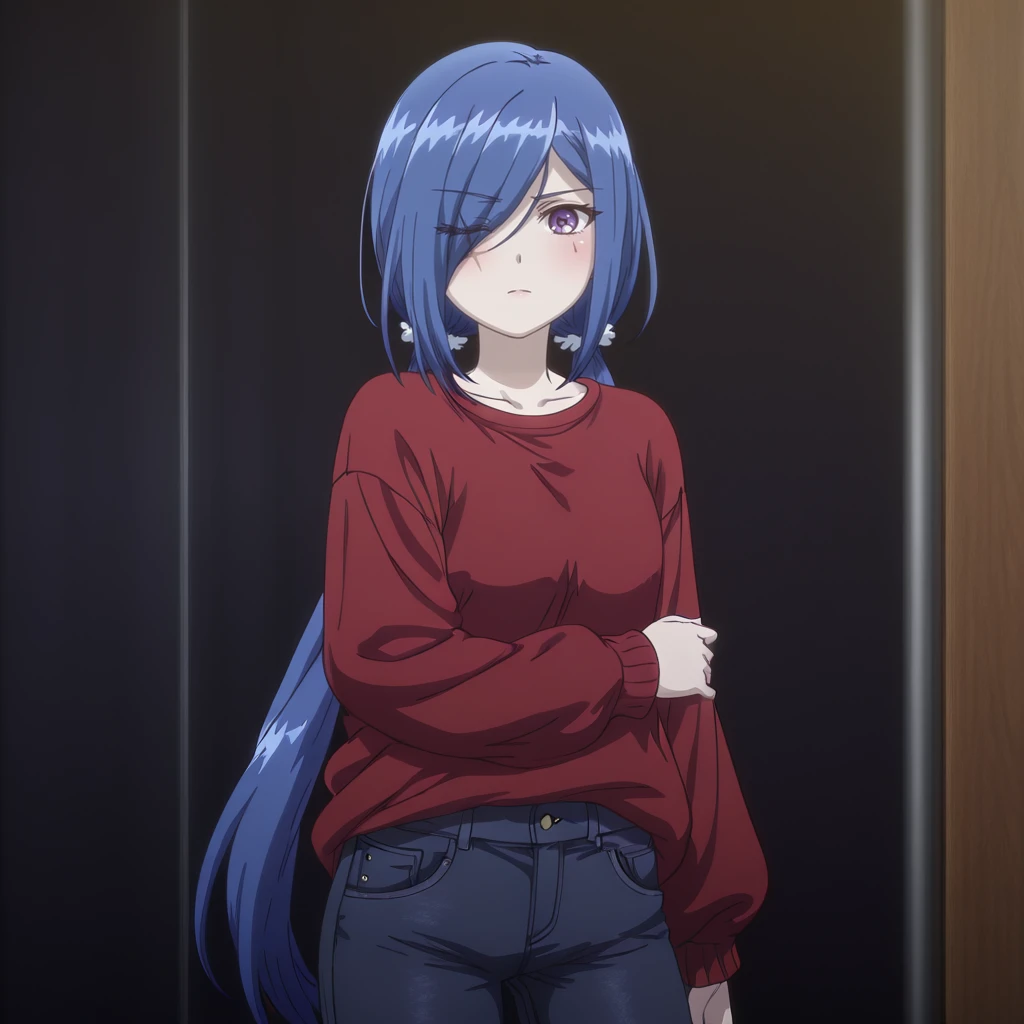 Trigger with sweater: YukiSweater, 1girl, blue hair, pants, hair ornament, hair over one eye, purple eyes, long sleeves, eyes visible through hair, red shirt, hair scrunchie, twintails, sweater, denim, jeans, bangs, hair over one eye, scar,