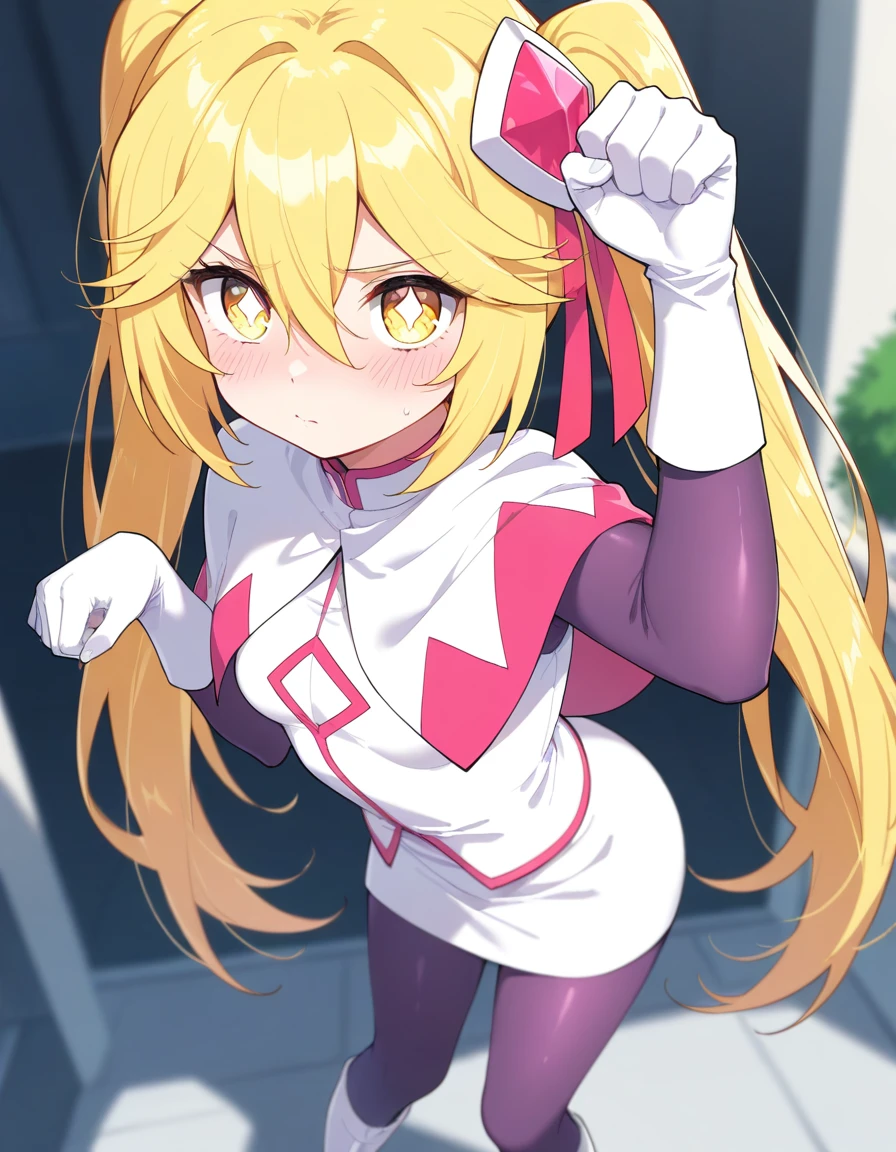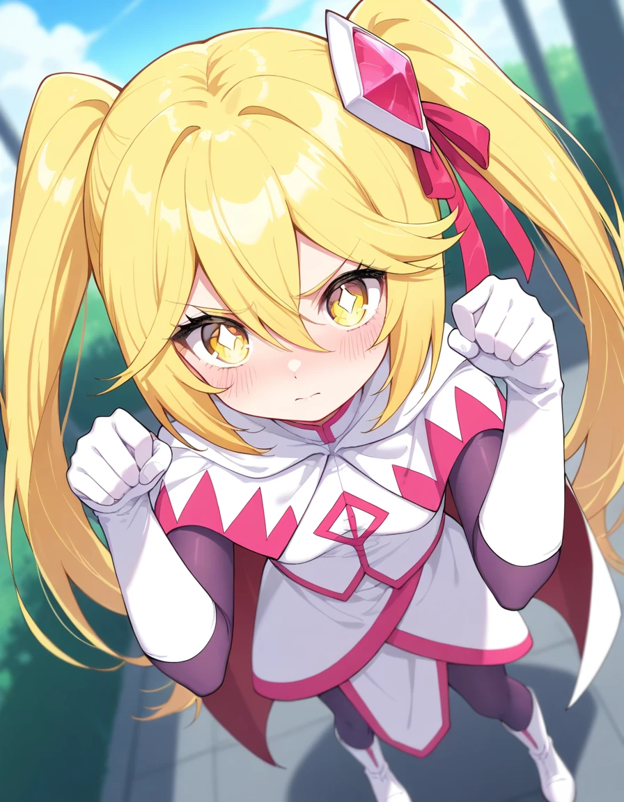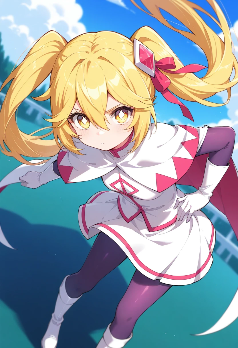 guaidao,1girl,blonde hair,boots,cape,capelet,(dress:1.2),hair between eyes,hair ornament,hair ribbon,long hair,purple bodysuit,ribbon,small breasts,solo,white pupils,diamond-shaped_pupils,symbol-shaped_pupils,twintails,white capelet,white footwear,white gloves,white skirt,yellow eyes,diamond eyes