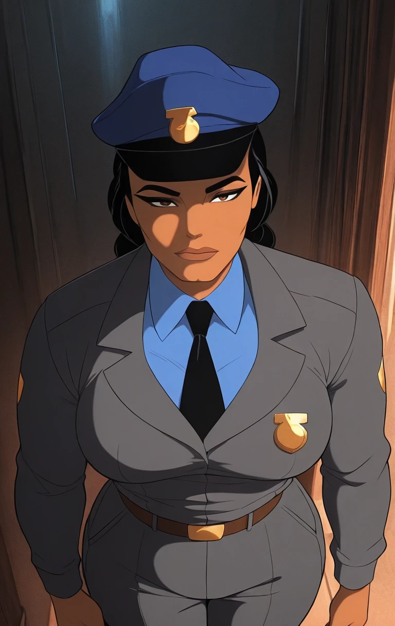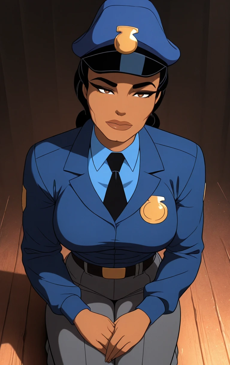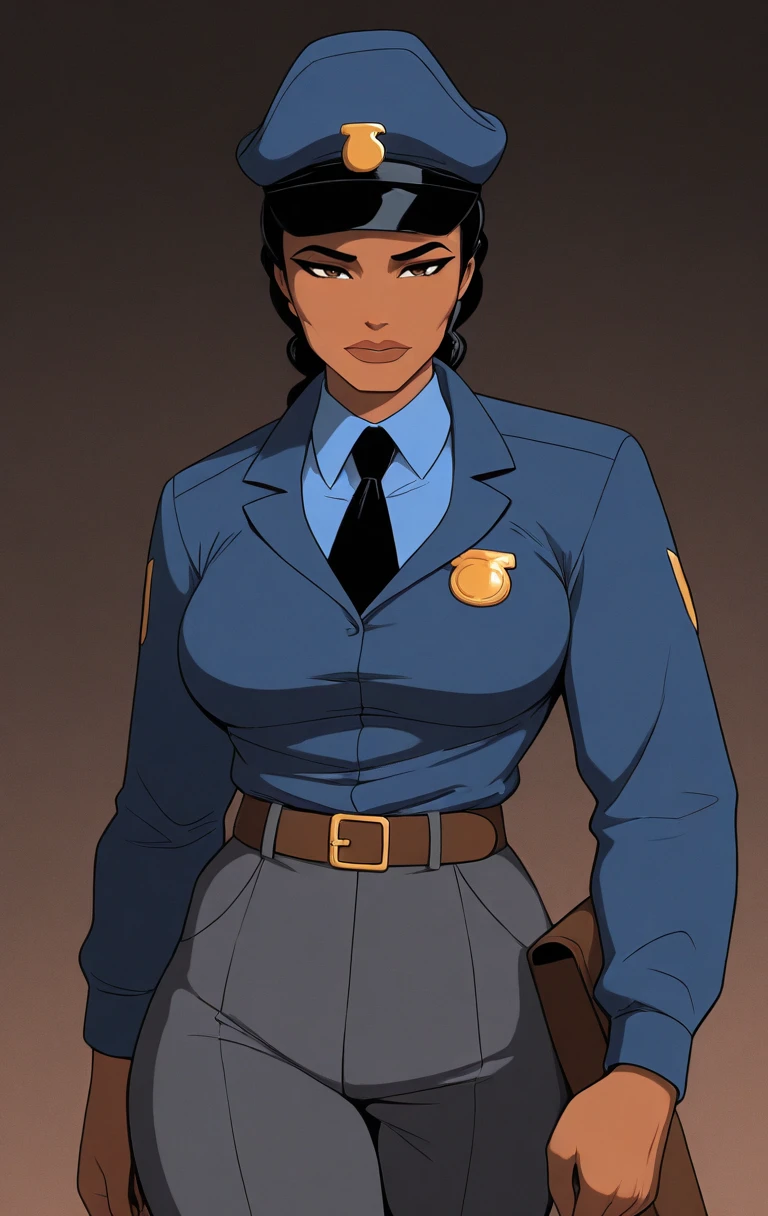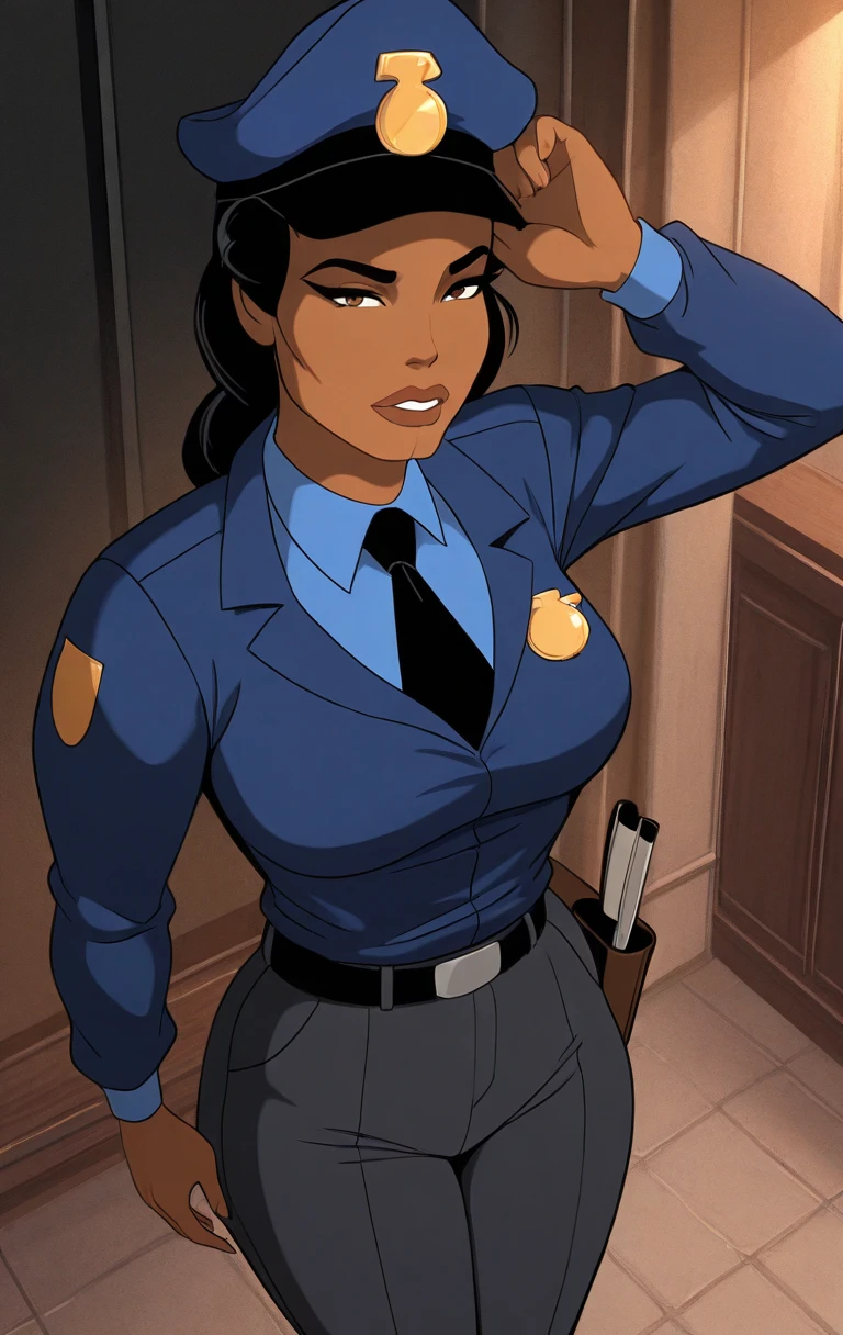 R3n3M0ntoy4, looking at viewer, brown eyes,blue shirt, suit, necktie, hat, black tie,black hair,dark-skin,dark-skinned female,belt,pants,