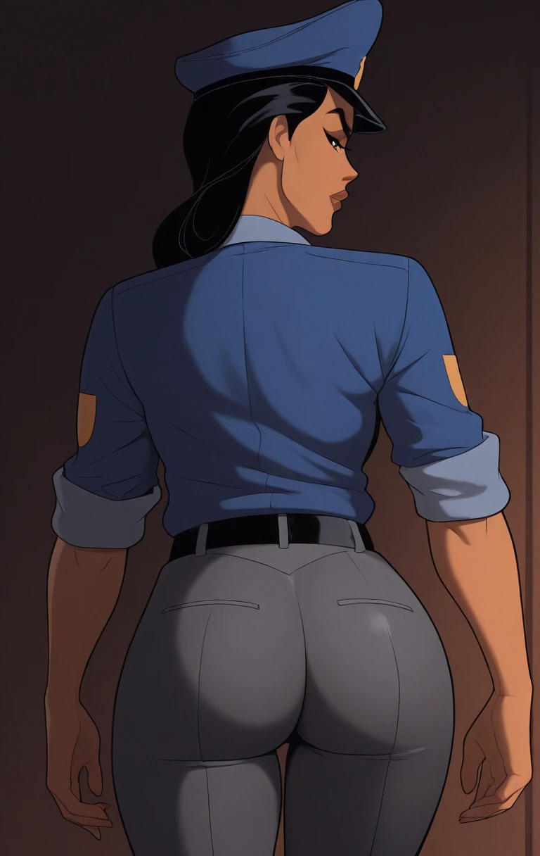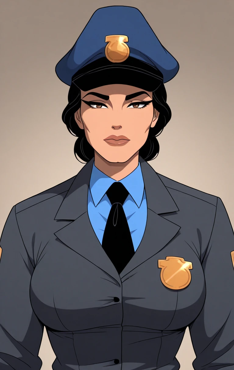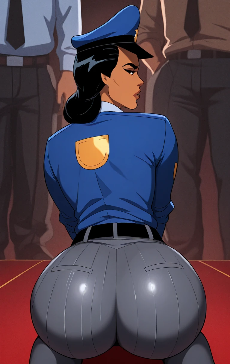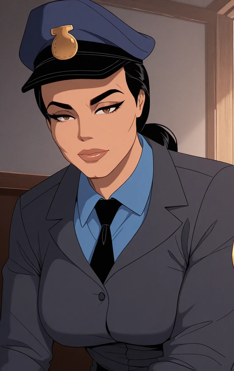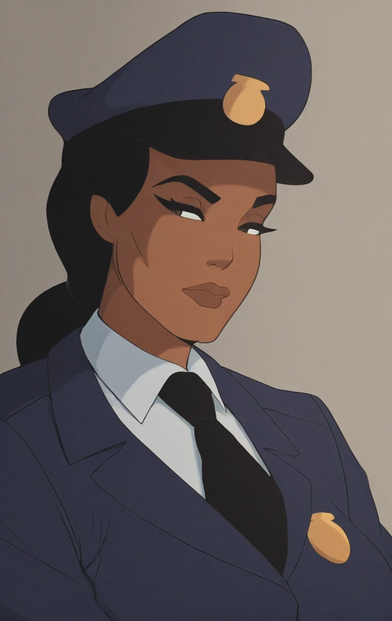 R3n3M0ntoy4, looking at viewer, brown eyes,blue shirt, suit, necktie, hat, black tie,black hair,dark-skin,dark-skinned female,belt,pants,