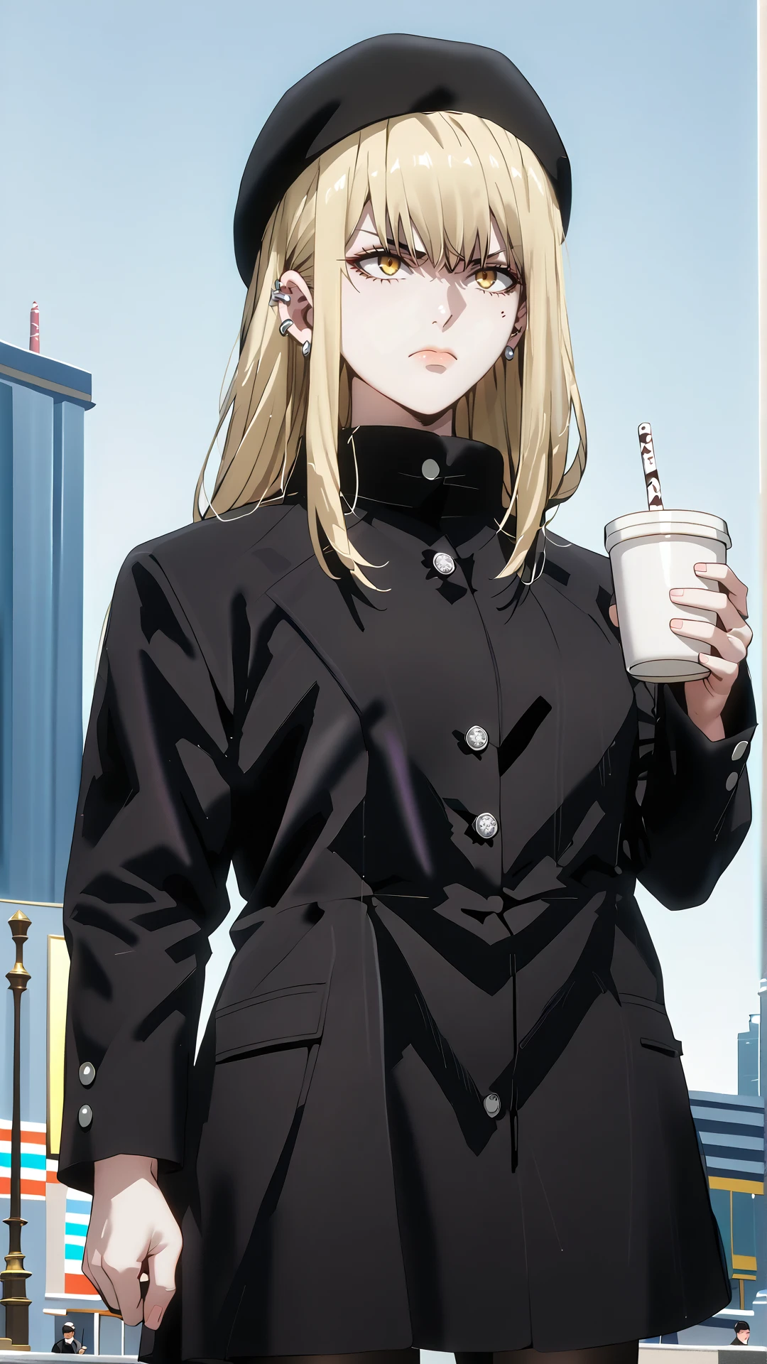 black hat, beret hat, black coat, black pantyhose, earrings, ear piercing,