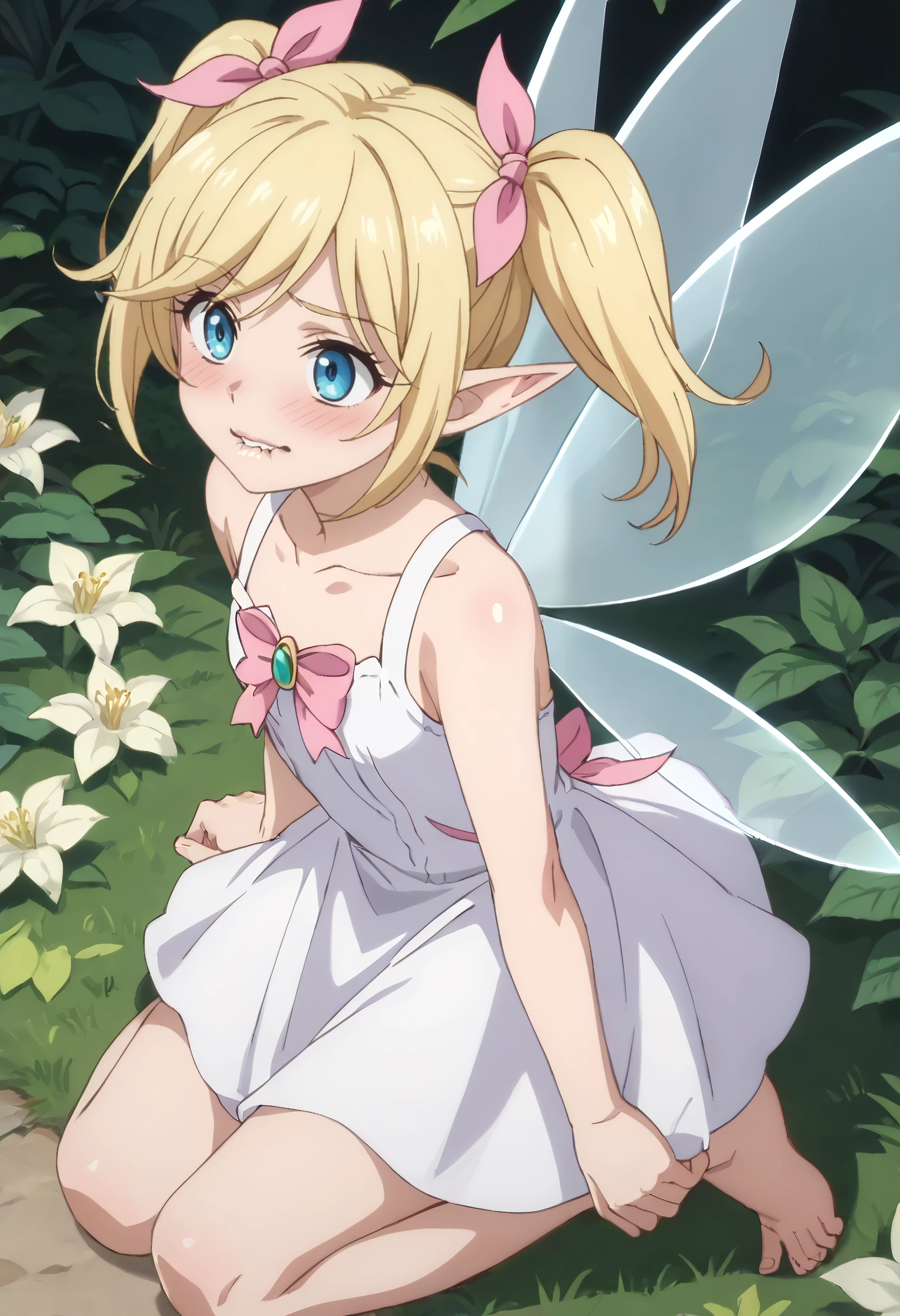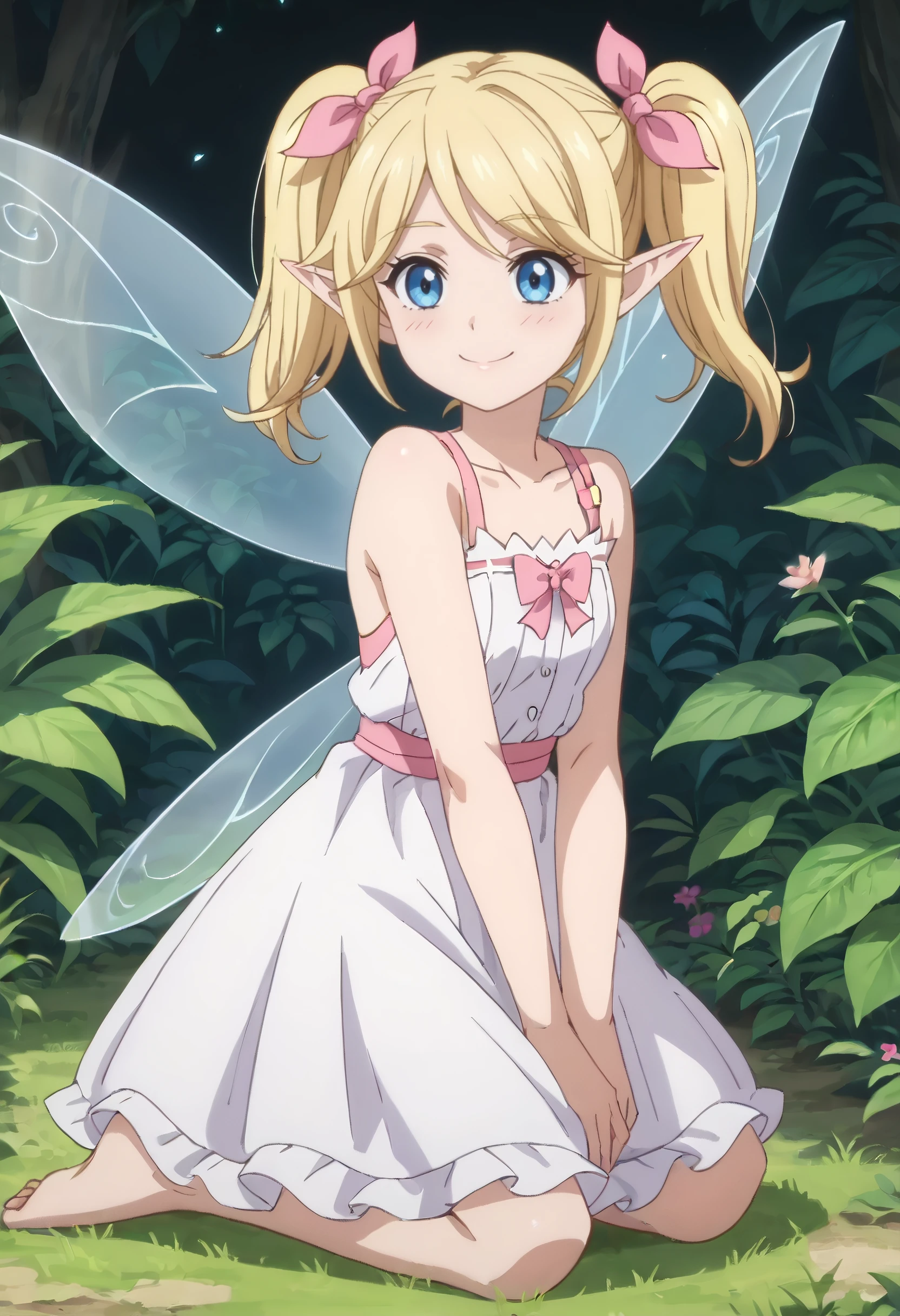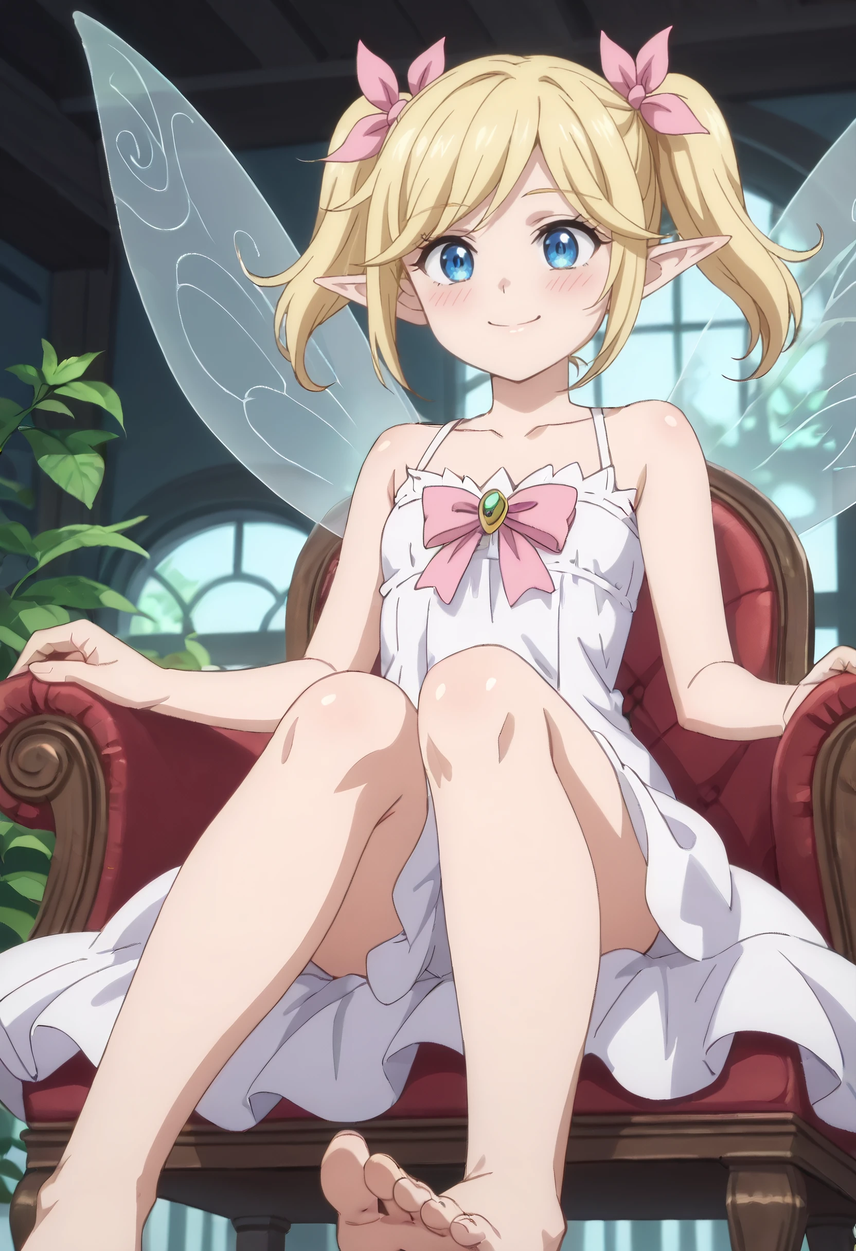 SusieFairy, bare shoulders, dress, white dress, bow, collarbone, hair bow, hair ribbon, pink bow, pink ribbon, sleeveless, sleeveless dress, swept bangs, backless dress, barefoot, fairy, fairy wings, transparent wings, wings,