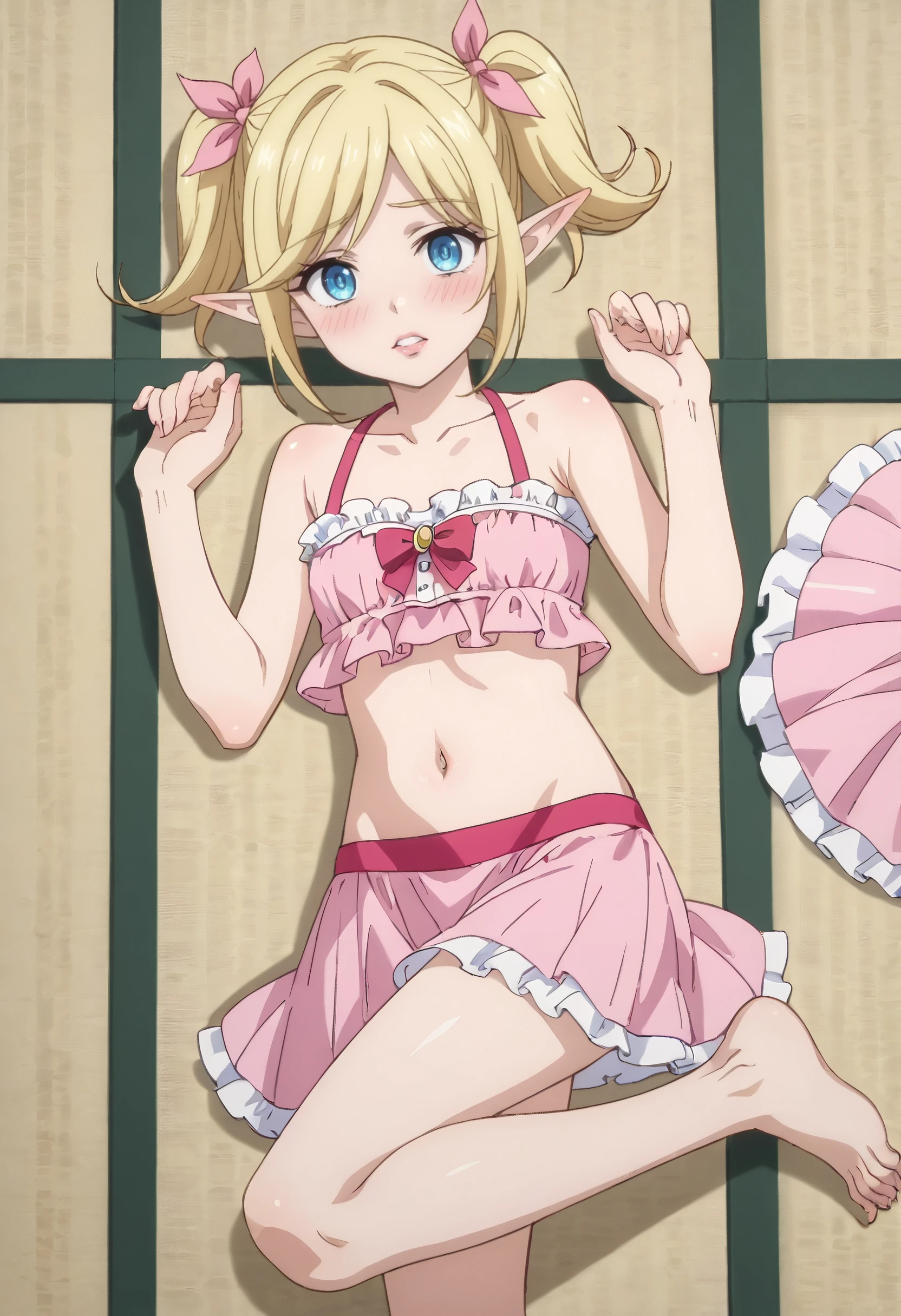 SusieBeach, pink shirt, pink bow, pink dress, pink ribbon, hair ribbon, ribbon, bare shoulders, pink bikini, barefoot, tatami, collarbone, swimsuit, dress, bow, navel, pink skirt, skirt, pink swimsuit, frills,