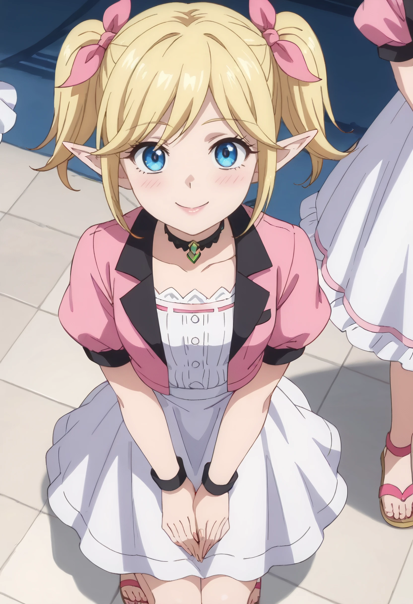 SusieSkirt, pink shirt, pink bow, bow, ribbon, hair ribbon, jewelry, pink ribbon, puffy sleeves, short sleeves, choker, hair bow, pink dress, dress, puffy short sleeves, collarbone, necklace, bangs, white skirt, sandals, pink jacket, skirt, shirt, black choker,