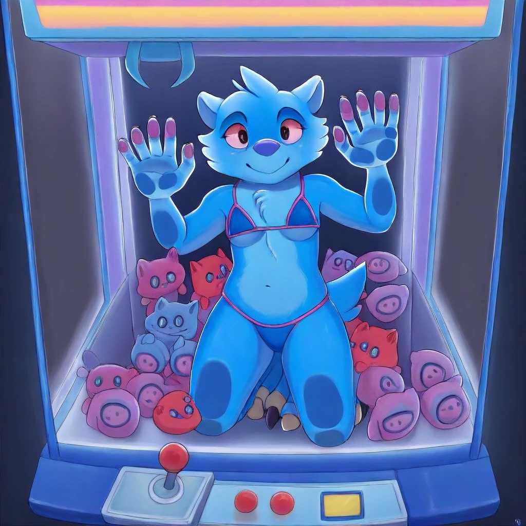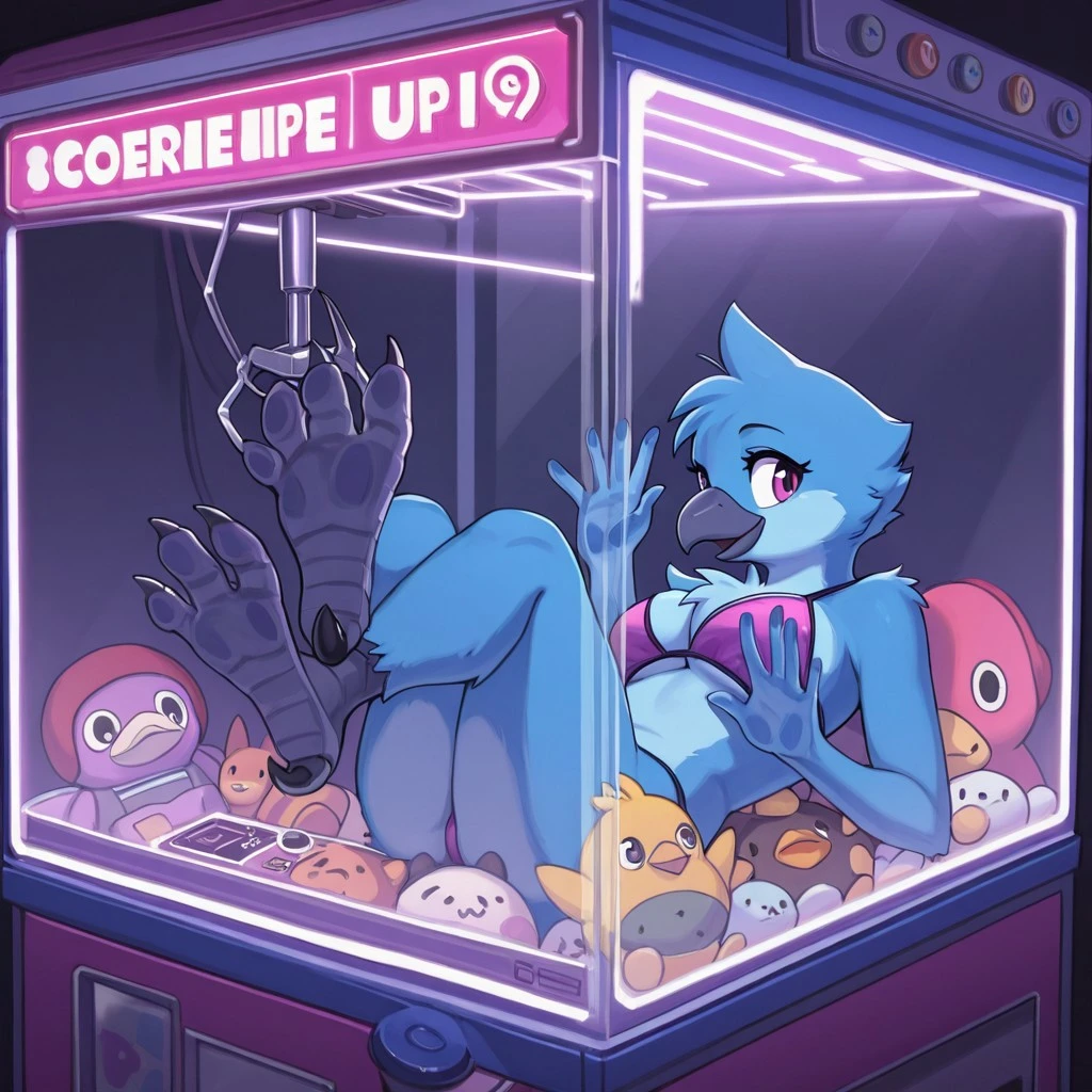 Inside a claw machine, surrounded by Stuffed Toys, glass, claw(Machine),