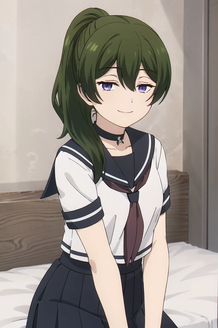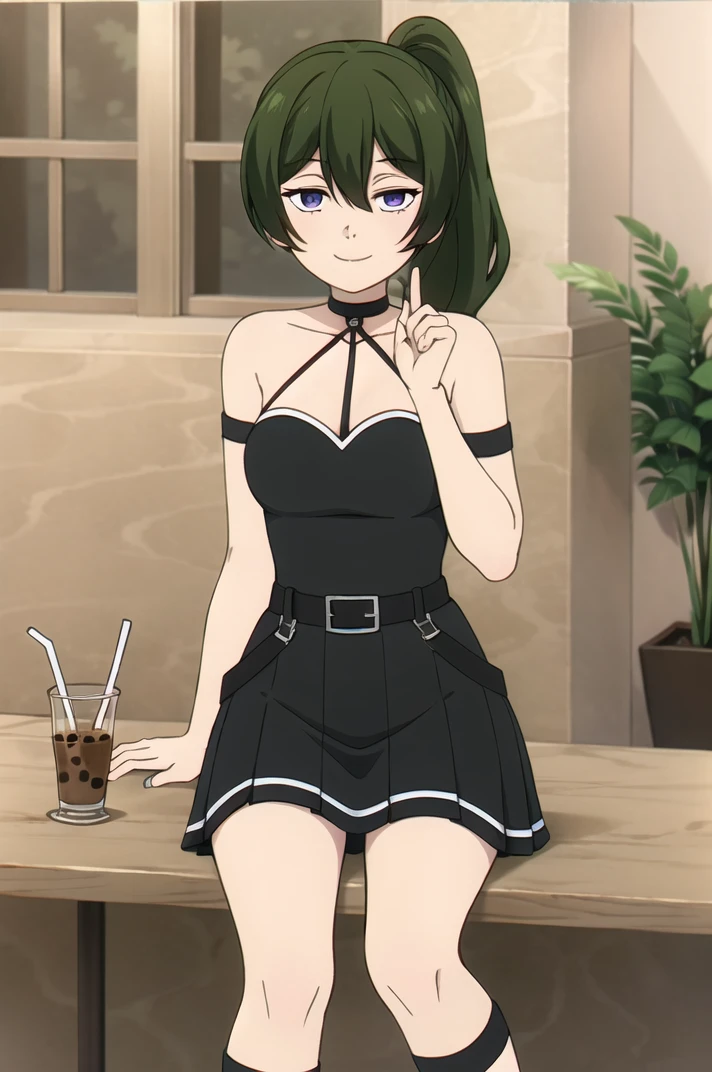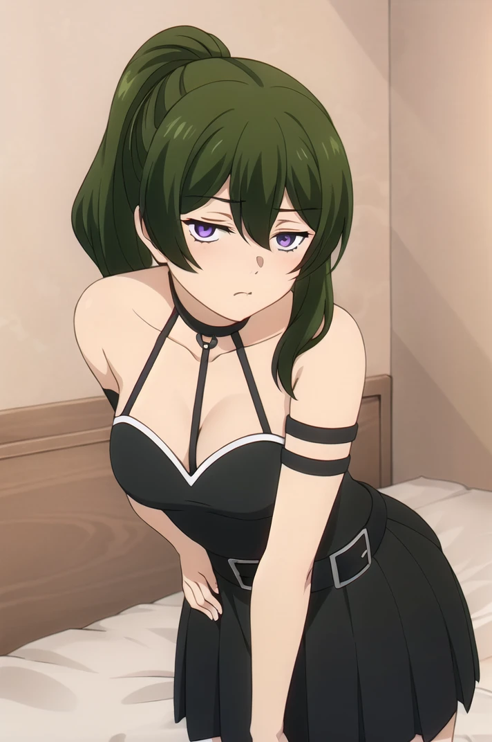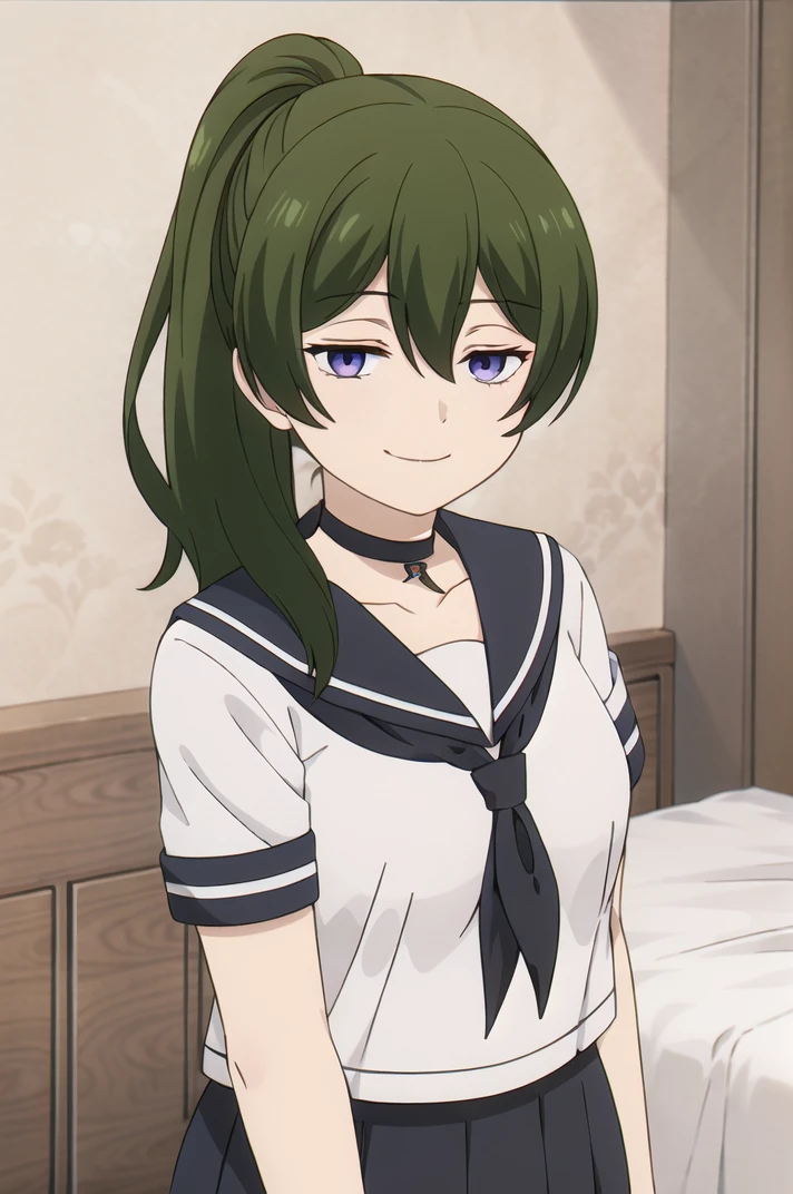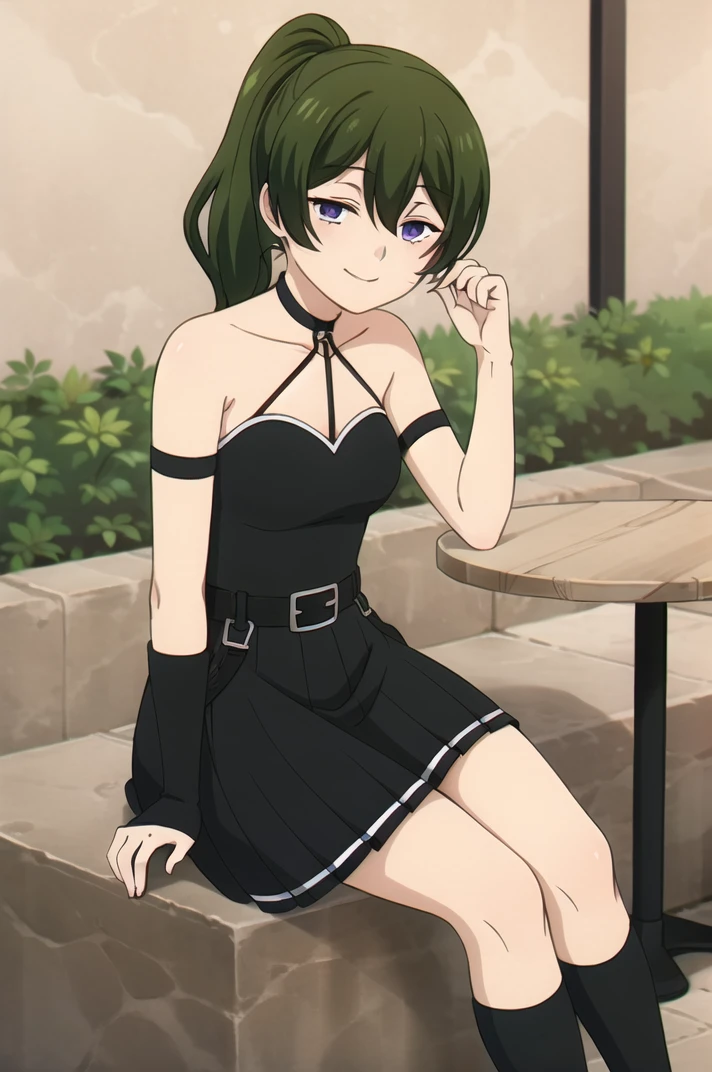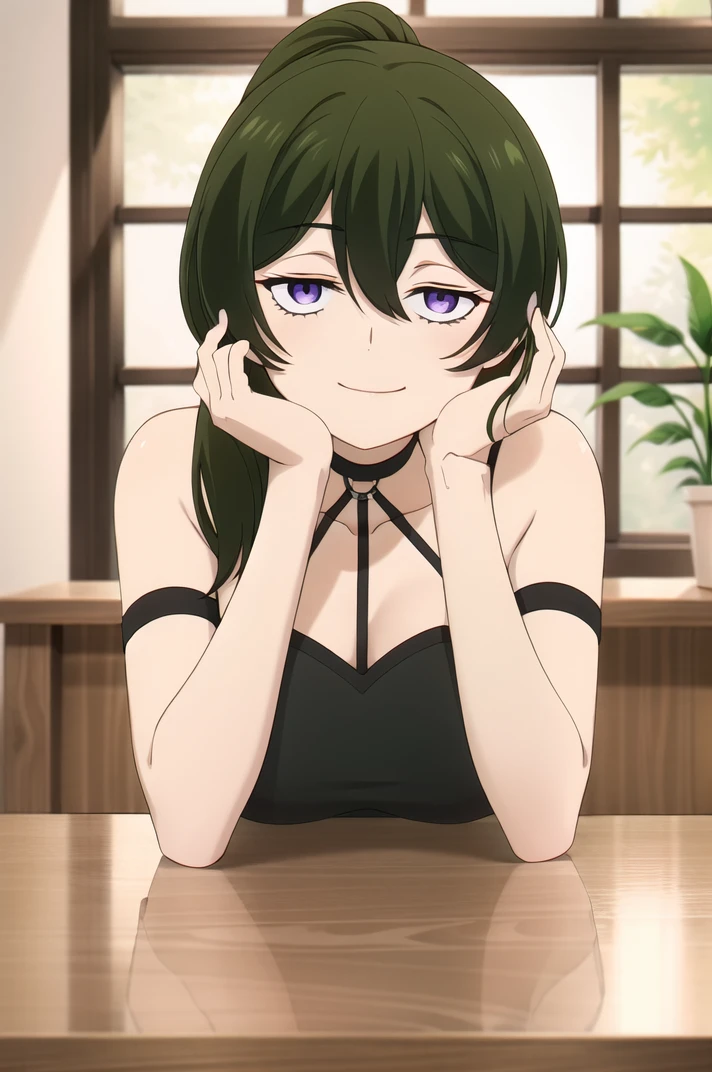 <lora:Ubel-v1-06:0.6>, ChopioUbel, long hair, green hair, high ponytail, side ponytail, hair between eyes, half-closed eyes, purple eyes, (looking at viewer:1.3),Outfit 1 (Default Outfit):