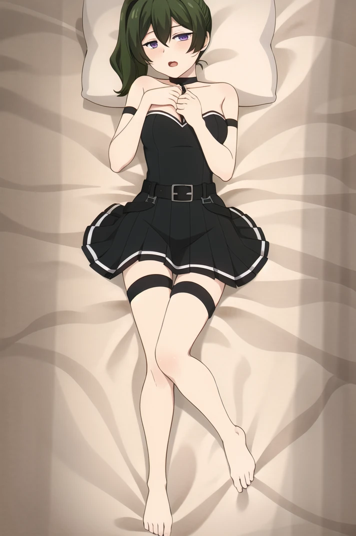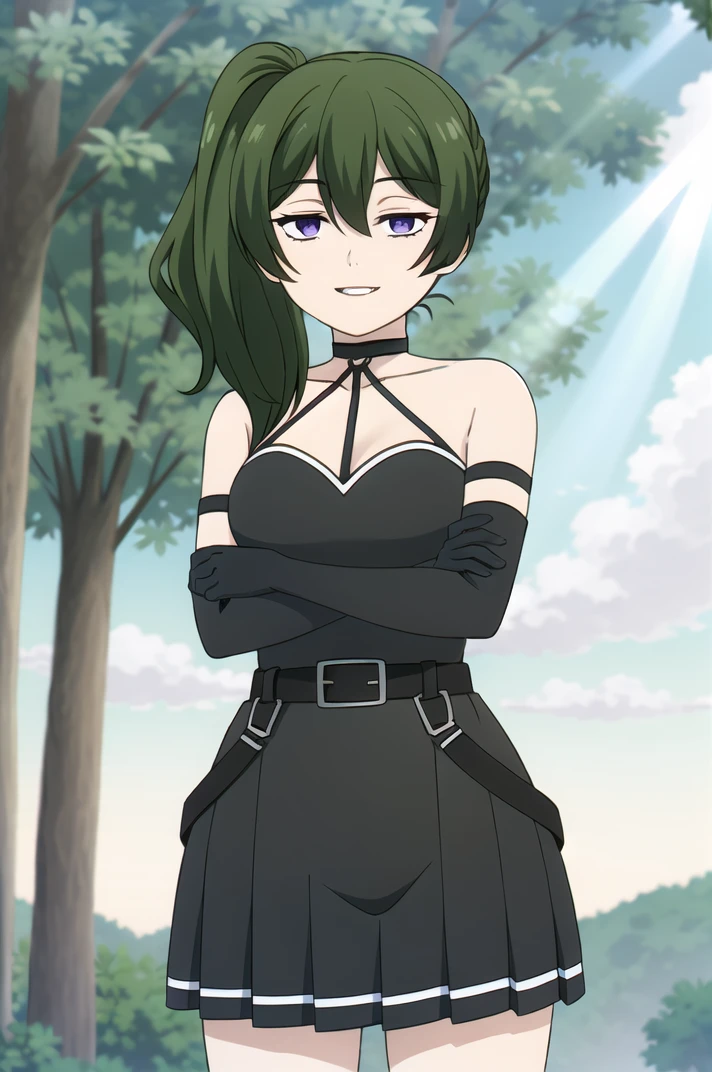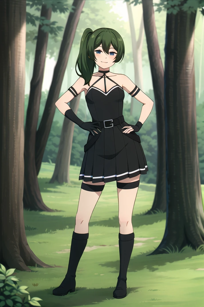 outfit_1, choker, black dress, pleated dress, sleeveless dress, bare shoulders, single elbow glove, armlet, arm strap, belt, thigh strap, knee boots, black footwear,Description