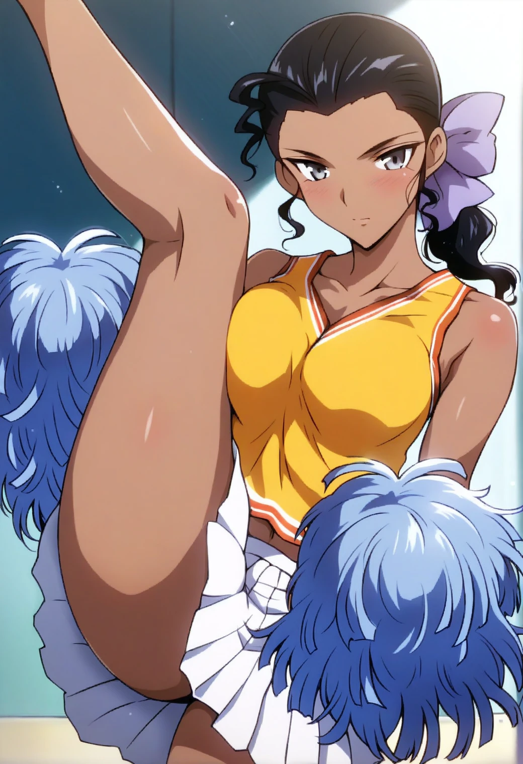 lala gonzalez, solo, hair bow, purple bow, sidelocks, low ponytail, wavy hair, hair slicked back, black hair, dark-skinned female, black eyes, grey eyes, loose hair strand
