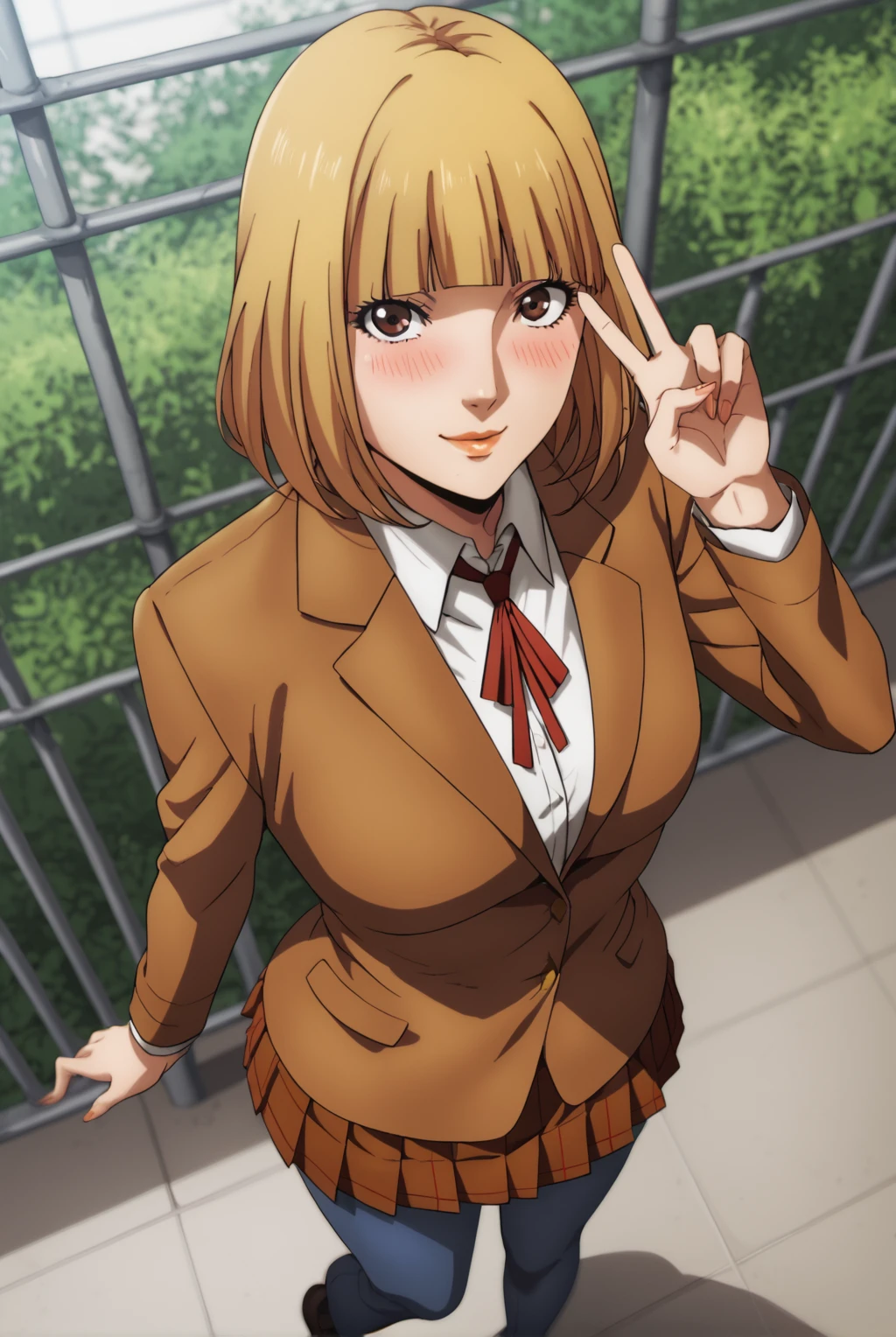 red neck ribbon, school uniform, pleated skirt, brown jacket, brown skirt, pants, short blue pants, shoes