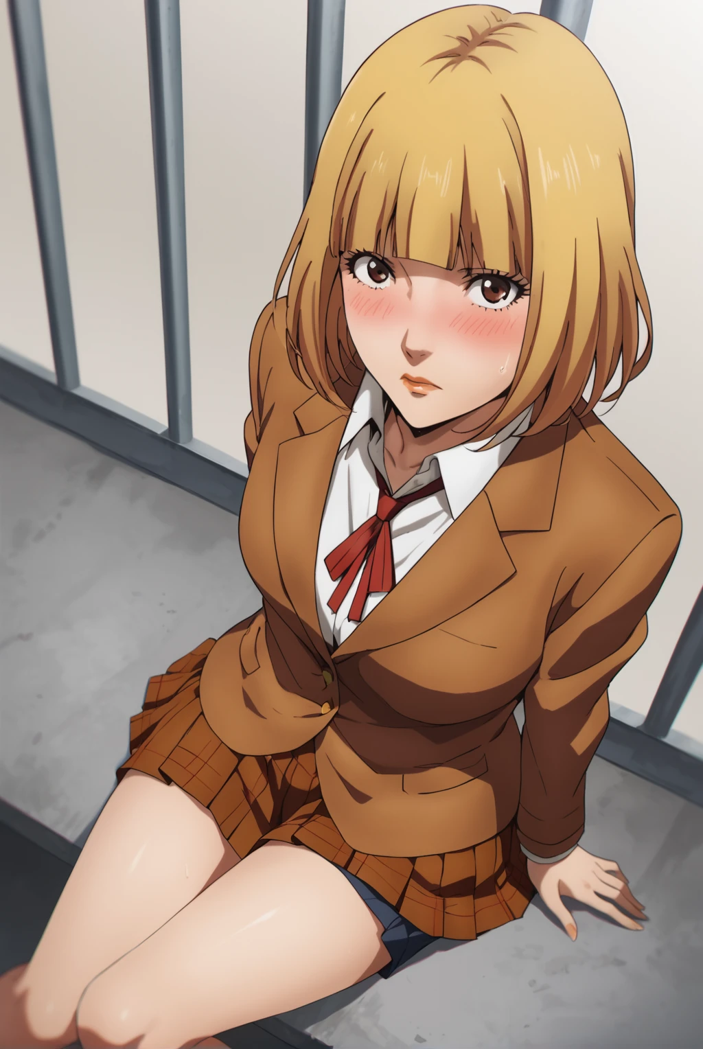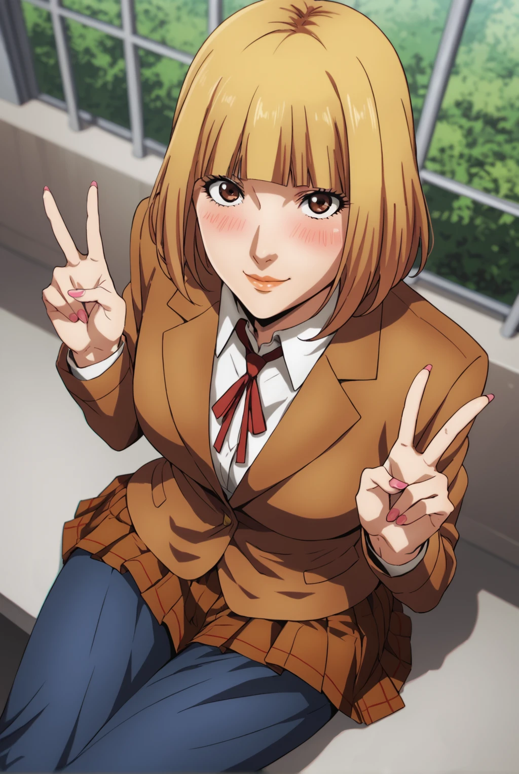 short hair, skirt, bob cut, blonde hair, brown eyes
