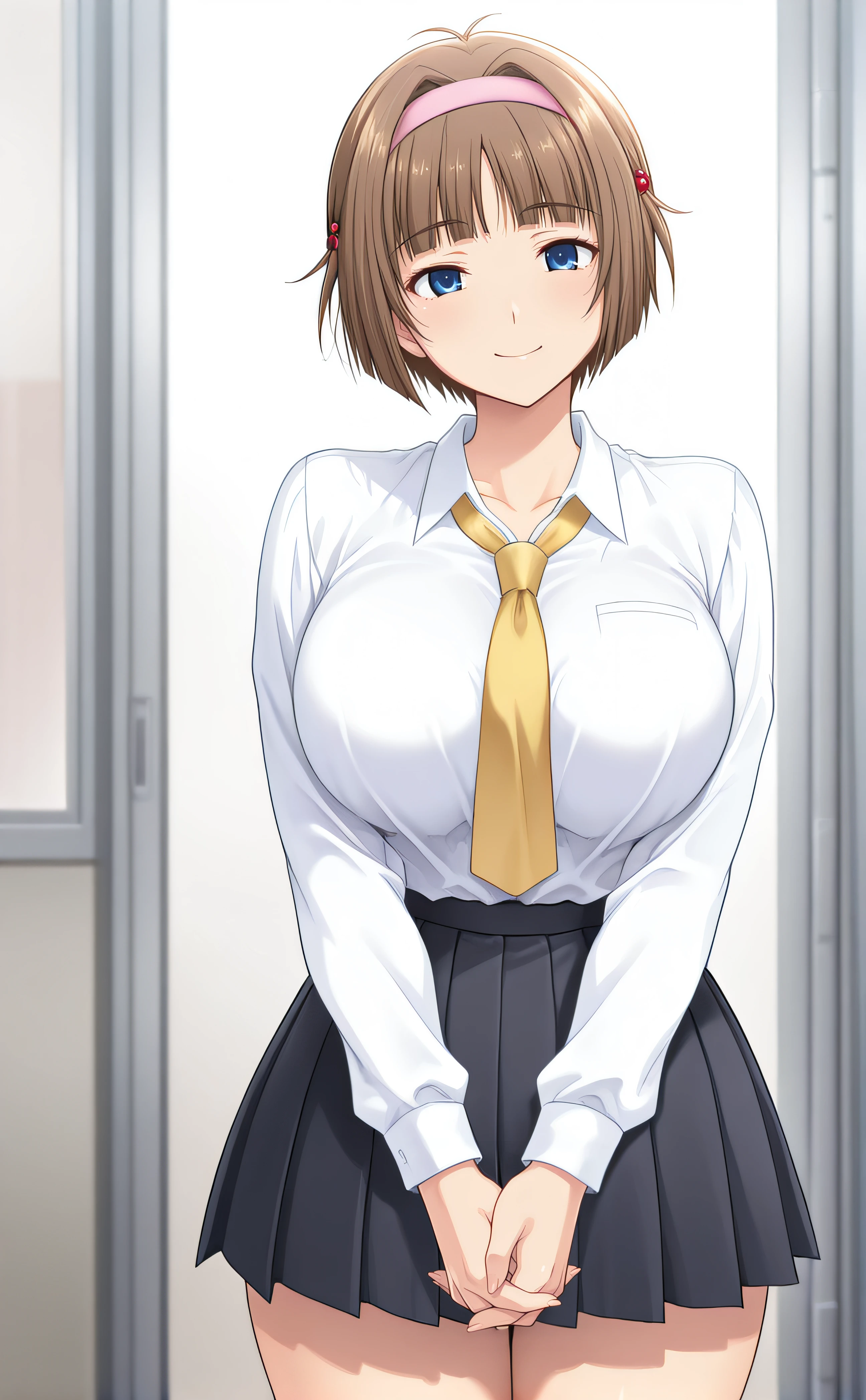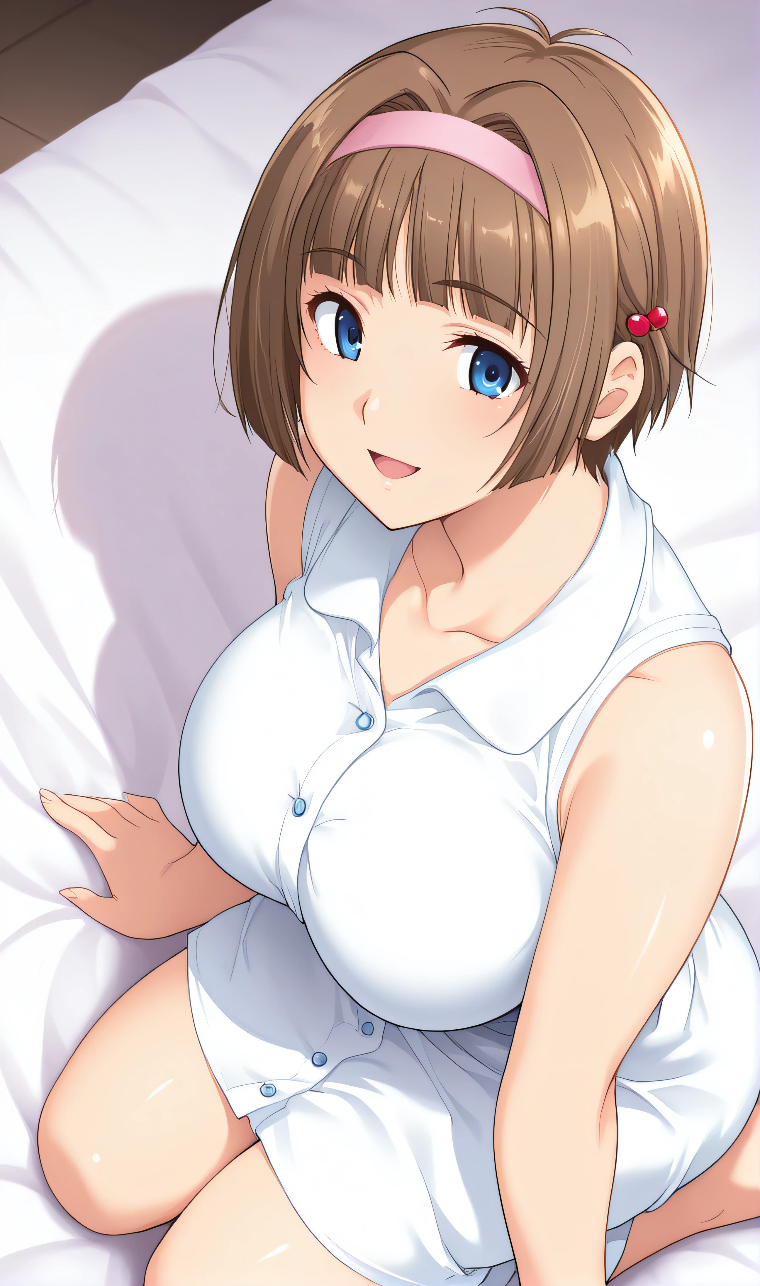 akiha, brown hair, short hair, pink hairband, hair ornament, blue eyes, large breasts
