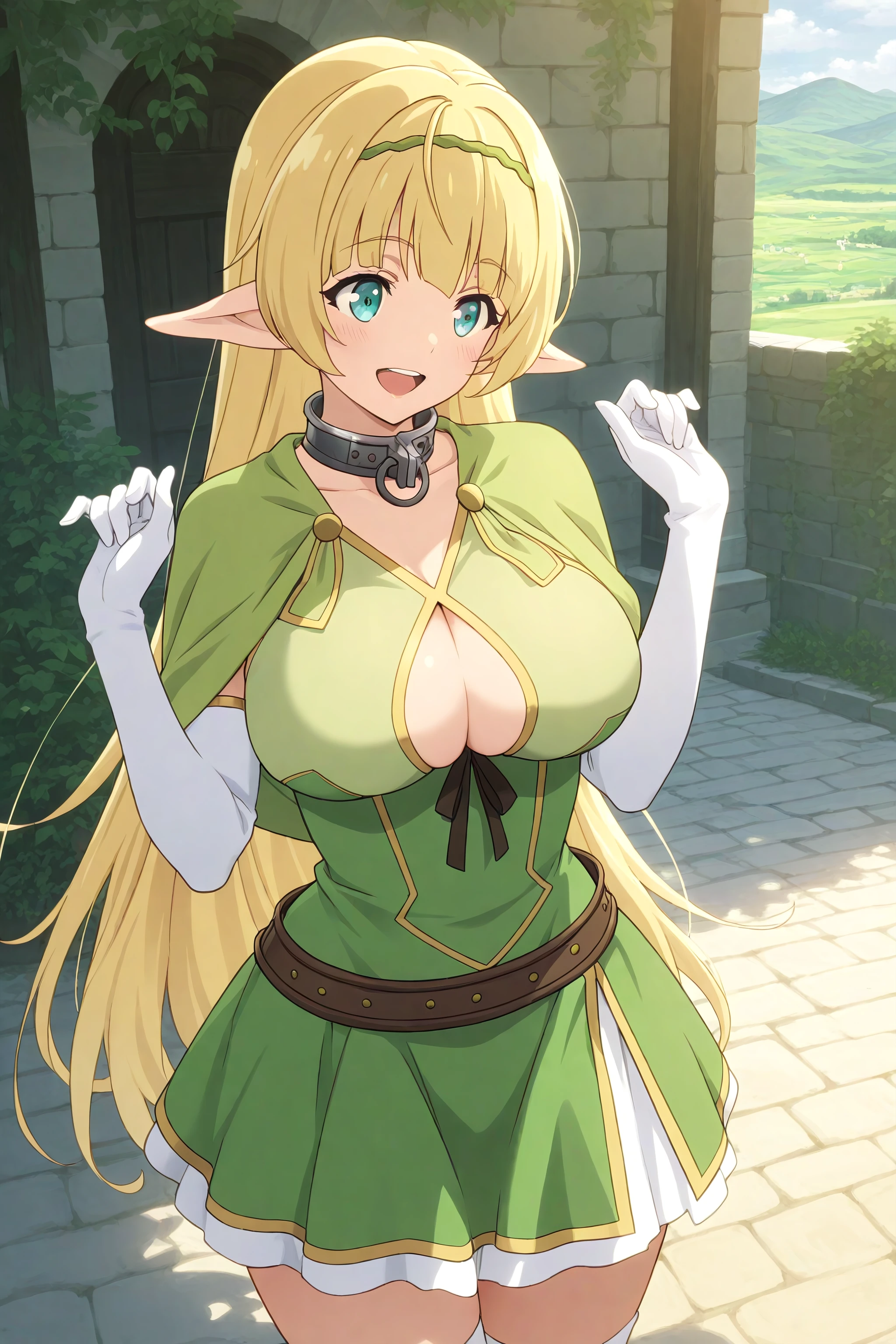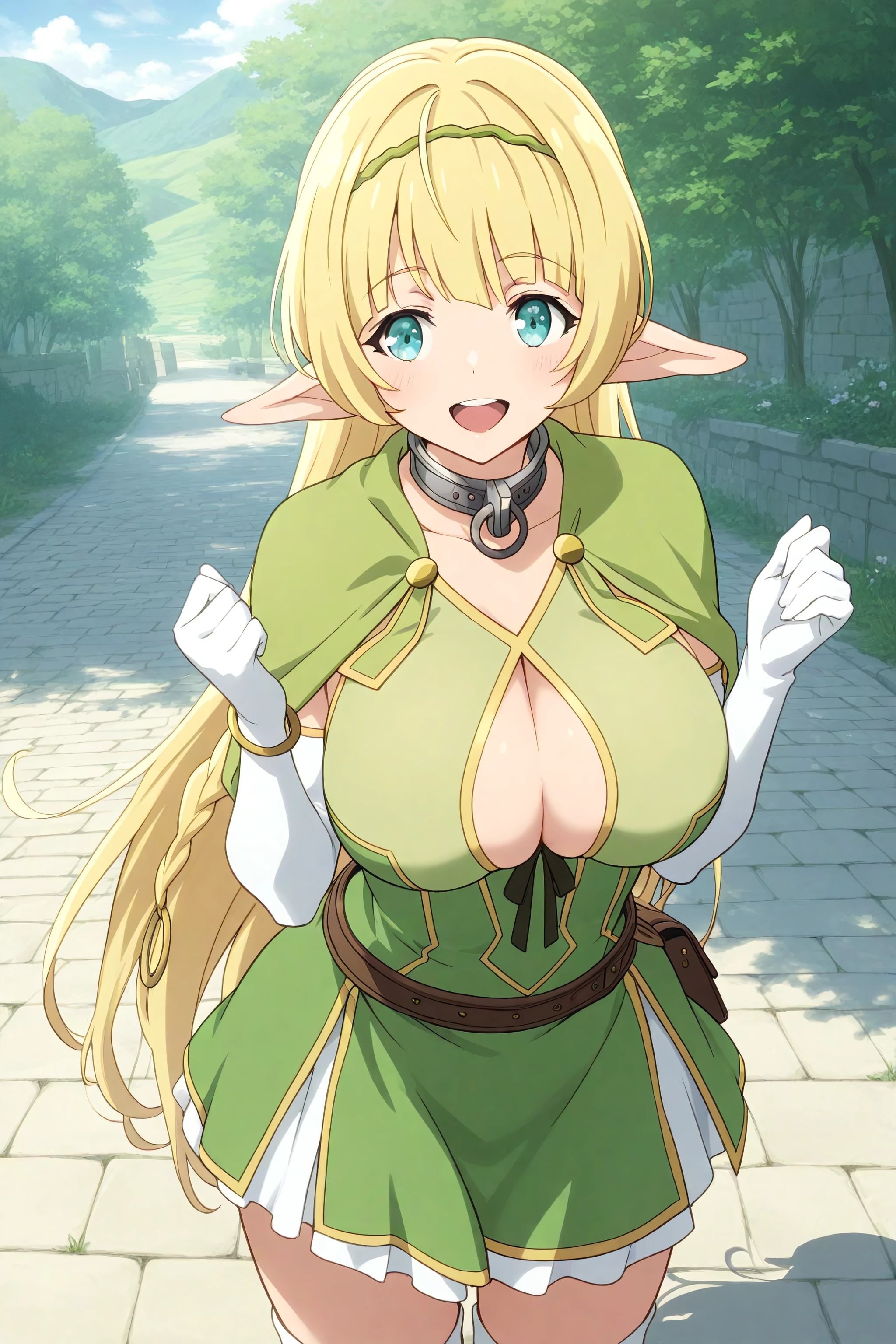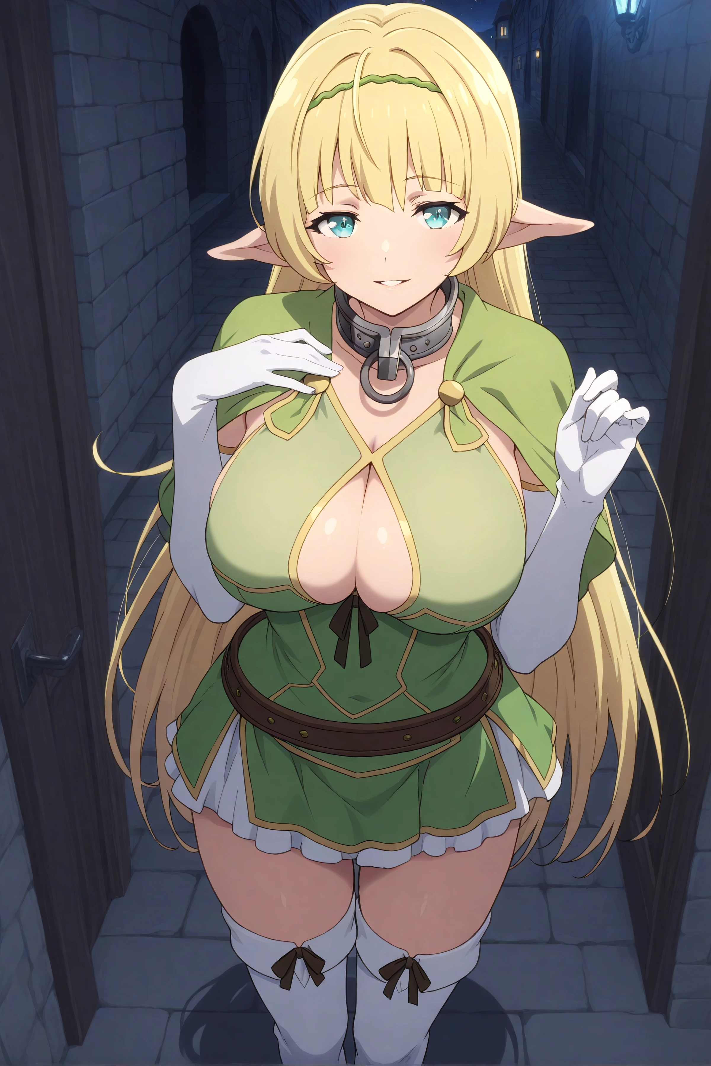 shera_l_greenwood, baseoutfit, 1girl, gloves, large breasts, elbow gloves, thighhighs, pointy ears, boots, blonde hair, white gloves, long hair, thigh boots, blue eyes, green dress, metal collar