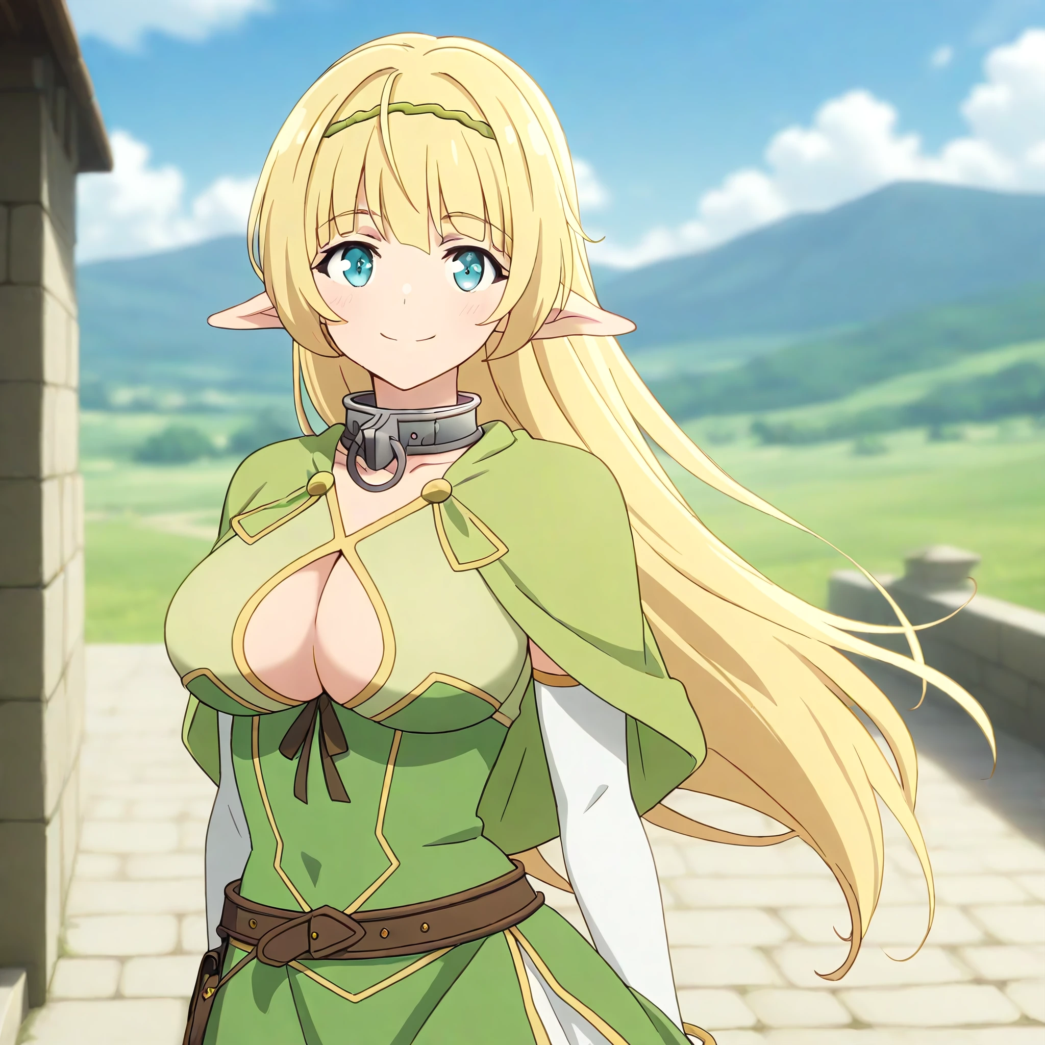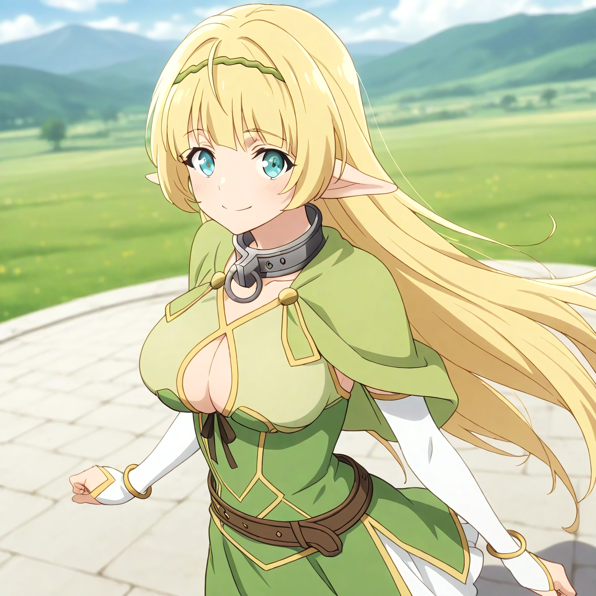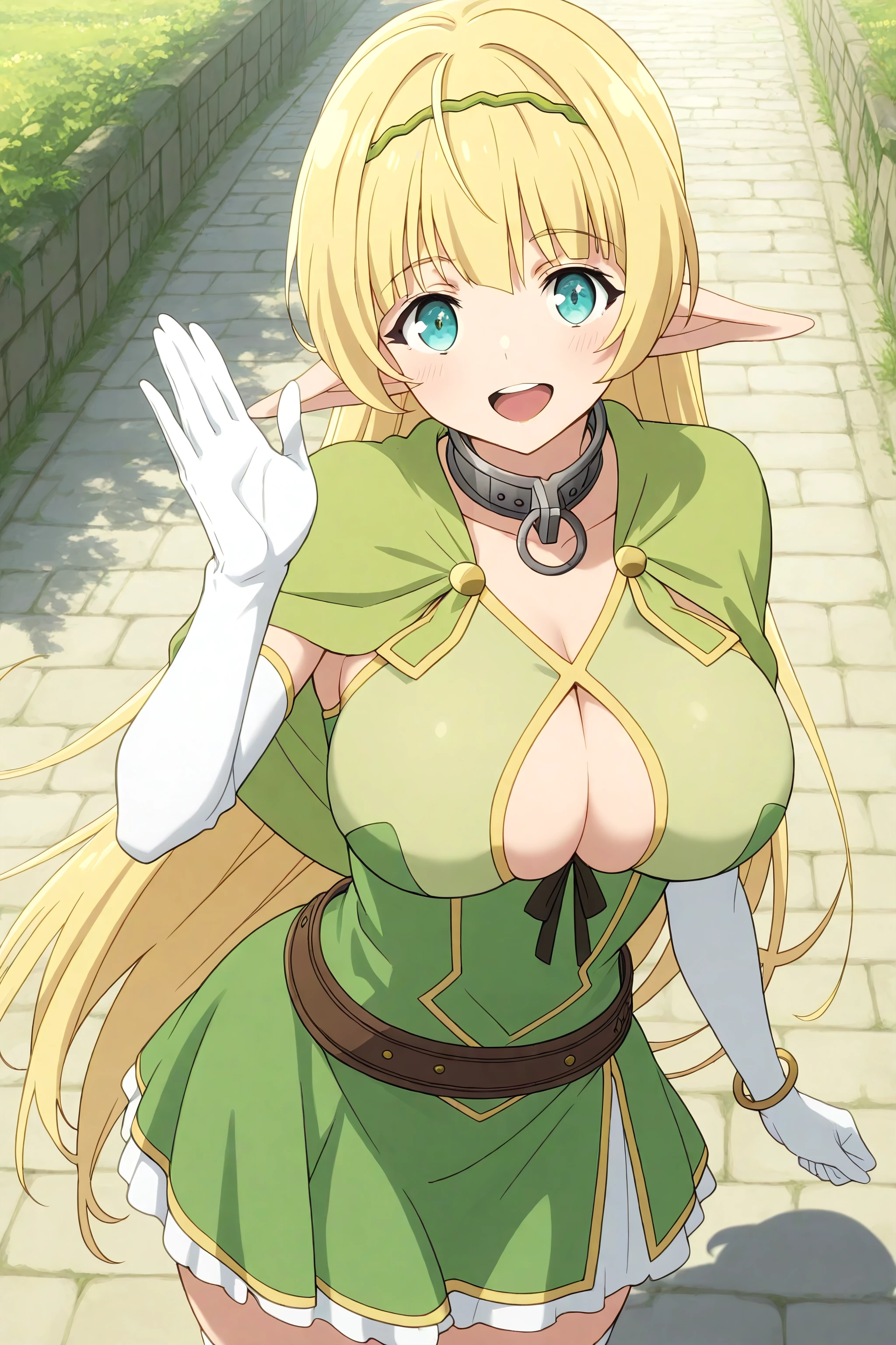 shera_l_greenwood, indooroutfit, 1girl, pointy ears, blonde hair, metal collar, long hair, hairband, elf, long hair, blonde hair, large breasts, cleavage, collar, collarbone, no bra, tank top, downblouse, green shirt,