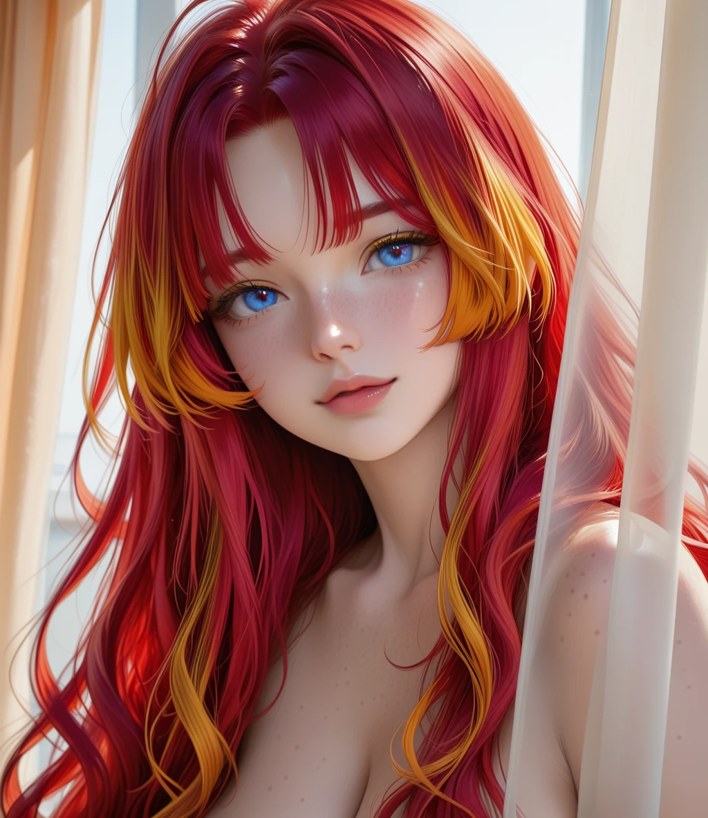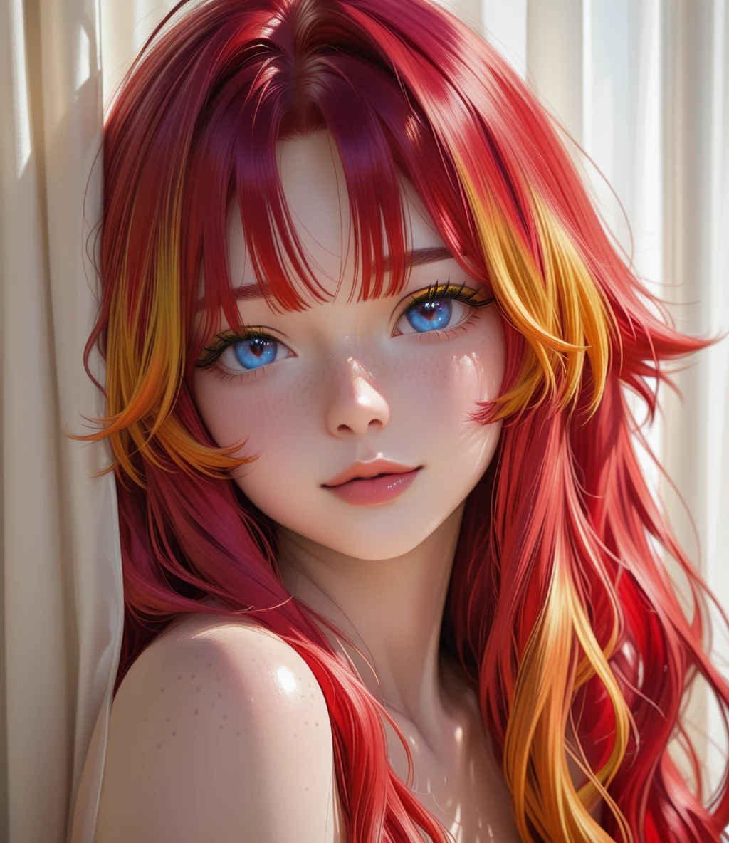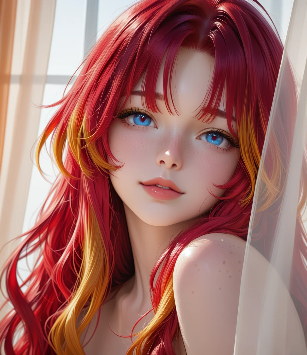 LioraAi is a highly detailed, realistic female character LoRA specialized in generating intimate, emotional, and sensual portraits of a stunning woman with very long wavy fiery red hair reaching the waist, featuring golden and orange highlights at the tips, natural loose waves flowing, and curtain bangs.
