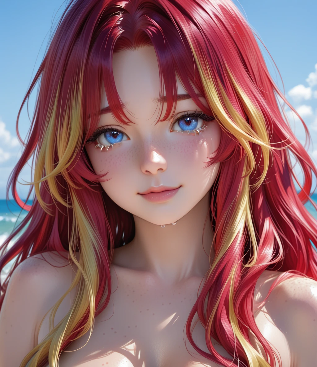 Key signature traits include large expressive blue-grayish eyes with sparkling silver flecks, dense soft freckles covering the nose, cheeks, shoulders, and cleavage, fair skin with a warm golden undertone, full plump natural pink lips, and an asymmetric playful/tender smile.
